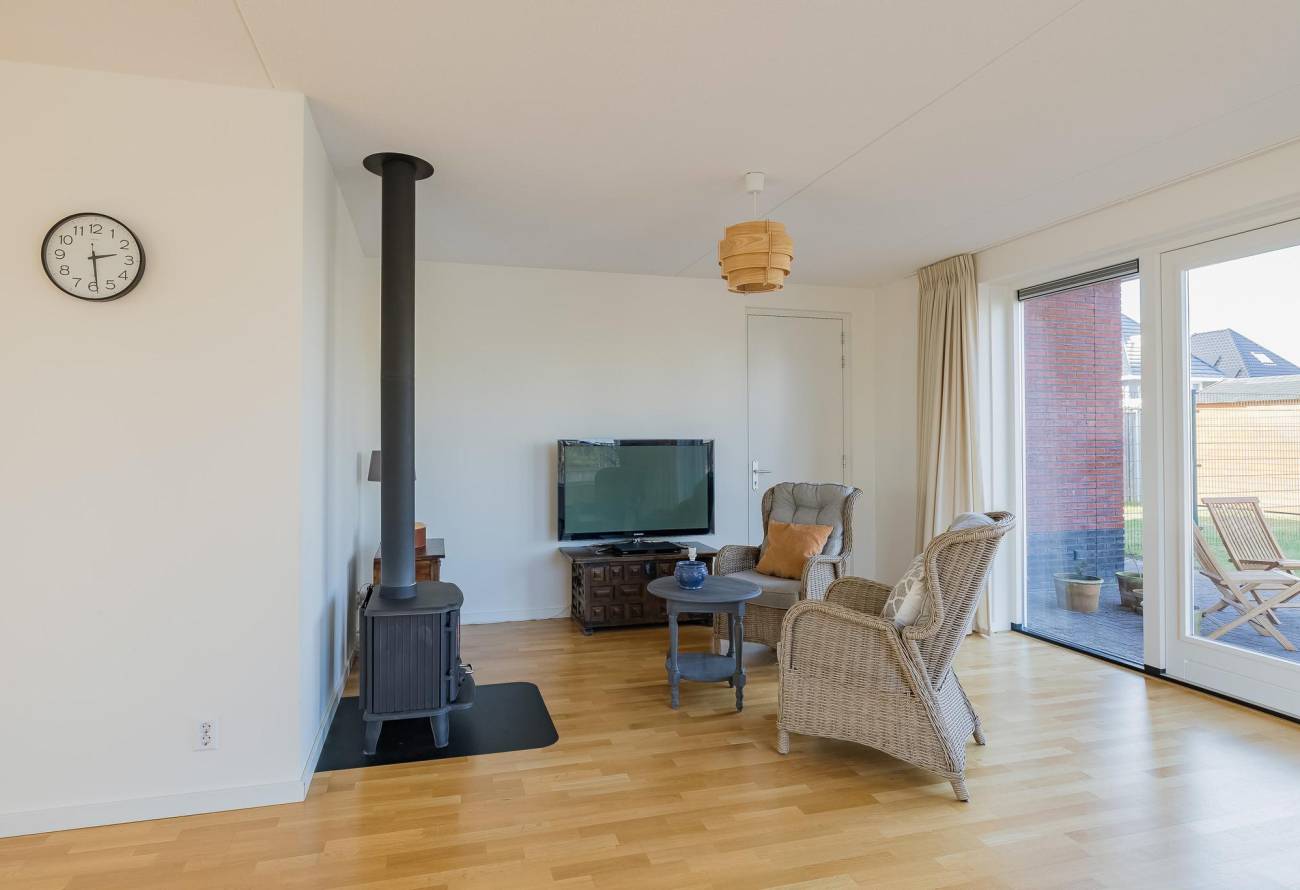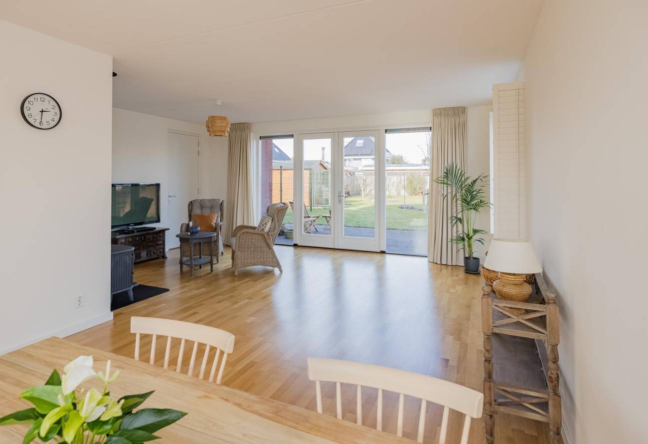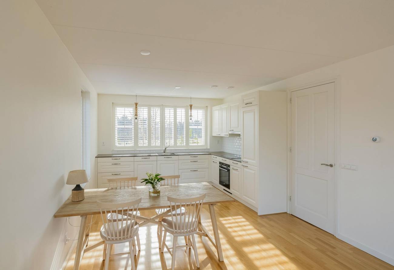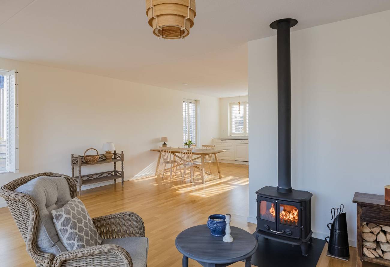 Via de entree stap je binnen in de ruime hal met toilet, meterkast en trap naar boven. De lichte en sfeervolle living heeft een open haard, een open keuken en openslaande deuren naar het terras en de tuin. De moderne keuken in L-opstelling is voorzien van hoogwaardige inbouwapparatuur. De gehele begane grond heeft vloerverwarming voor extra comfort.