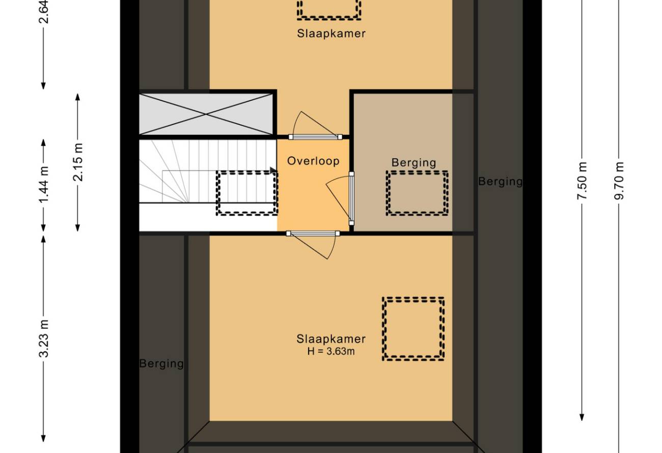 De tweede etage beschikt over nog eens twee slaapkamers, beide met dakramen, en extra bergruimte.