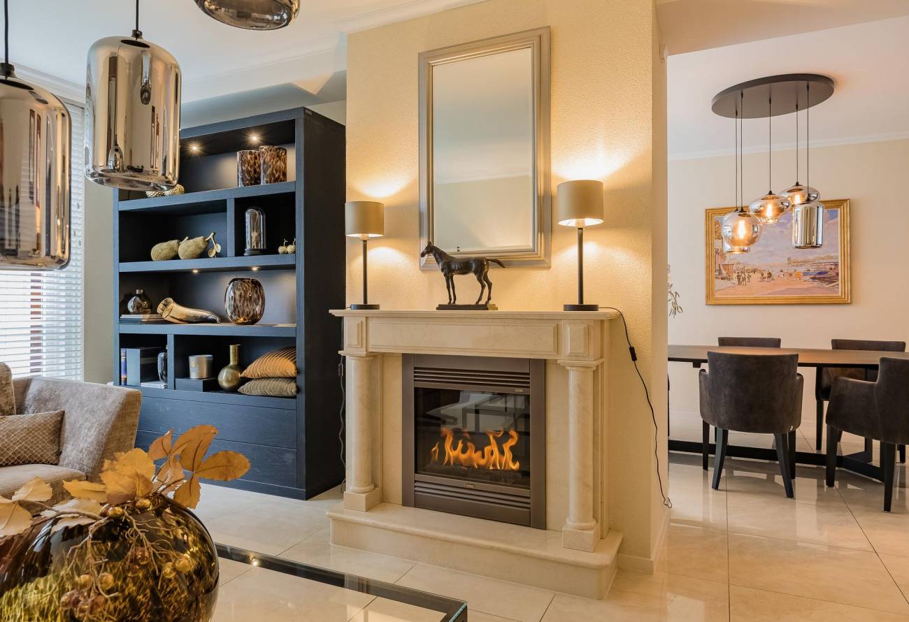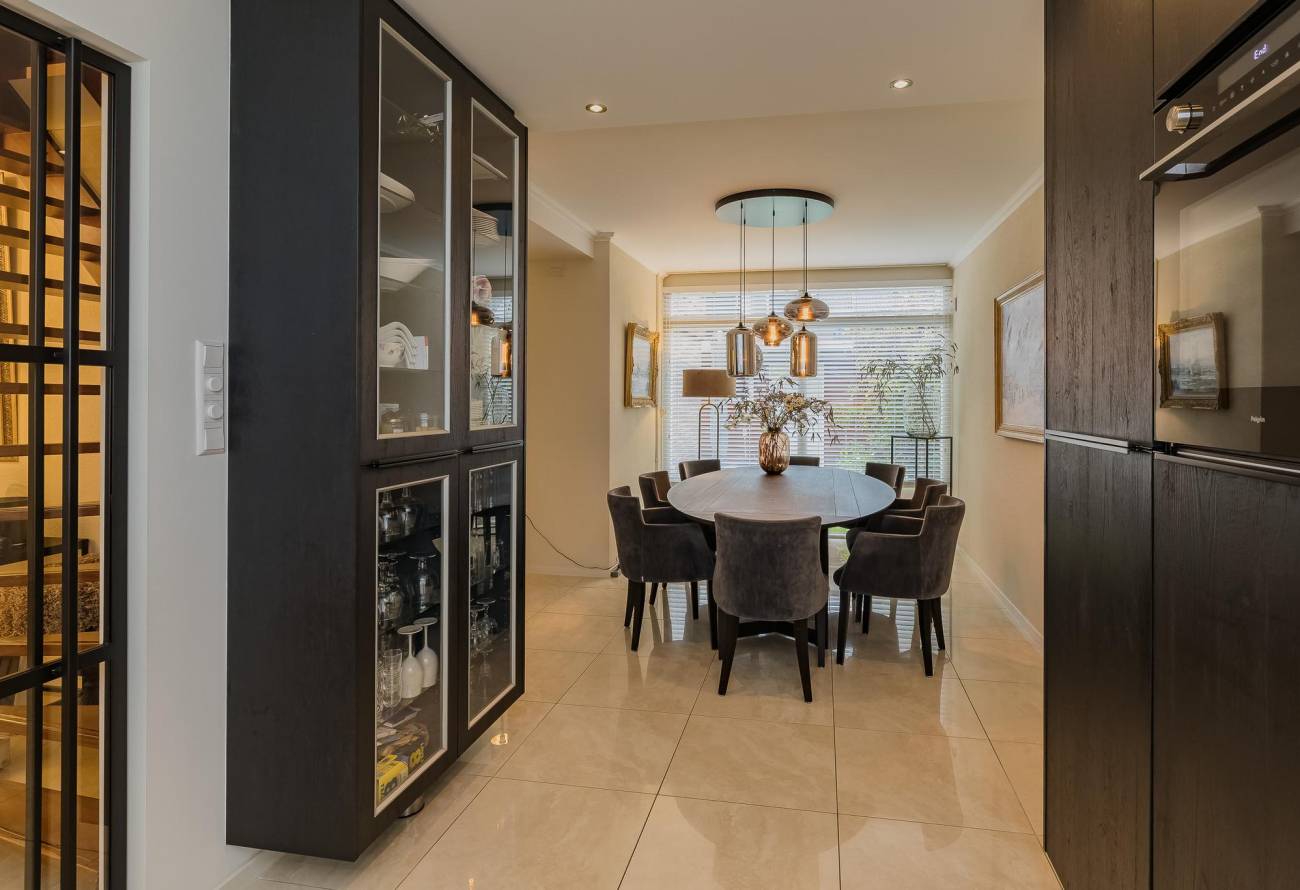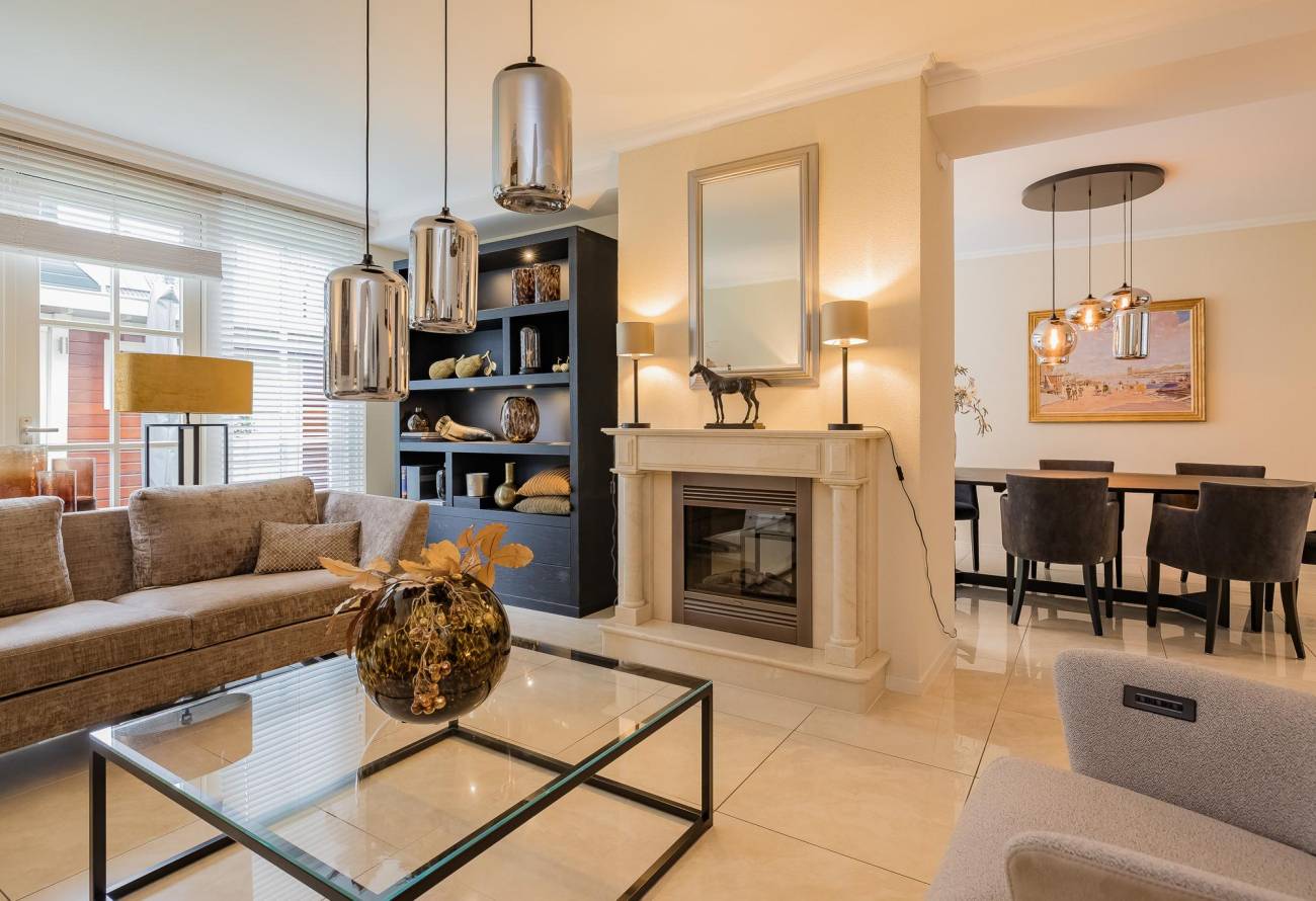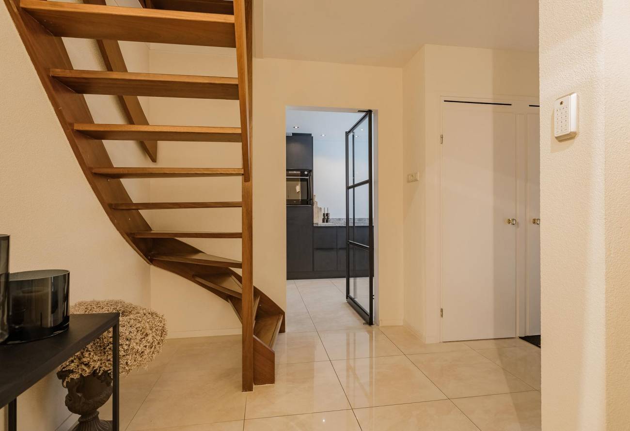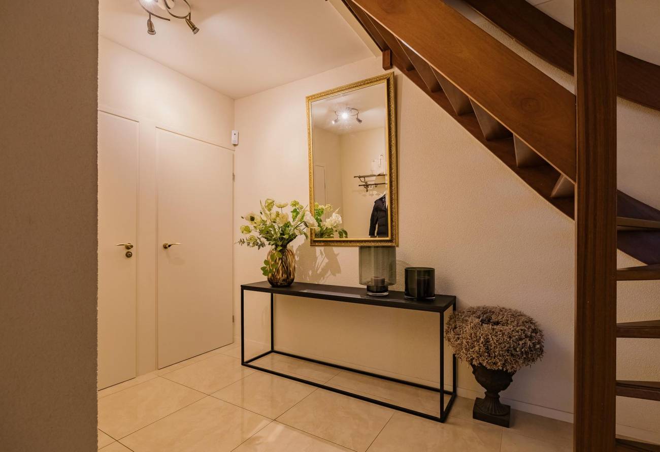 Bij binnenkomst in de stijlvolle entree voel je direct de warmte van deze woning. De begane grond is ruim en is geheel voorzien van een mooie lichte tegelvloer met vloerverwarming. Via een fraaie taatsdeur kom je allereerst in de keuken met eetkamer. Deze moderne, luxe open keuken (2023) in L-opstelling is voorzien van stijlvolle zwarte accenten en alle benodigde inbouwapparatuur. Aangrenzend kom je in de sfeervolle woonkamer waar je geniet van een strakke open haard, perfect voor gezellige avonden en via openslaande deuren loop je zo de zonnige tuin in.