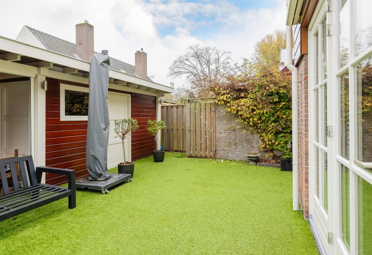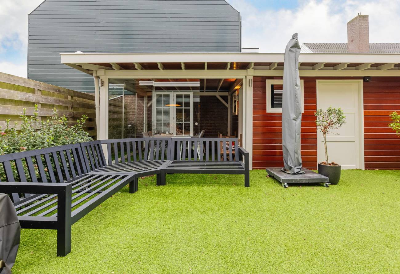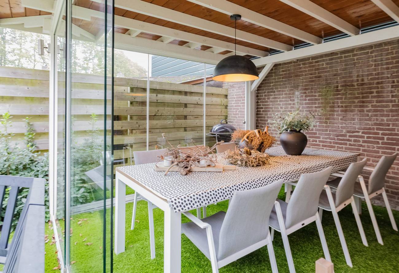 Een absolute troef van deze woning is de onderhoudsvriendelijke aangelegde achtertuin op het zuidoosten. Hier geniet je van veel privacy en een altijd groen blijvend gazon. De tuin beschikt bovendien over een royale berging met een sfeervolle serre/veranda. Hier kan je het hele jaar door heerlijk buiten eten, dankzij de schuifwanden die je kunt openen of sluiten naar wens.