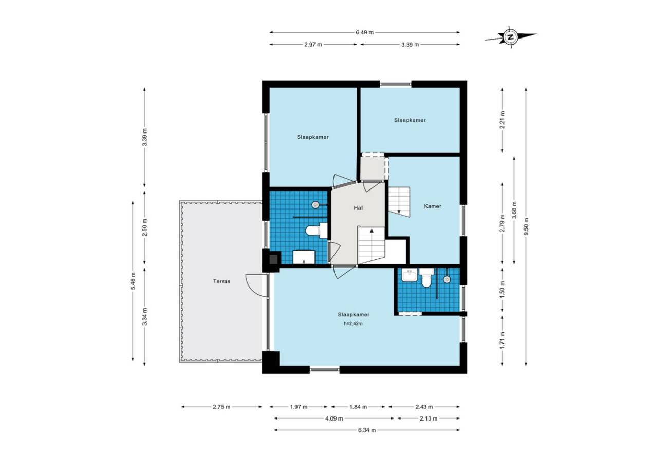 | Badkamers | 2 badkamers, 1 aparte toiletten |