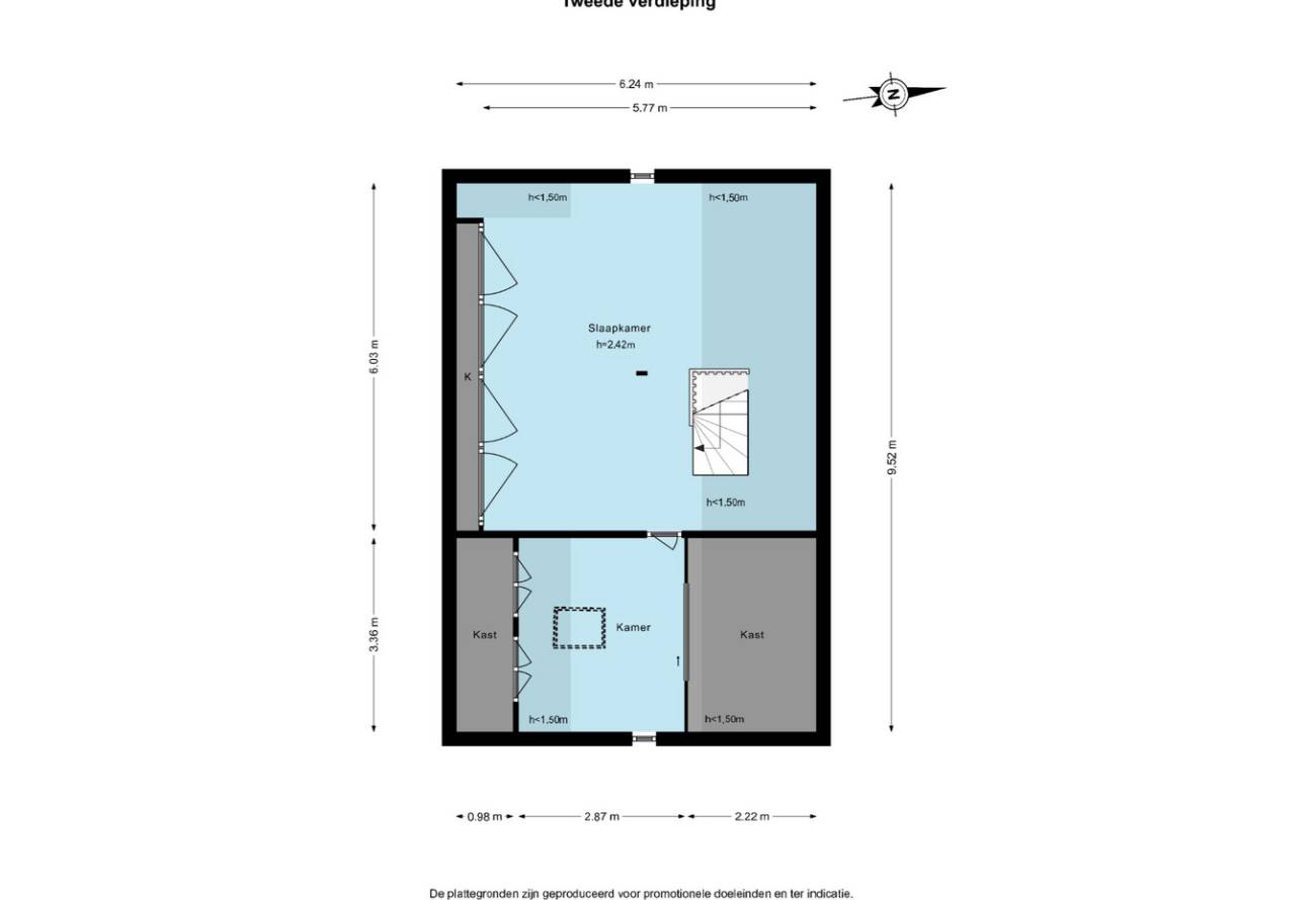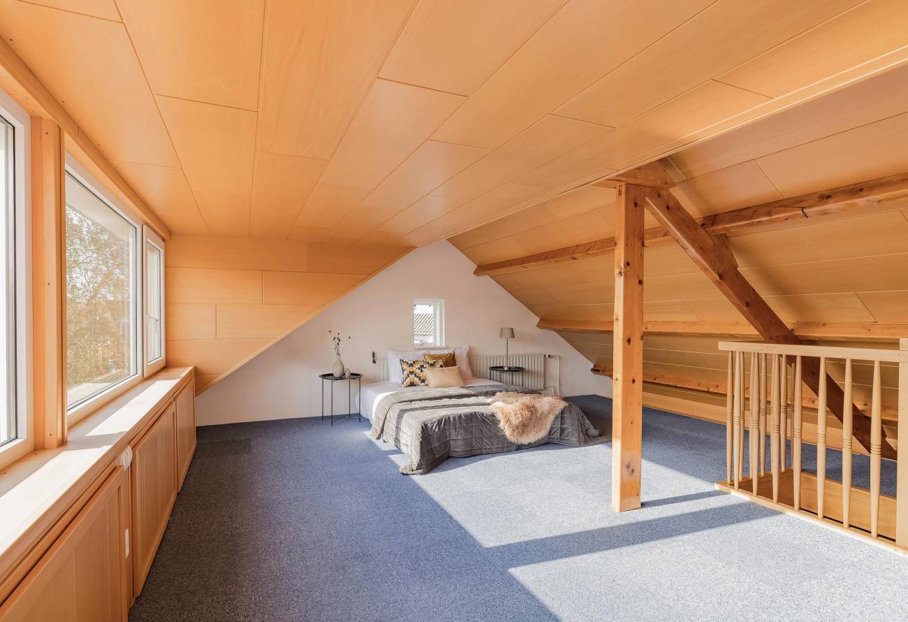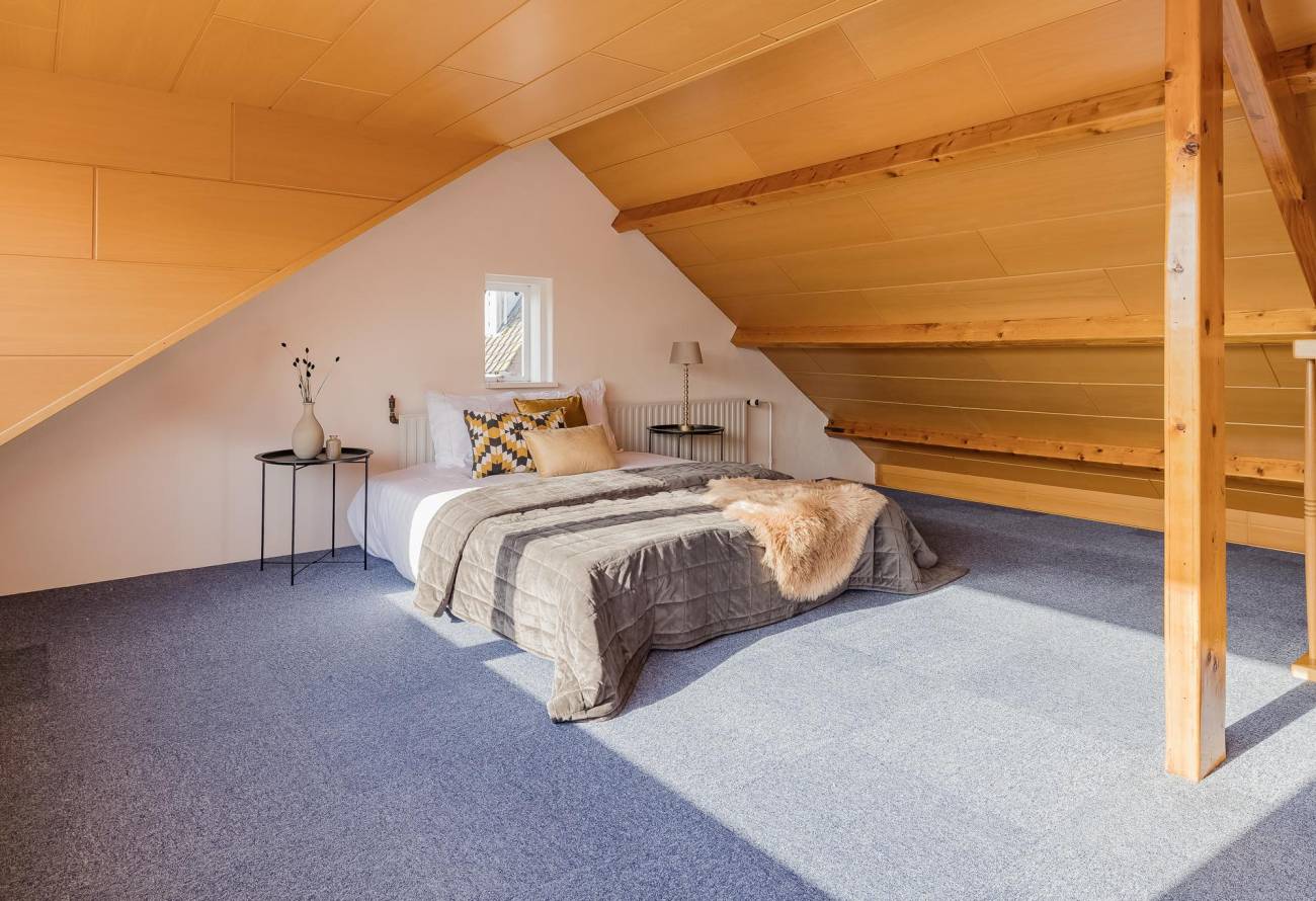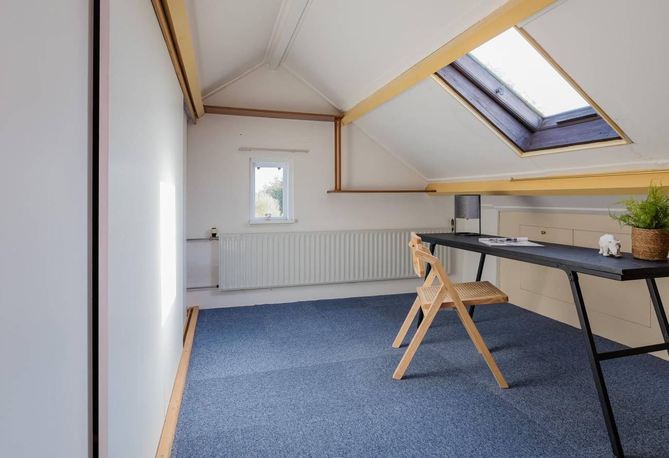 Vaste trap naar de fantastisch grote open zolderkamer met dakkapel en nog een slaapkamer. Er is hier veel opslagruimte onder de kap. Vanuit de zolderkamer heeft u fantastisch uitzicht over het water van de Kagerplassen.