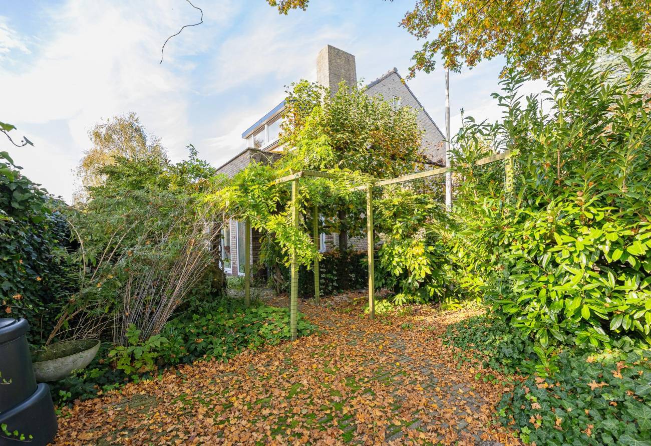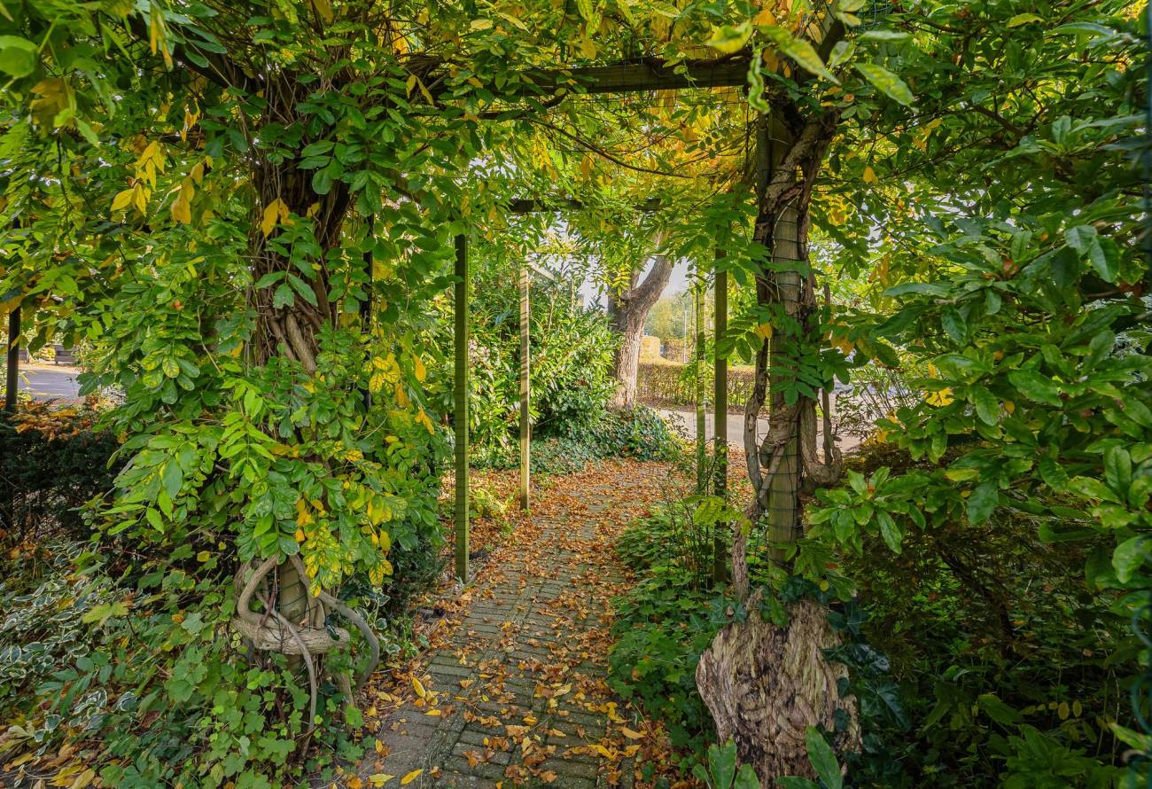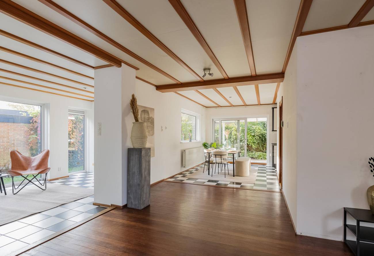 Entreehal met toiletruimte, garderobe, trap naar verdieping met keldertrapkast en deuren naar de zeer ruime berging, keuken en woonkamer. De uitgebouwde lichte woonkamer in L-vorm is voorzien van vloerverwarming. Ook is er heerlijk zicht op de tuin.