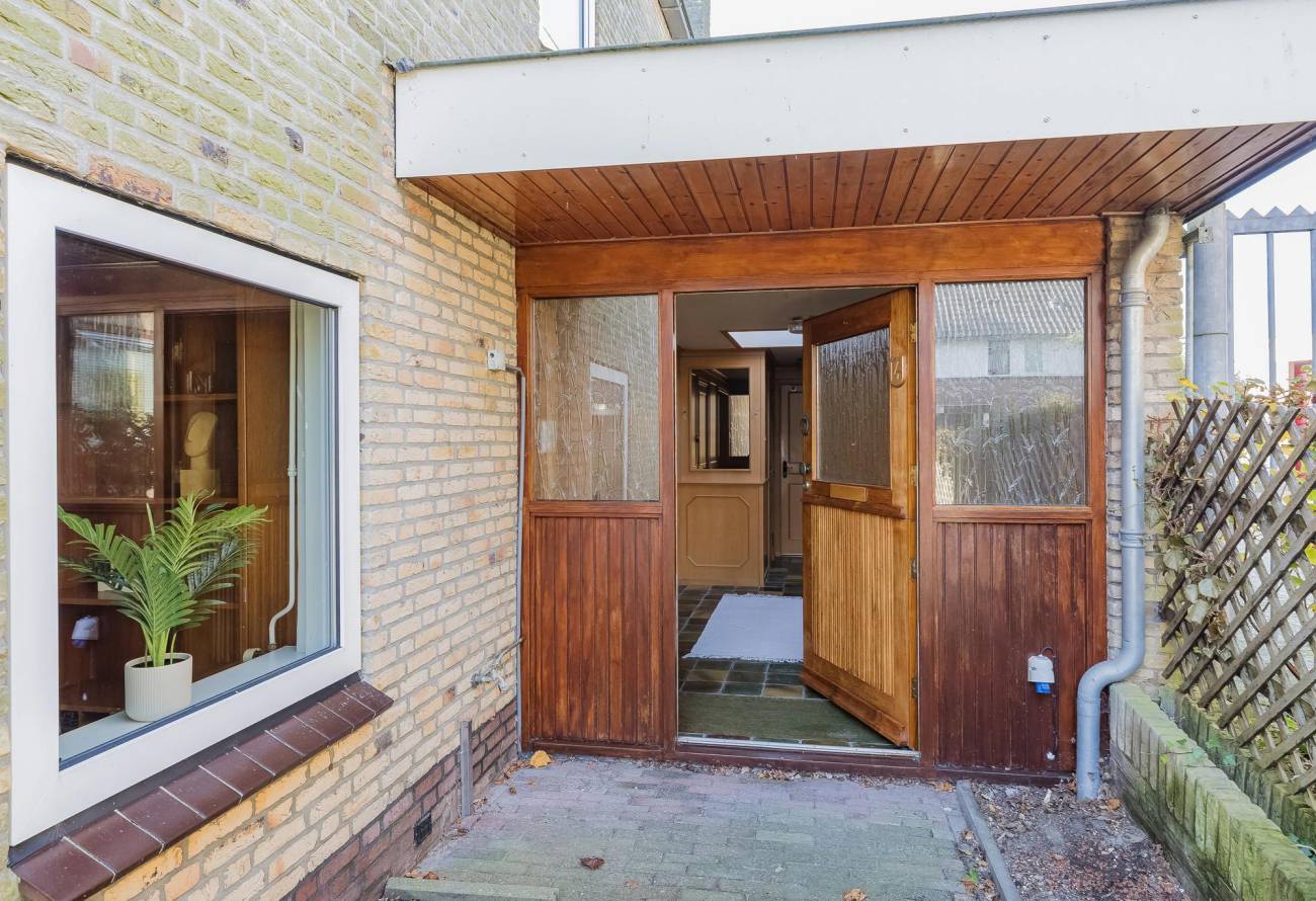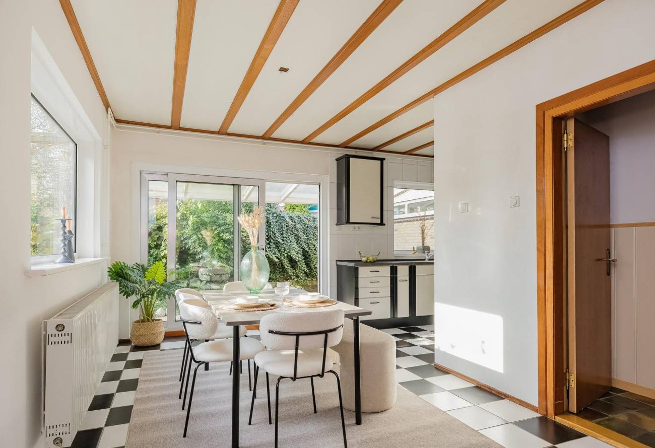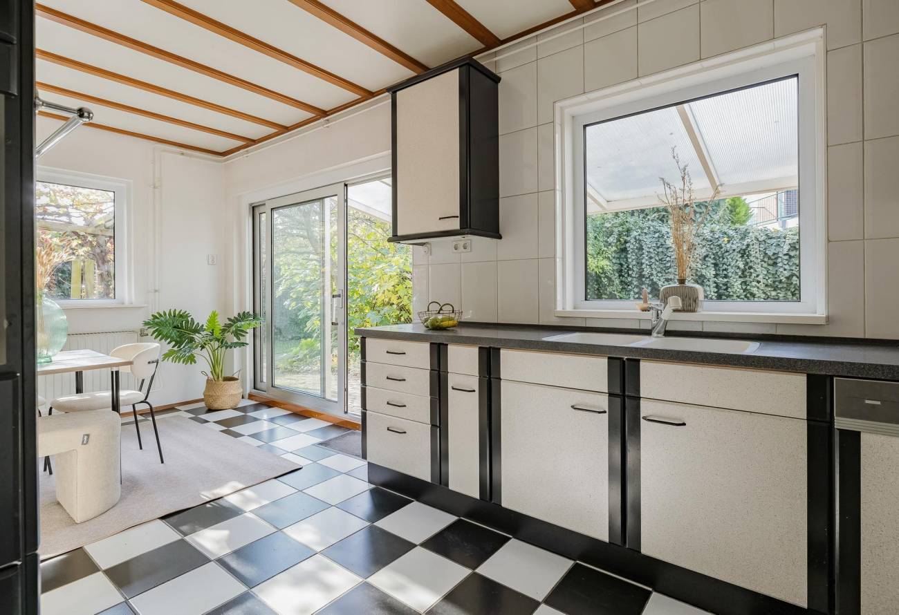 Entreehal met toiletruimte, garderobe, trap naar verdieping met keldertrapkast en deuren naar de zeer ruime berging, keuken en woonkamer. De uitgebouwde lichte woonkamer in L-vorm is voorzien van vloerverwarming. Ook is er heerlijk zicht op de tuin.