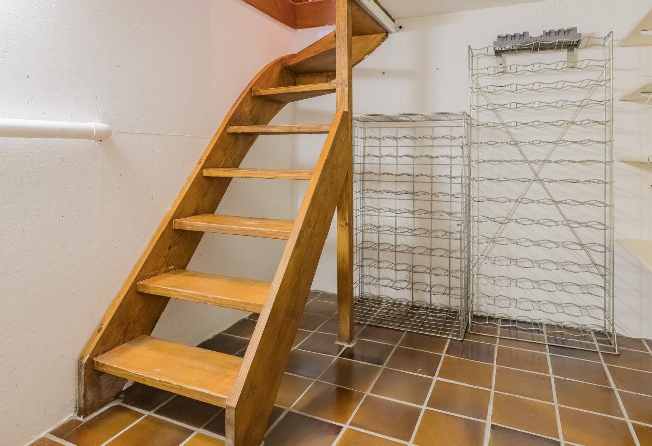 De droge kelder is geheel betegeld en voorzien van wandplanken.
