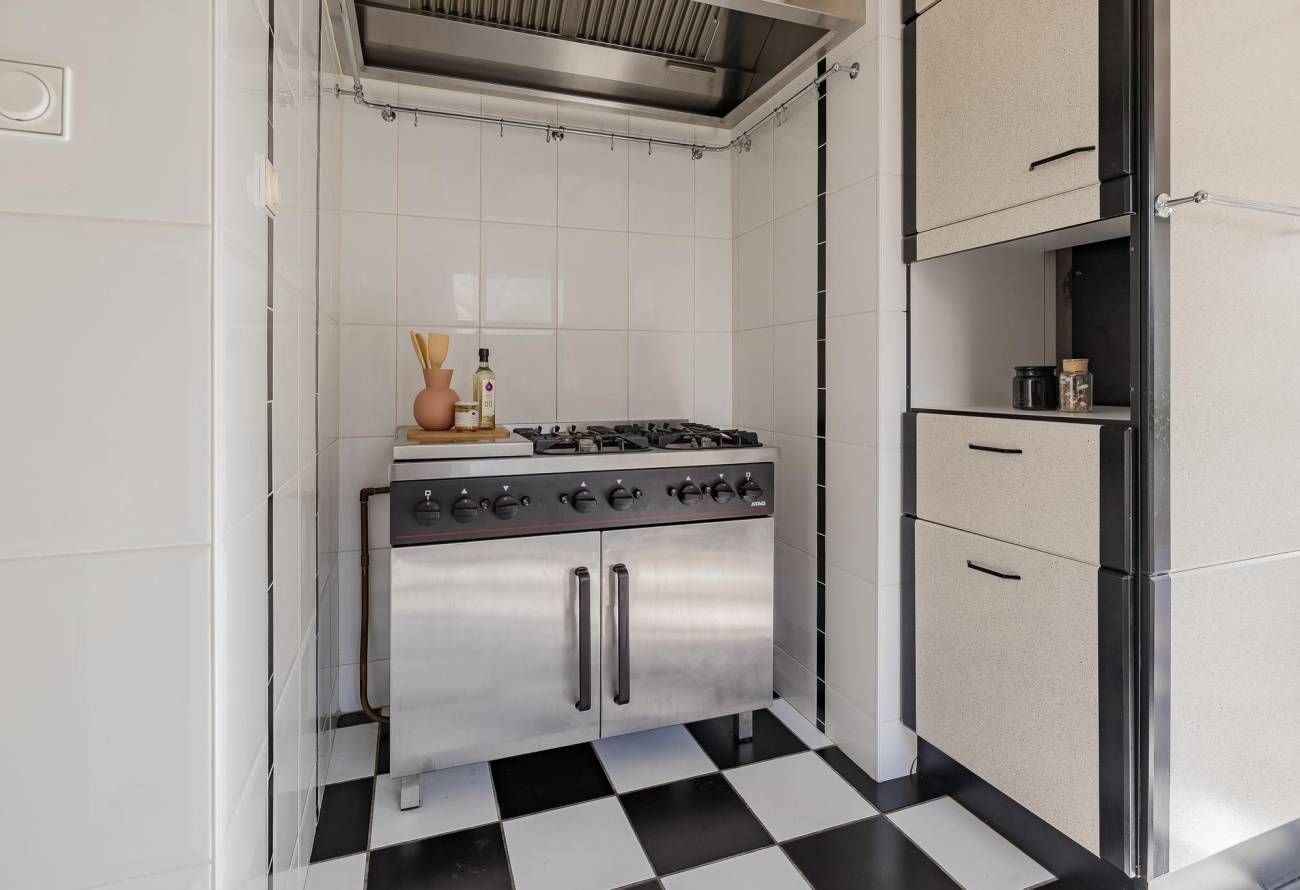 De lichte professionele keuken in hoekopstelling is voorzien inbouwapparatuur met raam naar de tuin.