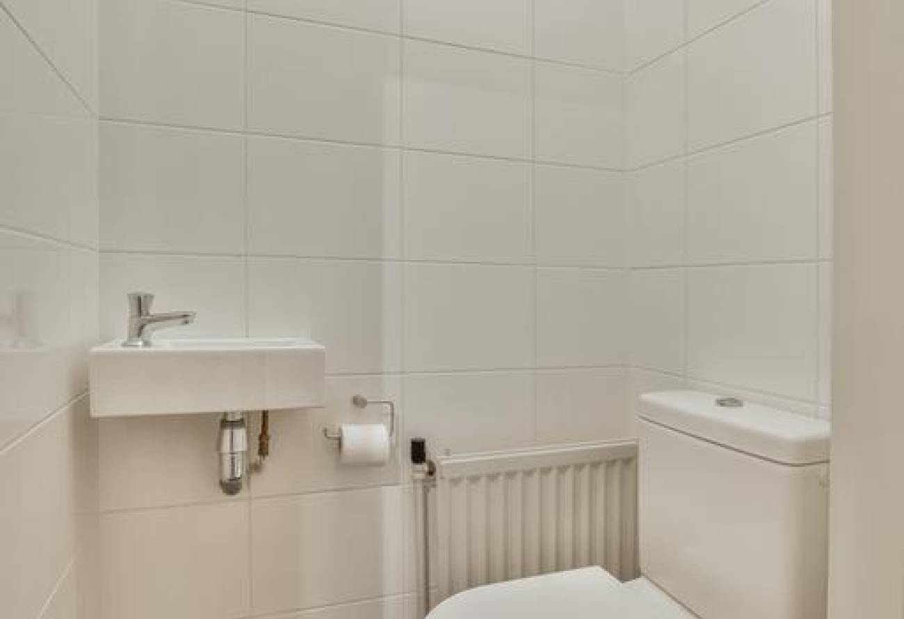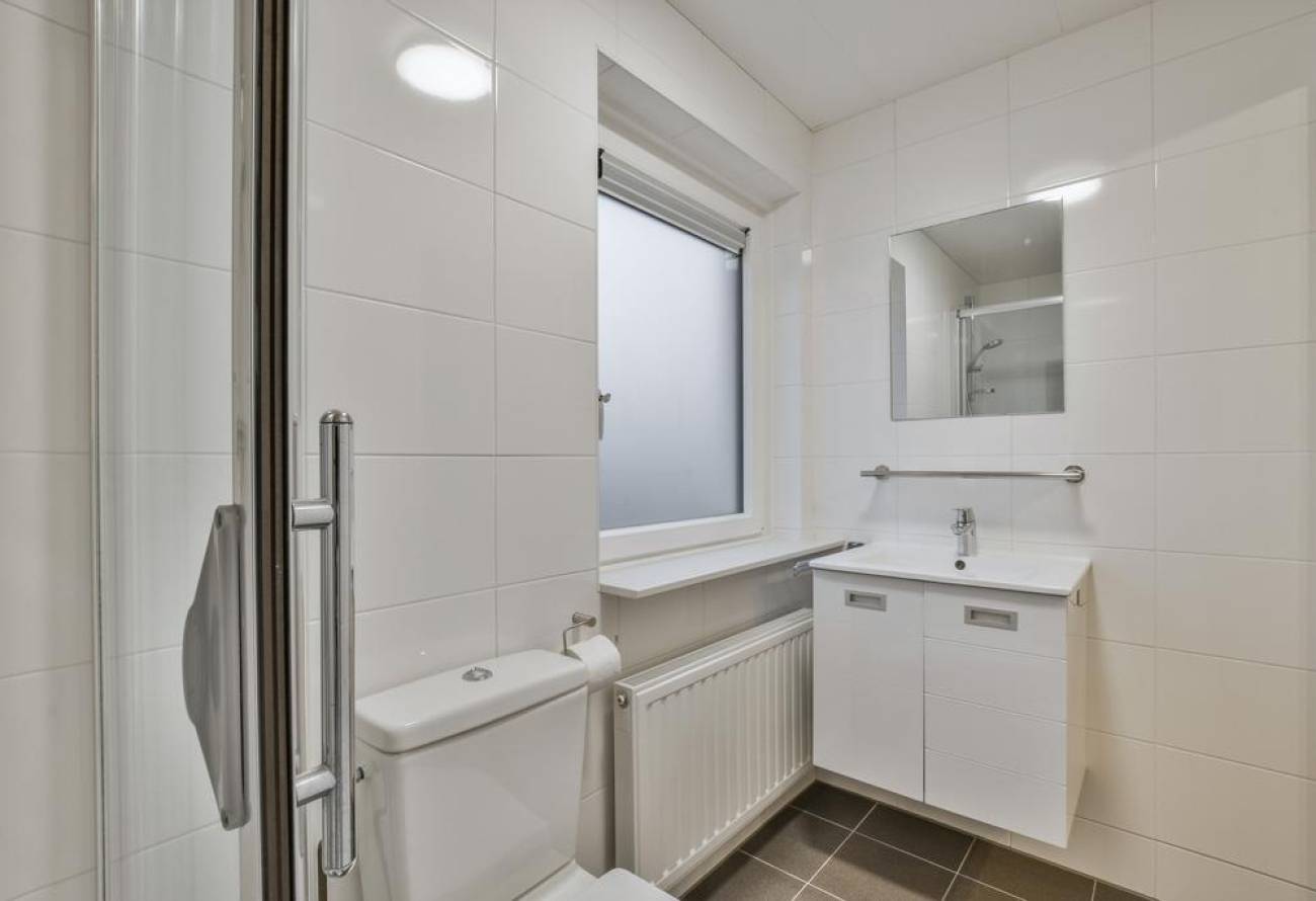 De moderne badkamer is uitgevoerd in lichte kleurstelling is geheel nieuw betegeld en beschikt over een inloopdouche, toilet, radiator en wastafel met meubel.