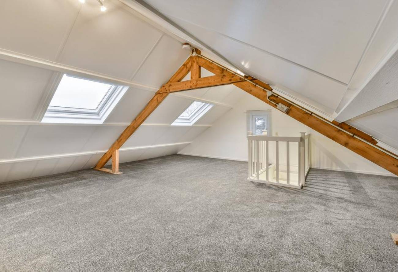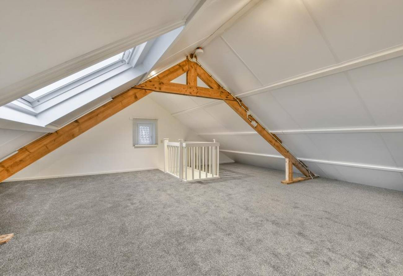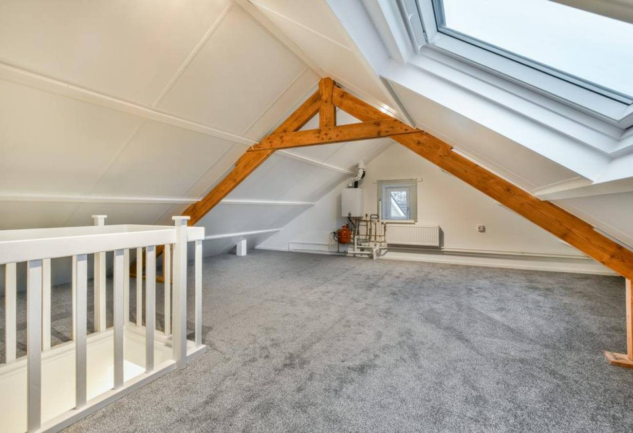 Vaste trap met directe toegang tot de zeer ruime slaapkamer voorzien van vloerbedekking, 2 dakramen en een prachtige open nok.