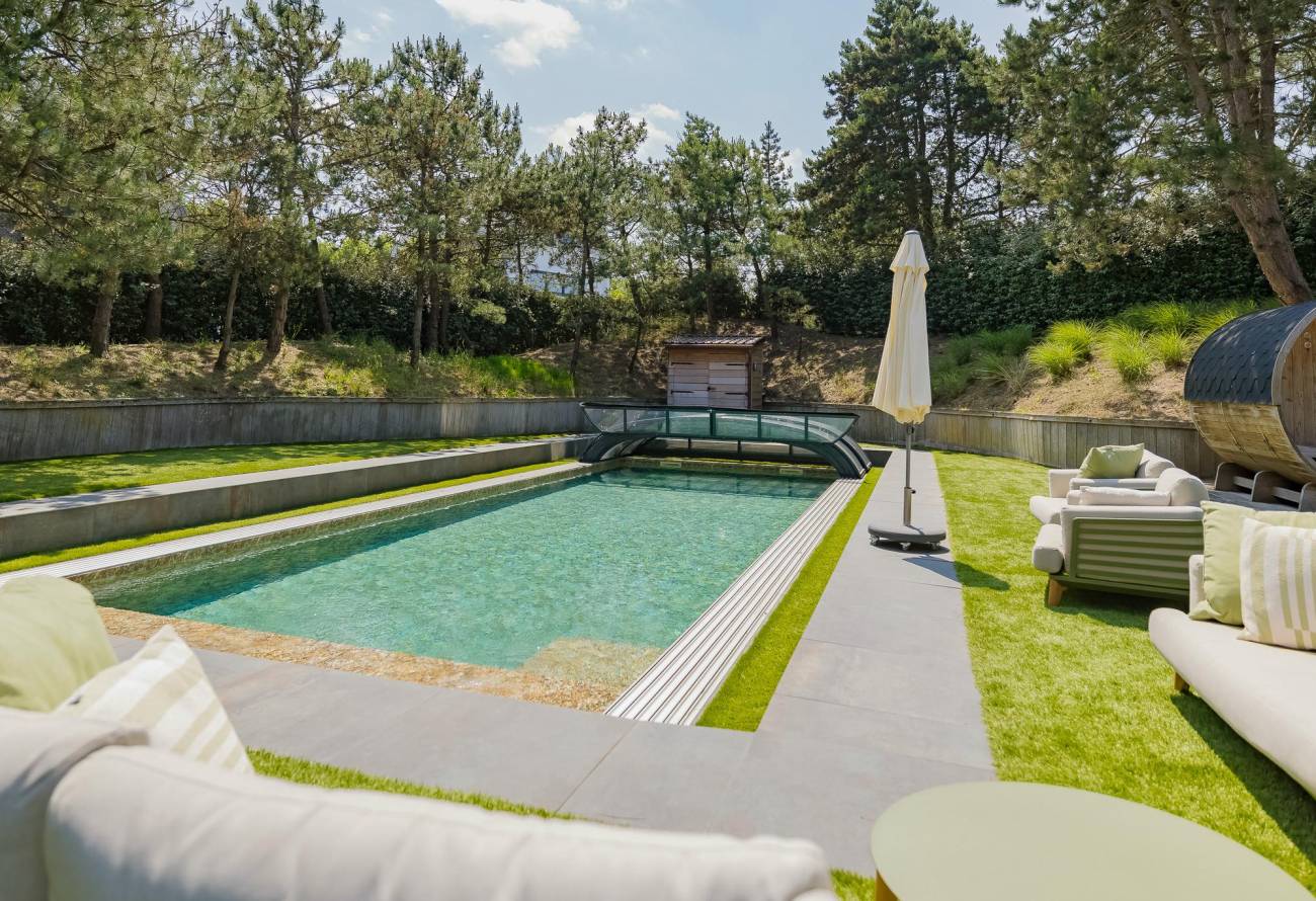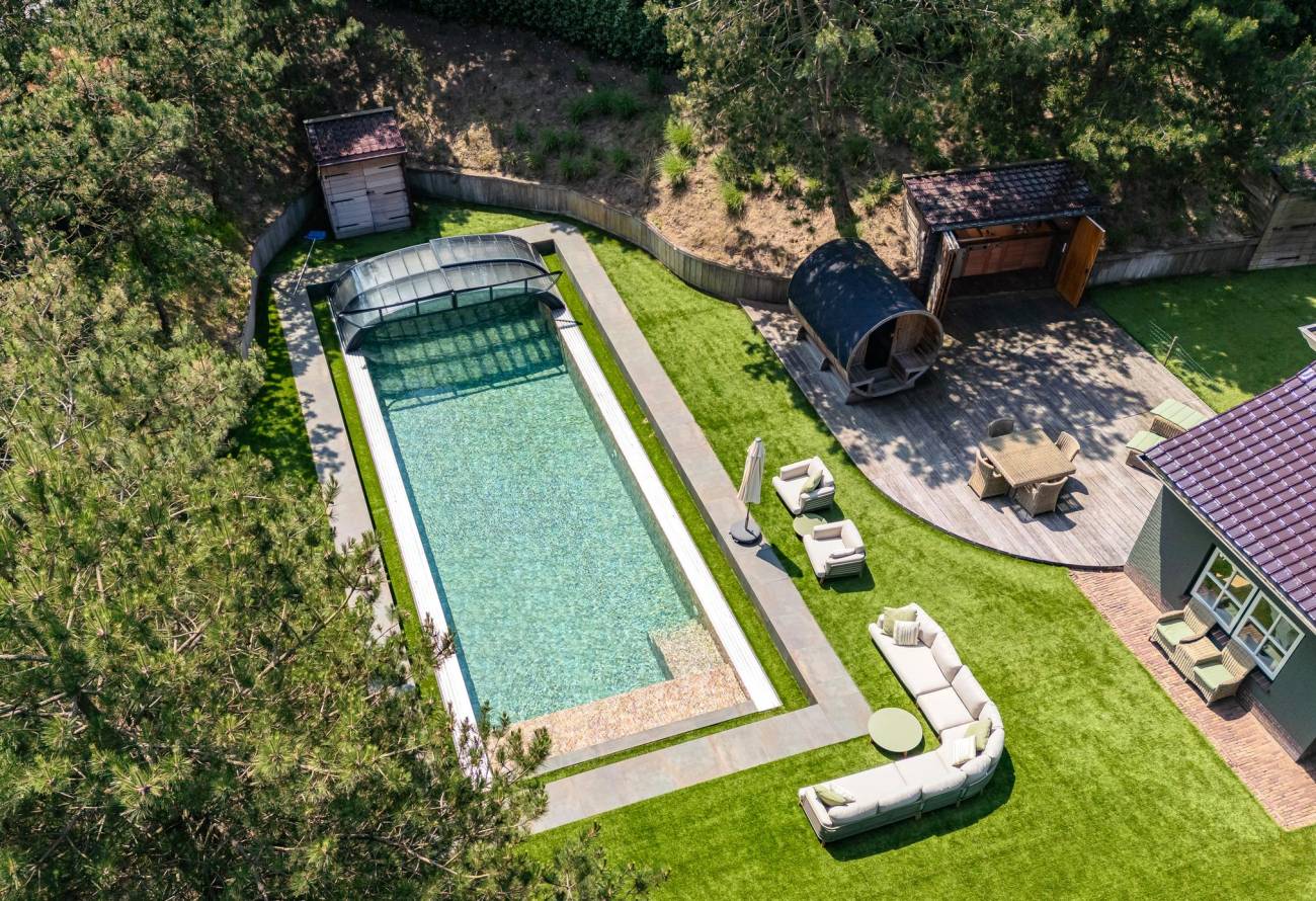 • Verwarmd zwembad van 14 x 5 meter met telescopische overkapping, verwarmd middels lucht/water warmtepomp.