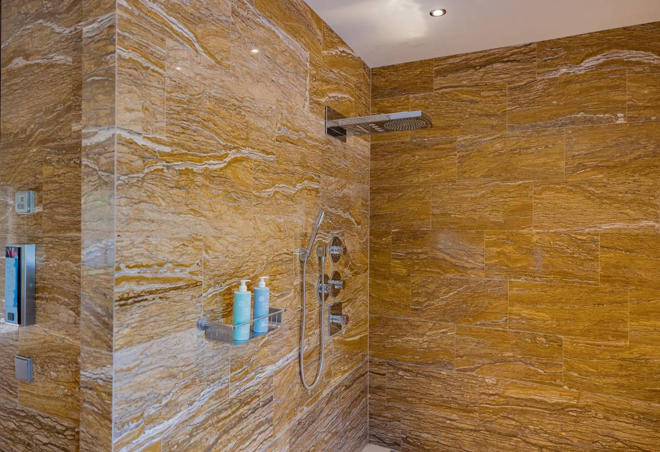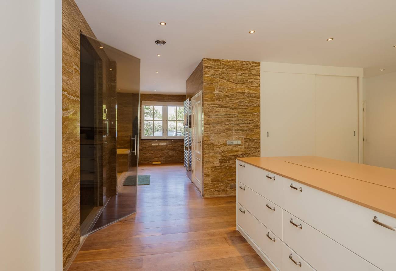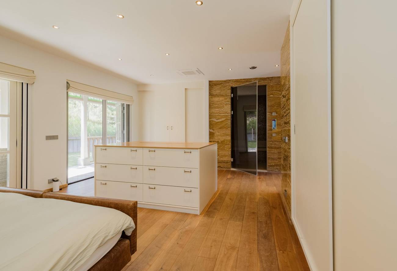 De slaapkamer op de begane grond vormt een eigen vleugel, inclusief luxe badkamer met marmeren tegels in warme terra tinten, een inloopdouche met massagefuncties, een stoomcabine met sterrenhemel en dubbele wastafels met unieke lederen waskommen. De kamer heeft een fijne inloopkast en veel vaste kastruimte. Het op maat gemaakte tv-meubel met lift completeert het gevoel van comfort en luxe. Vanuit de slaapkamer stap je zo op de fraaie veranda met heaters en verlichting – een plek waar binnen en buiten naadloos in elkaar overlopen.