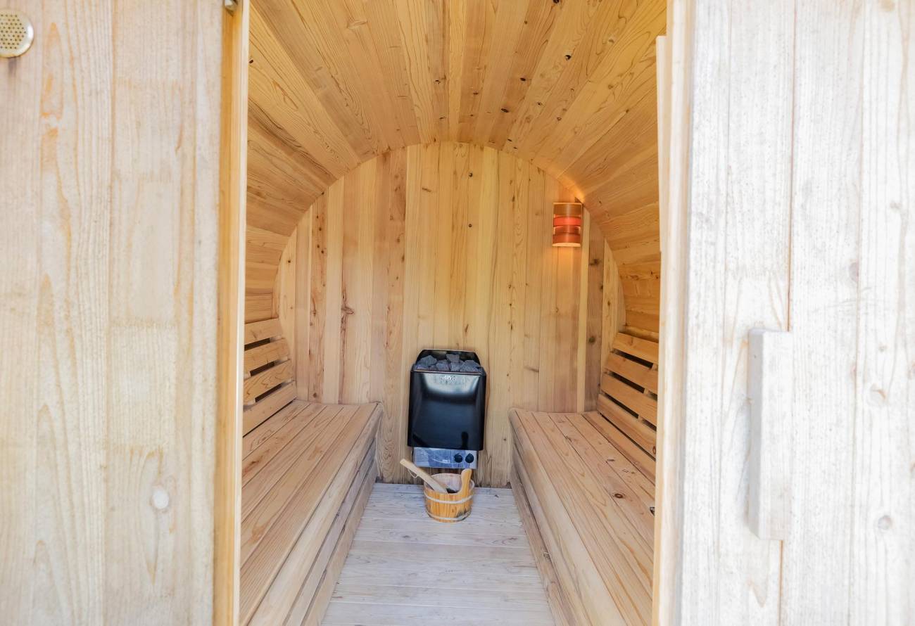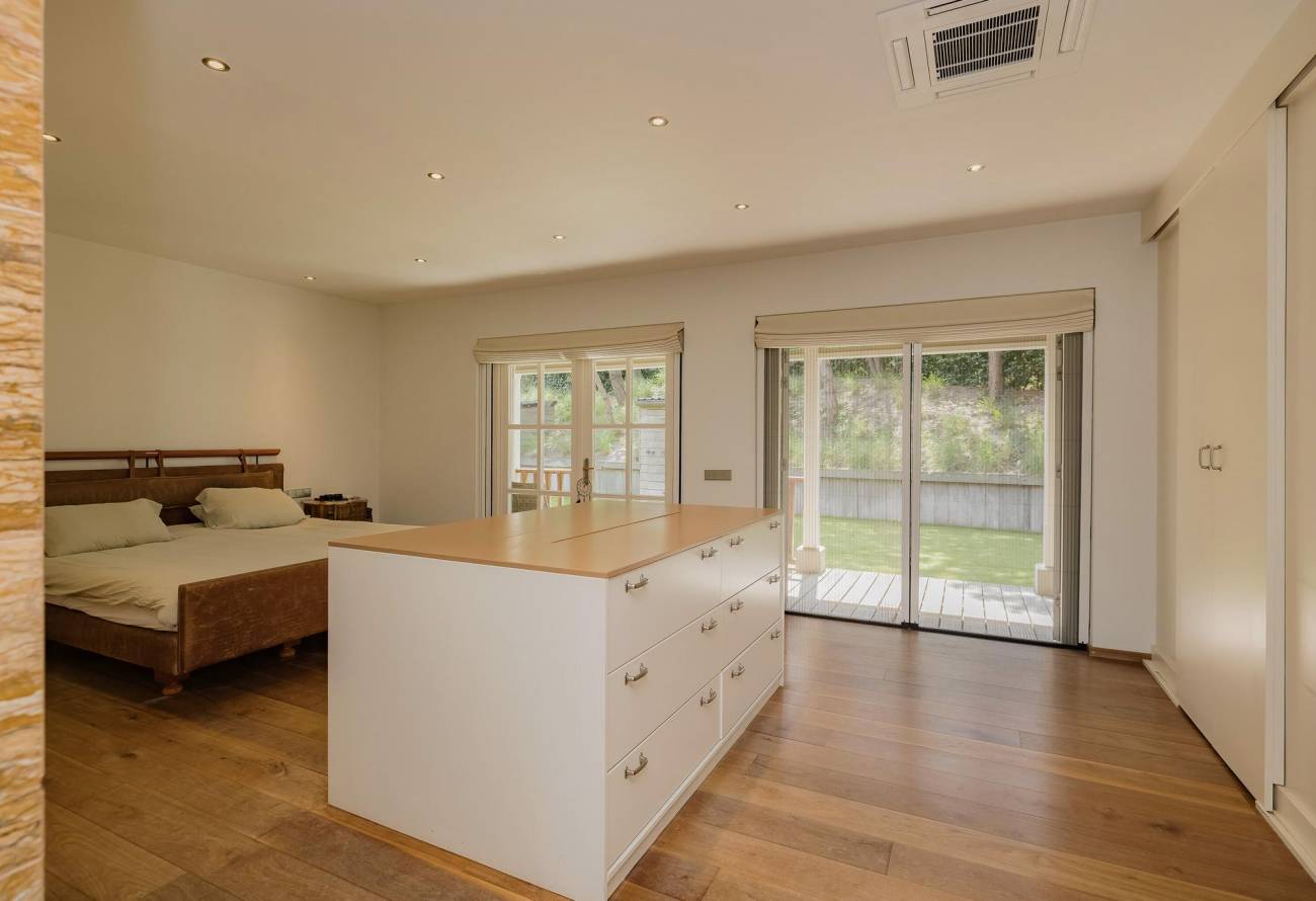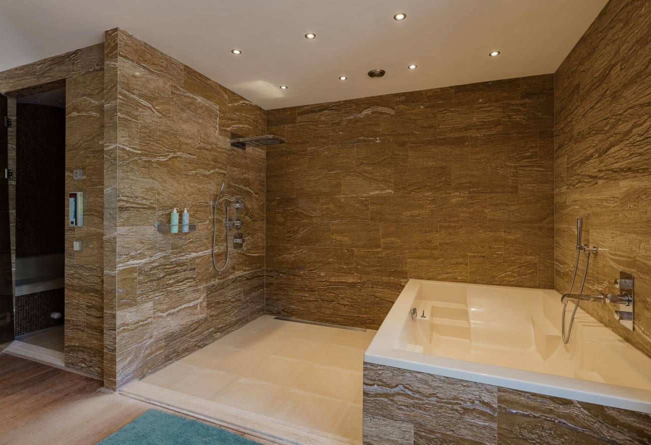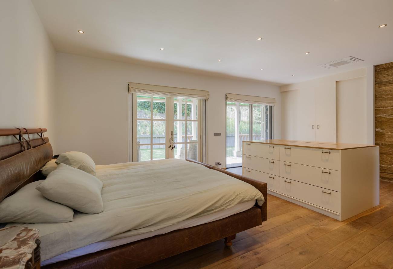 De slaapkamer op de begane grond vormt een eigen vleugel, inclusief luxe badkamer met marmeren tegels in warme terra tinten, een inloopdouche met massagefuncties, een stoomcabine met sterrenhemel en dubbele wastafels met unieke lederen waskommen. De kamer heeft een fijne inloopkast en veel vaste kastruimte. Het op maat gemaakte tv-meubel met lift completeert het gevoel van comfort en luxe. Vanuit de slaapkamer stap je zo op de fraaie veranda met heaters en verlichting – een plek waar binnen en buiten naadloos in elkaar overlopen.