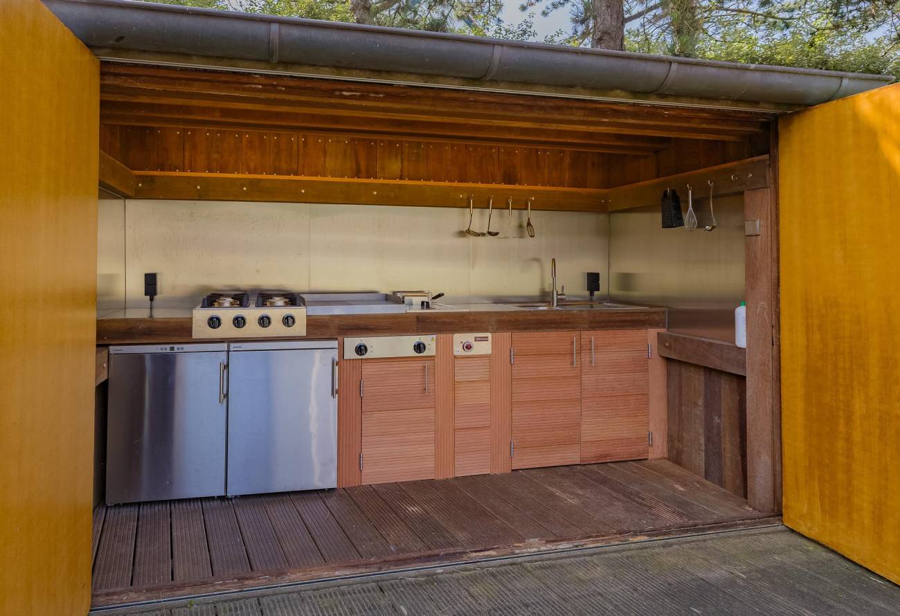 • Buitenkeuken met warm/koud water, 4-pits gasfornuis, frituur, grill, koelkast en vriezer.