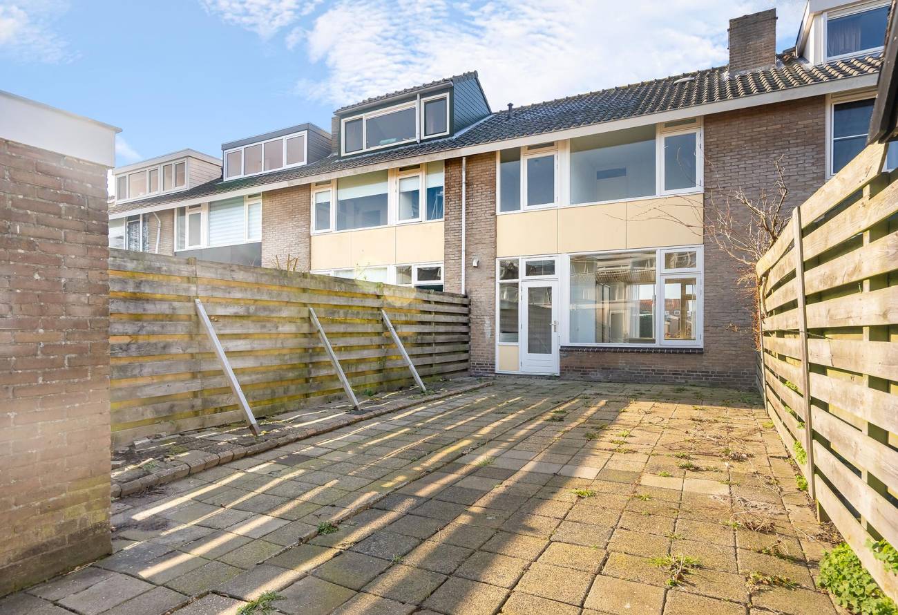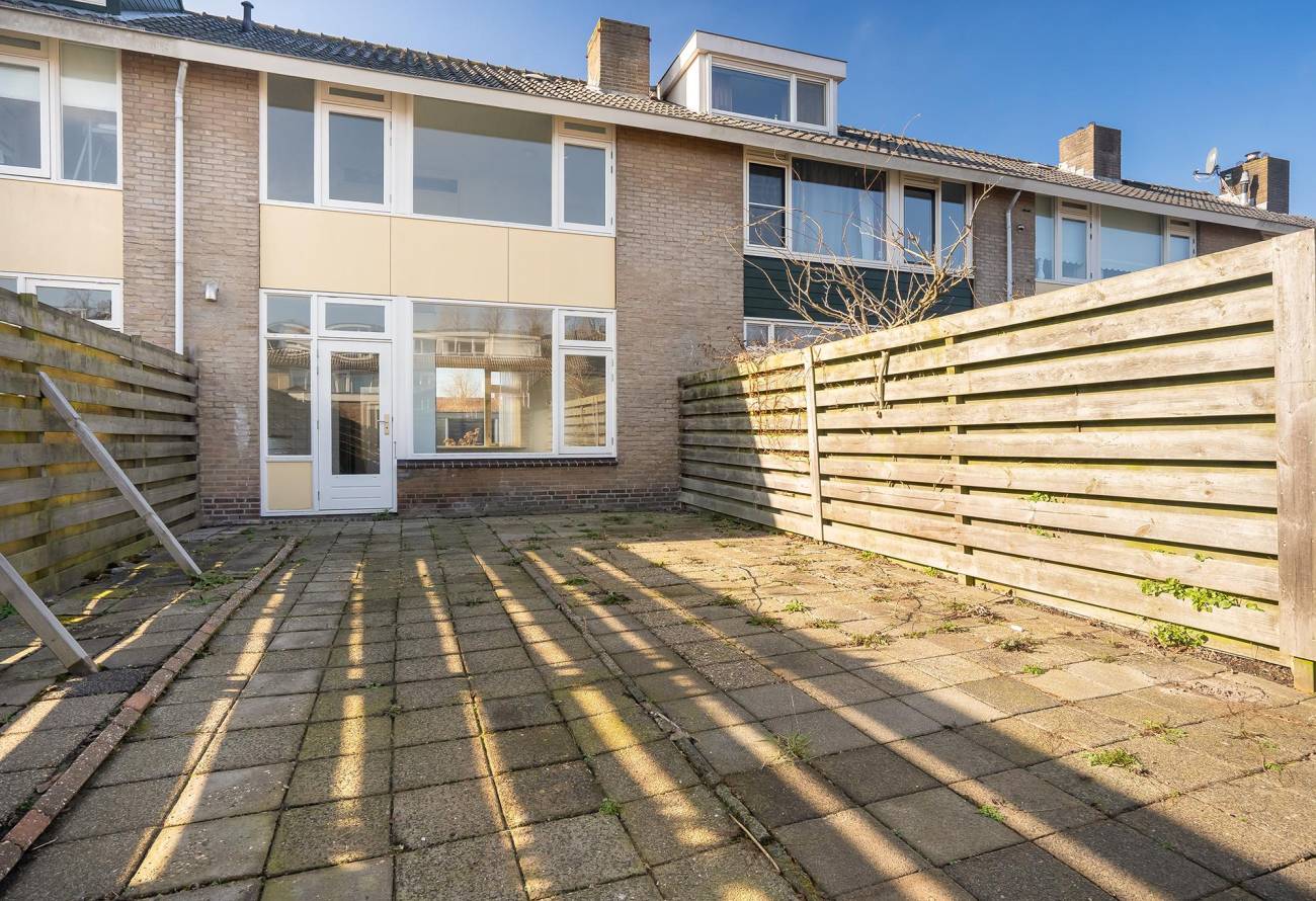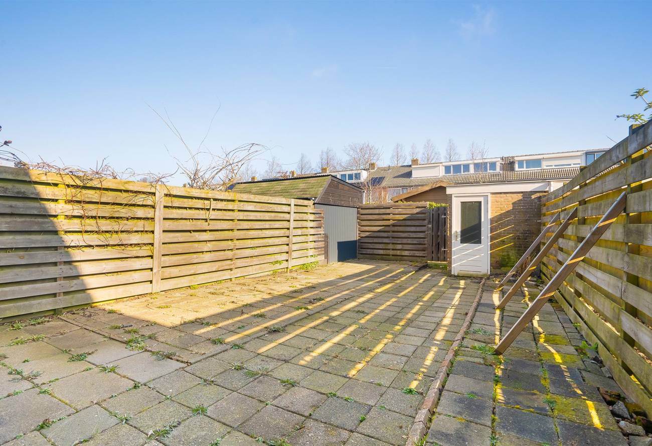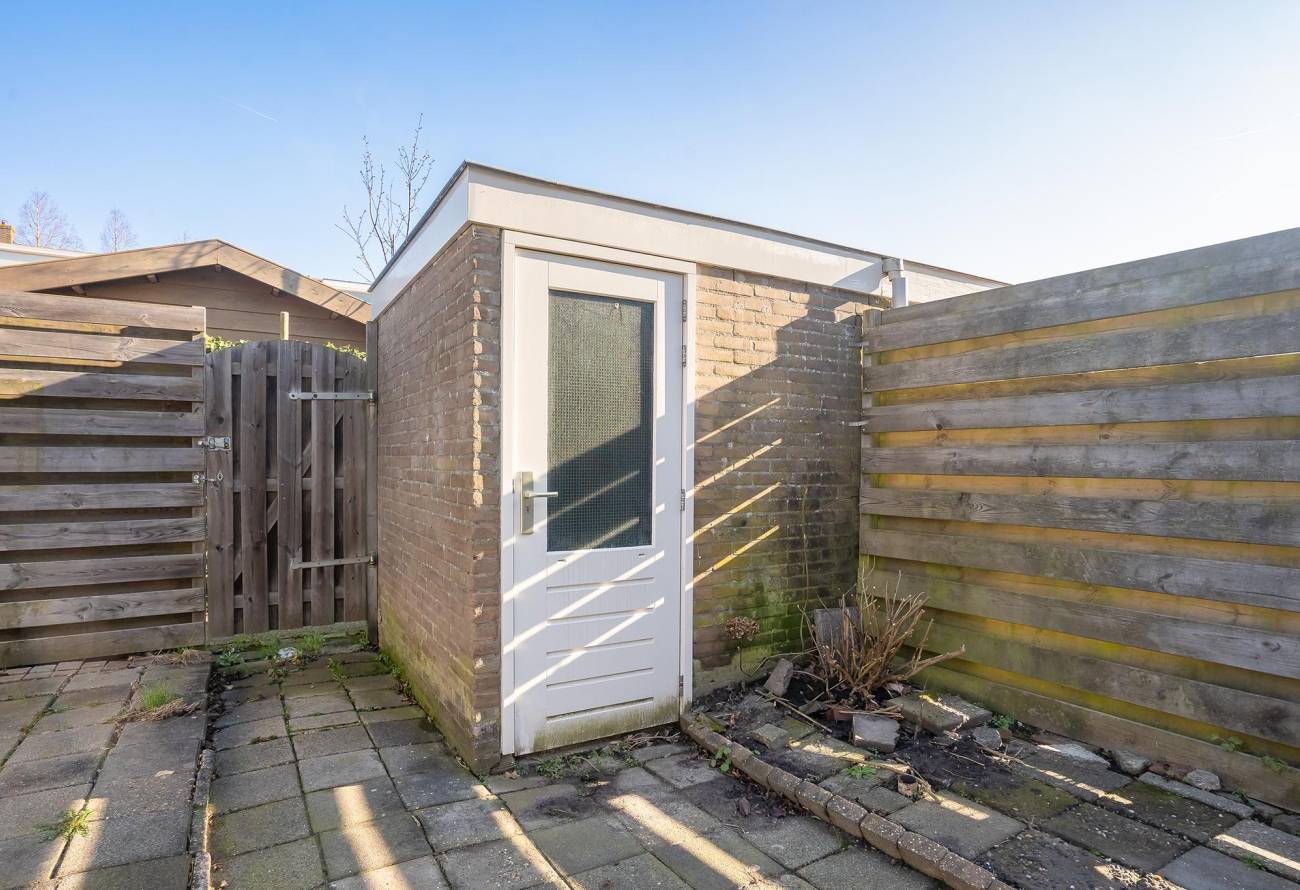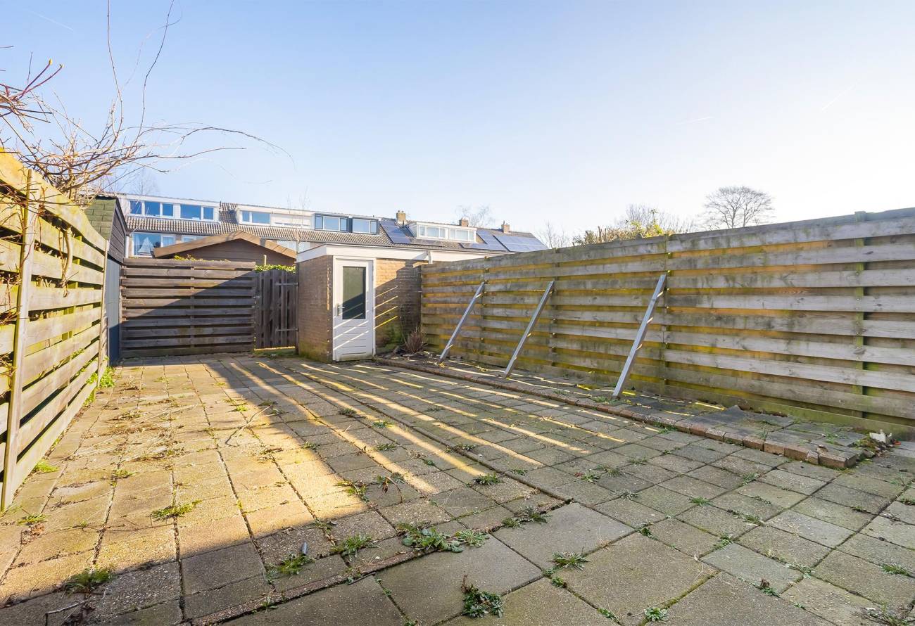 De achtertuin beschikt over een vrijstaande berging en achterom. De gehele achtertuin is betegeld en is gelegen op het noordoosten. De tuin is 10m diep en mede hierdoor kan er heerlijk van de zon genoten worden. Tevens is de voortuin gelegen op het zuidwesten.