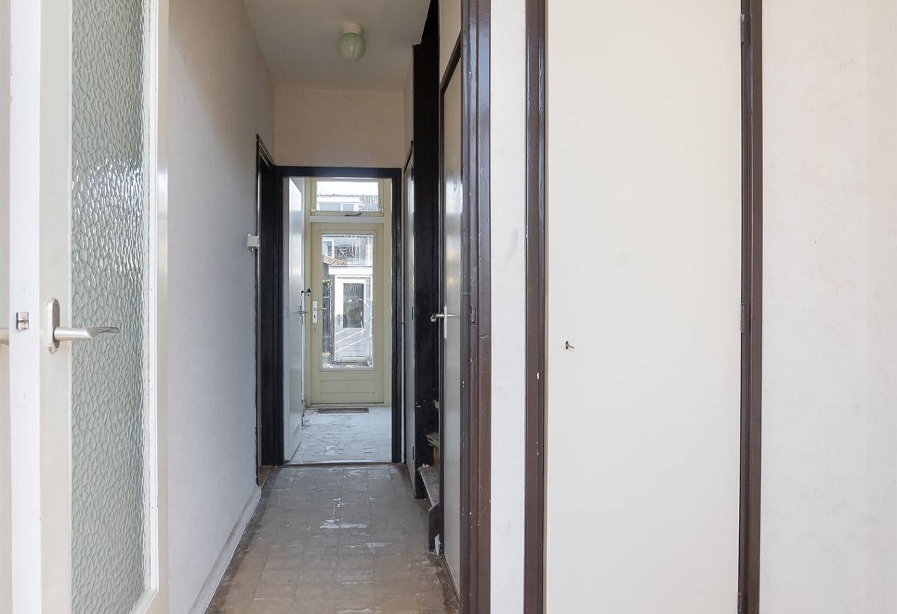 Entree, toegang tot vestibule met garderobe en opstelling meterkast. Doorloop naar de hal met separaat toilet en ruime trapkast. De doorzonwoonkamer is ruim en zeer licht door de raampartijen aan beide kanten, tevens bevinden zich in de woonkamer twee inbouwkasten. De gesloten keuken is aan de achterzijde van de woning gesitueerd en is voorzien van een eenvoudige inrichting met wasmachineaansluiting. Vanuit de keuken is er middels een deur toegang tot de achtertuin.