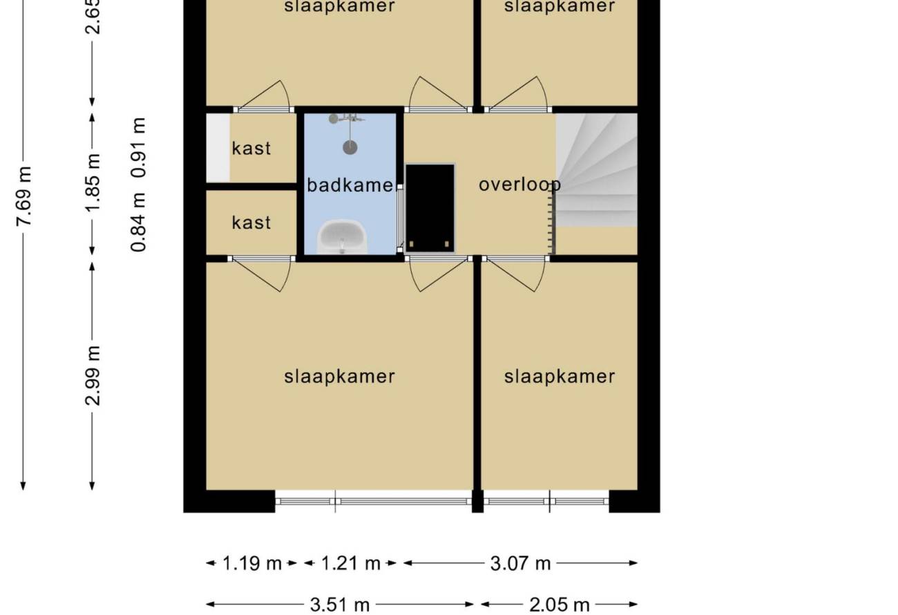 Vanuit de hal is de trap naar de overloop van de 1e etage. Hier bevinden zich maar liefst 4 slaapkamers en de badkamer. De badkamer is in het midden gesitueerd en is eenvoudig ingericht en voorzien van doucheruimte en wastafel. Aan zowel de voor- als achterzijde bevindt zich beiden één ruime slaapkamer met inbouwkasten.