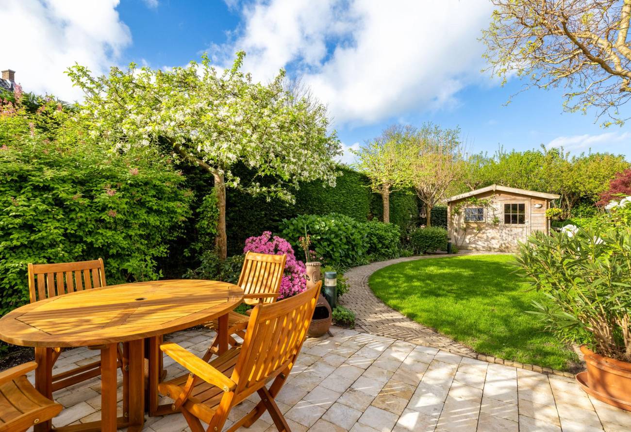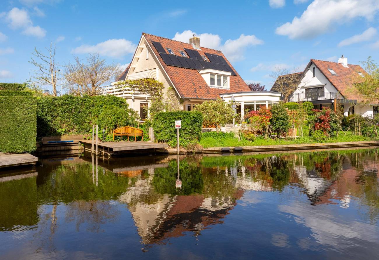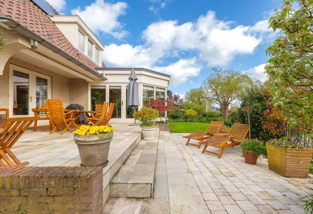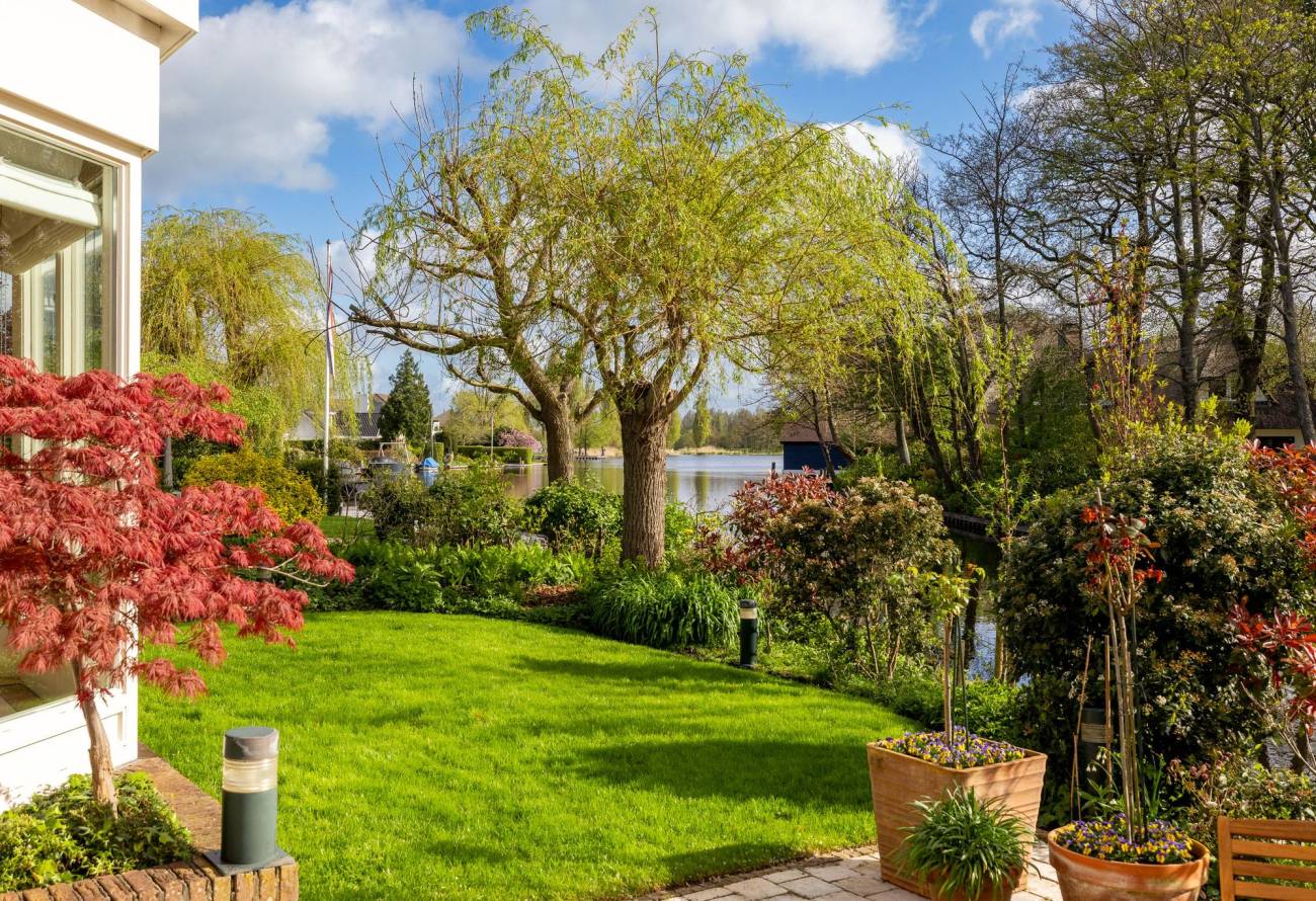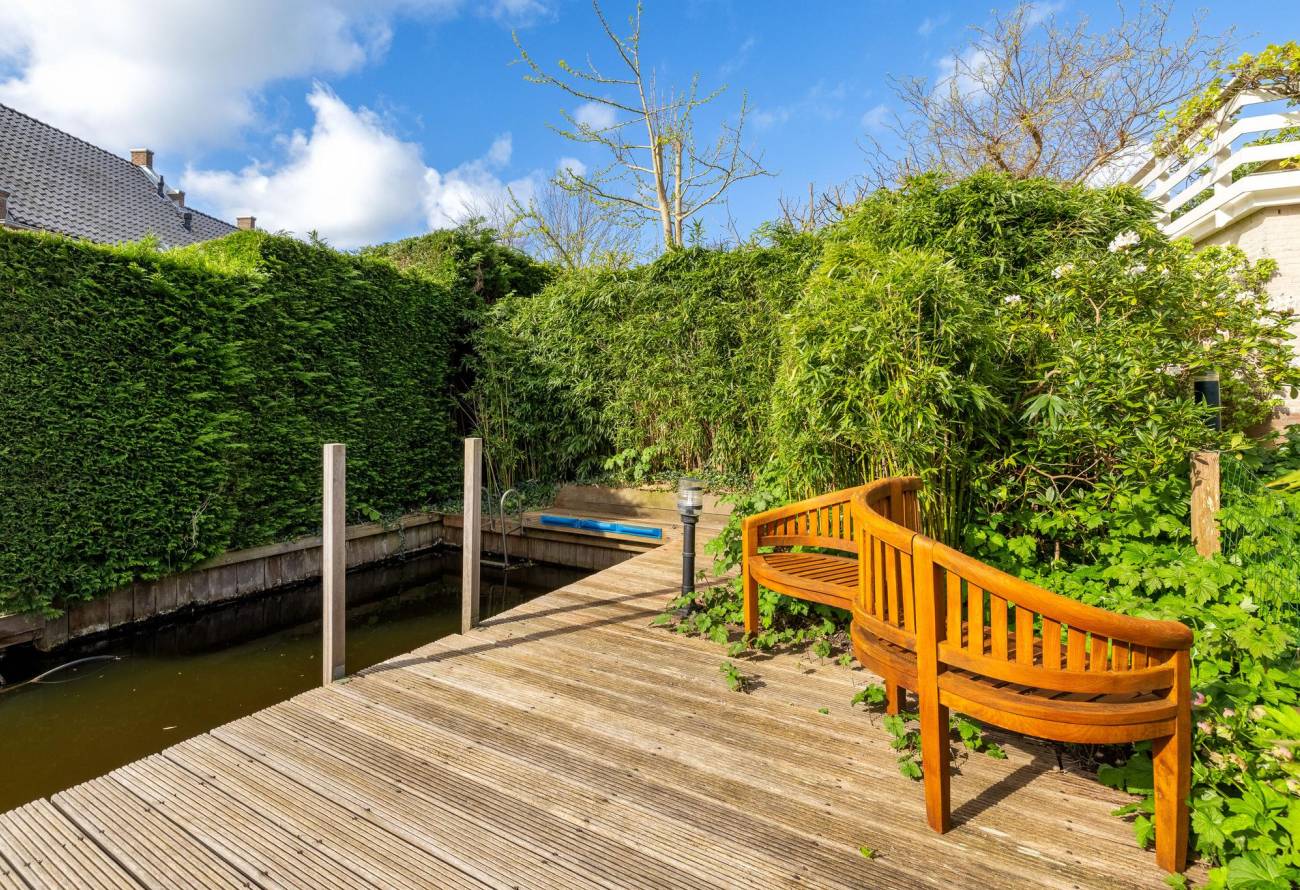 De zonnige tuin (W) heeft twee ruime terrassen, bereikbaar vanuit de serre, de eetkamer en de werkkamer. Met een eigen insteekhaven met zwemtrap is er vanaf de eigen tuin toegang tot allerlei vormen van watersport. Zo zit je direct aan het Poelmeer en vaar je in enkele minuten, via Warmond, naar de Kagerplassen met recreatiegebied ‘Koudenhoorn’ of verder naar de gezellige grachten van Leiden.
