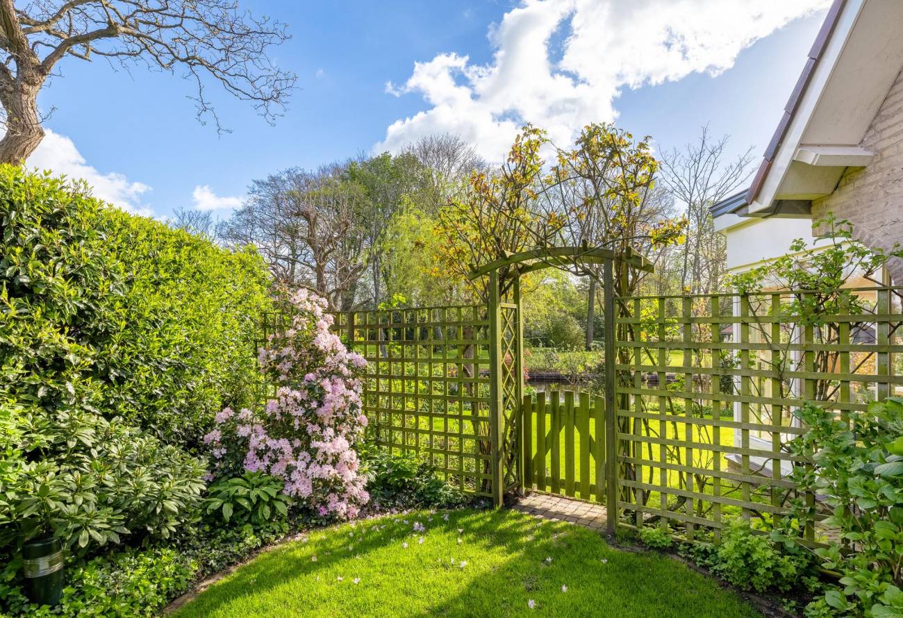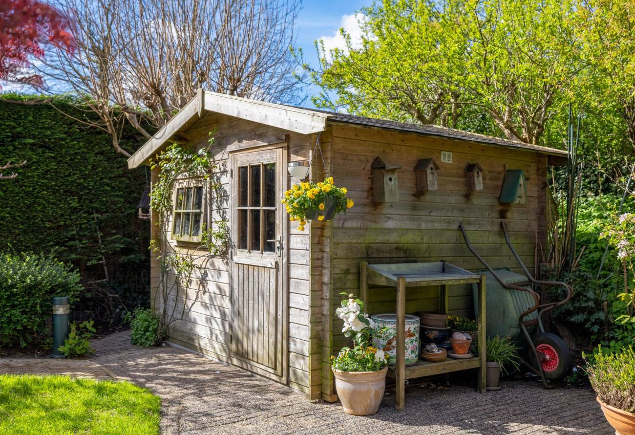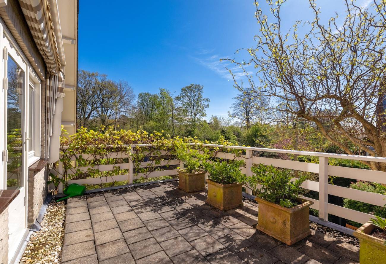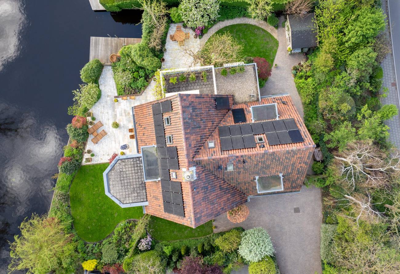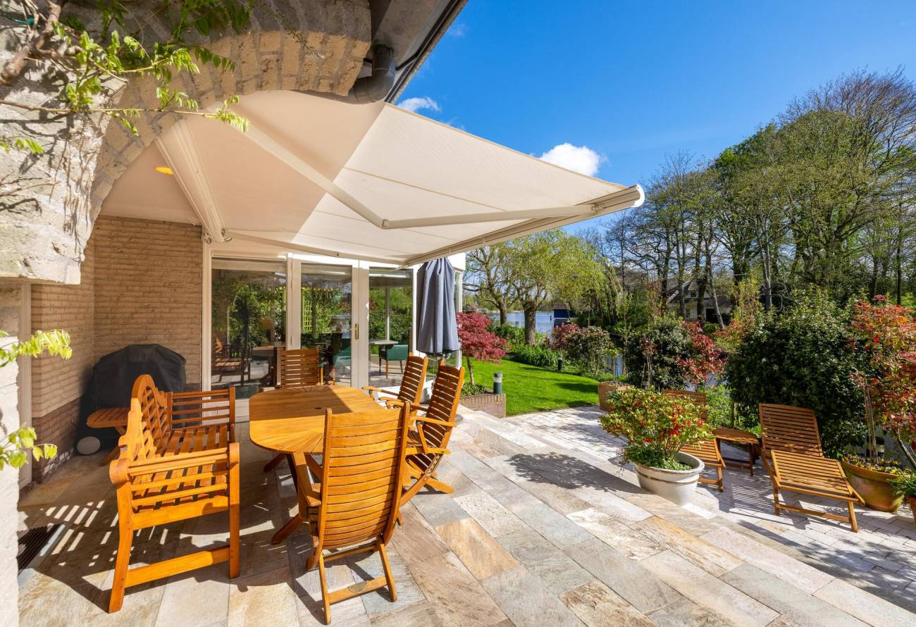 De zonnige tuin (W) heeft twee ruime terrassen, bereikbaar vanuit de serre, de eetkamer en de werkkamer. Met een eigen insteekhaven met zwemtrap is er vanaf de eigen tuin toegang tot allerlei vormen van watersport. Zo zit je direct aan het Poelmeer en vaar je in enkele minuten, via Warmond, naar de Kagerplassen met recreatiegebied ‘Koudenhoorn’ of verder naar de gezellige grachten van Leiden.