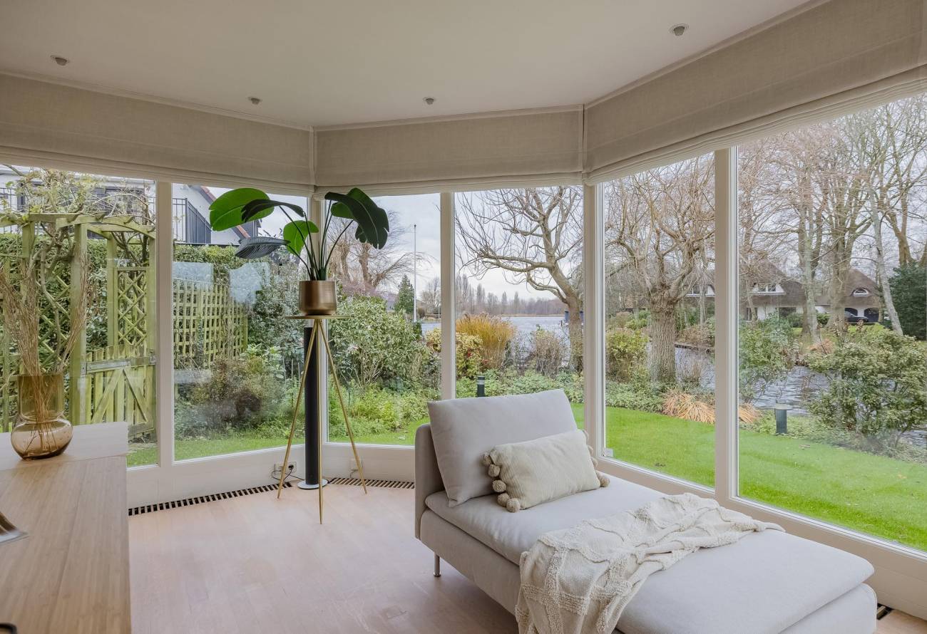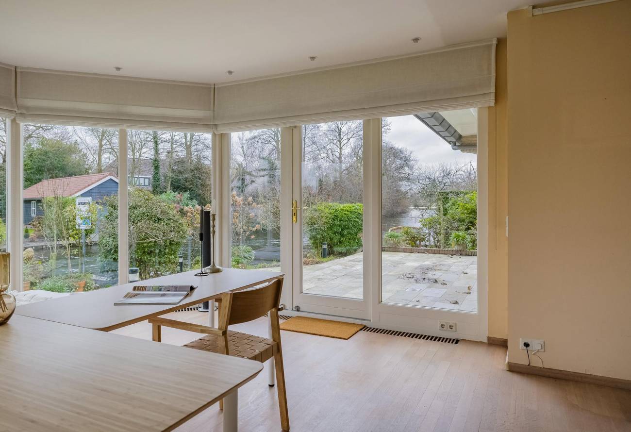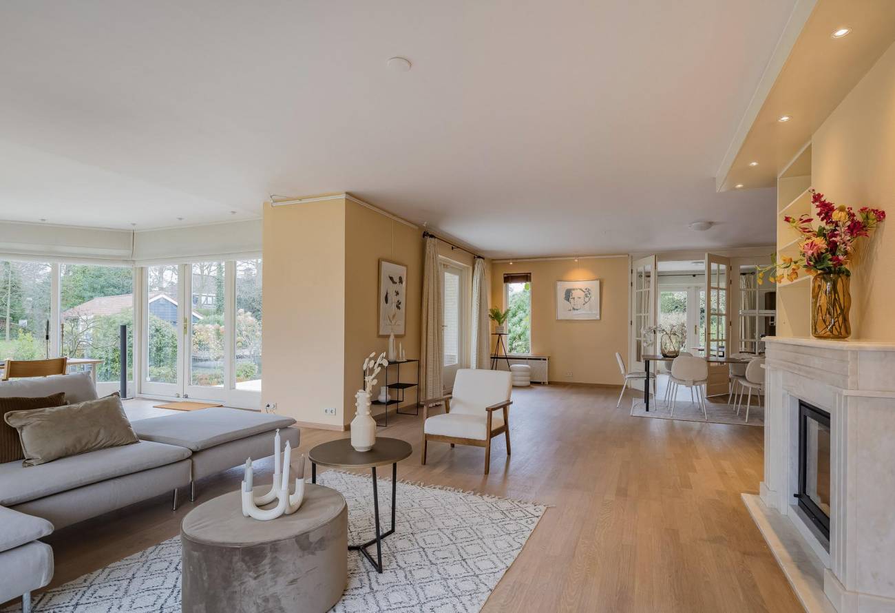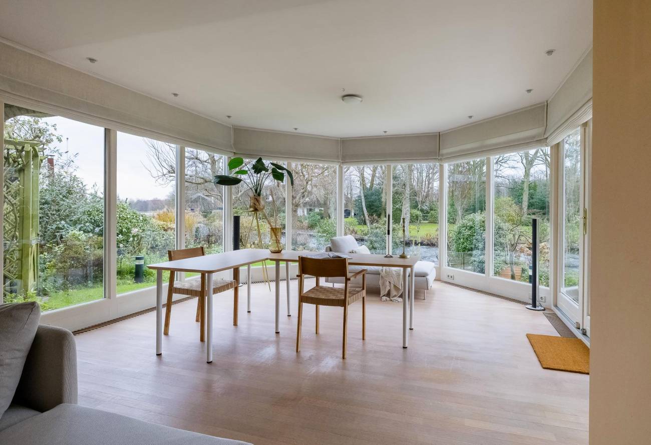 Ruime hal met gastentoilet, meterkast, garderobekast en toegangsdeur naar de woonkamer. De royale living biedt een ruime knusse zithoek bij de haard en de prachtige serre is een uitnodigende leefruimte met een fraai uitzicht over het Poelmeer en die het hele jaar door veel natuurlijk licht binnenbrengt. Ook in de werkkamer is er een verrassend uitzicht over het Poelmeer.