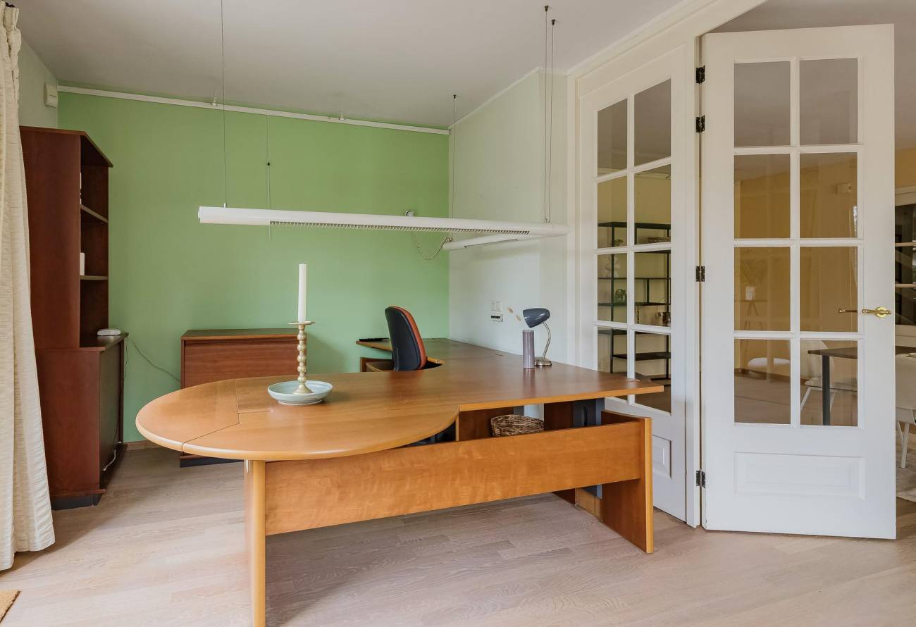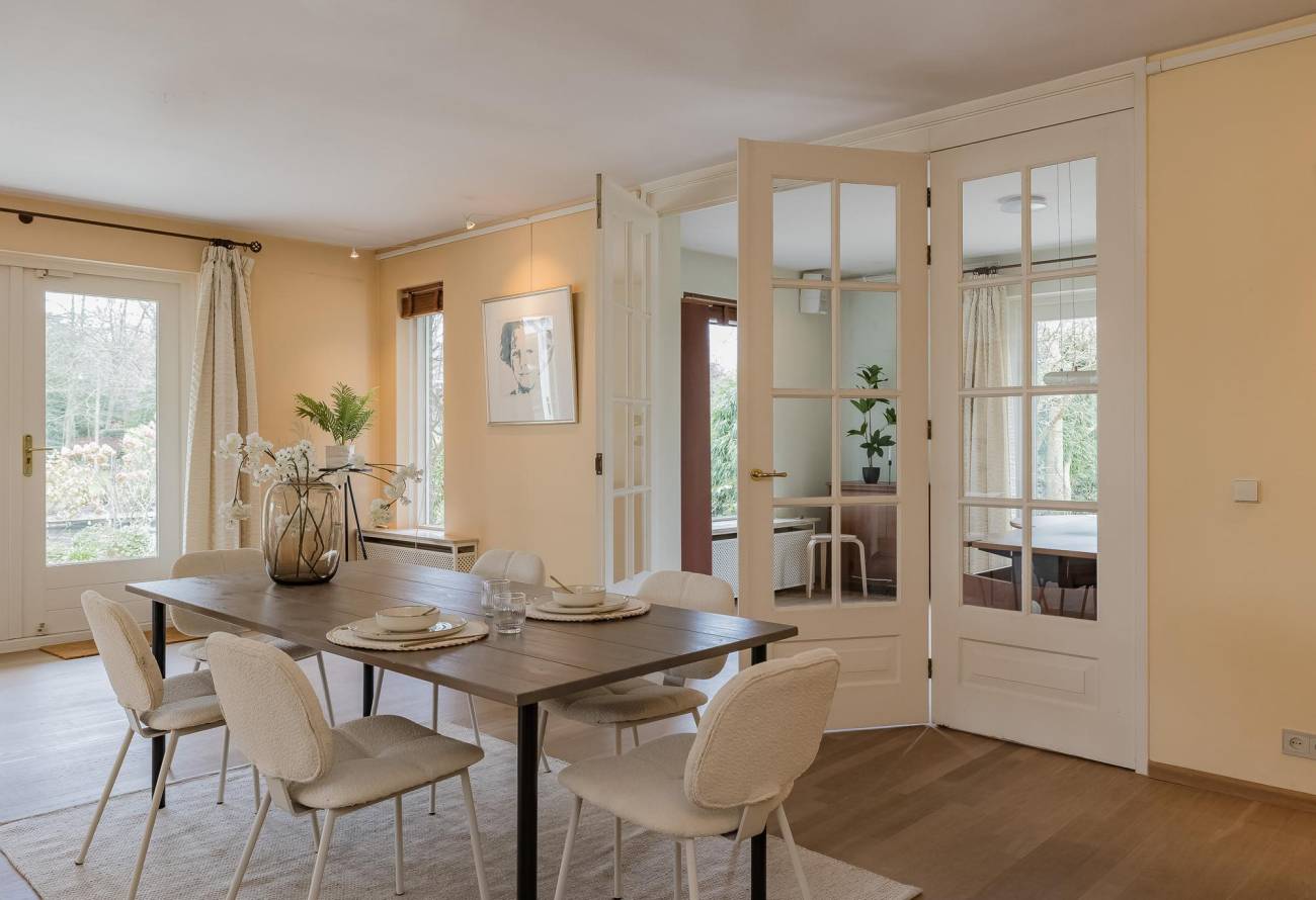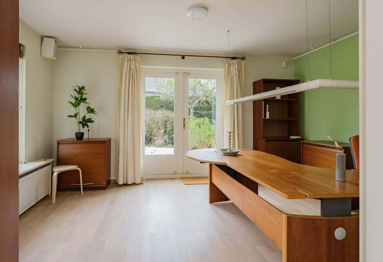 Ruime hal met gastentoilet, meterkast, garderobekast en toegangsdeur naar de woonkamer. De royale living biedt een ruime knusse zithoek bij de haard en de prachtige serre is een uitnodigende leefruimte met een fraai uitzicht over het Poelmeer en die het hele jaar door veel natuurlijk licht binnenbrengt. Ook in de werkkamer is er een verrassend uitzicht over het Poelmeer.