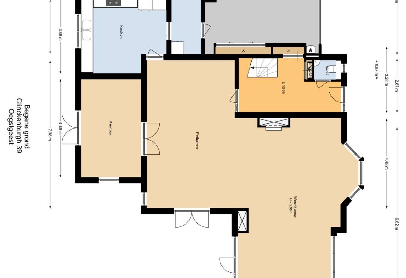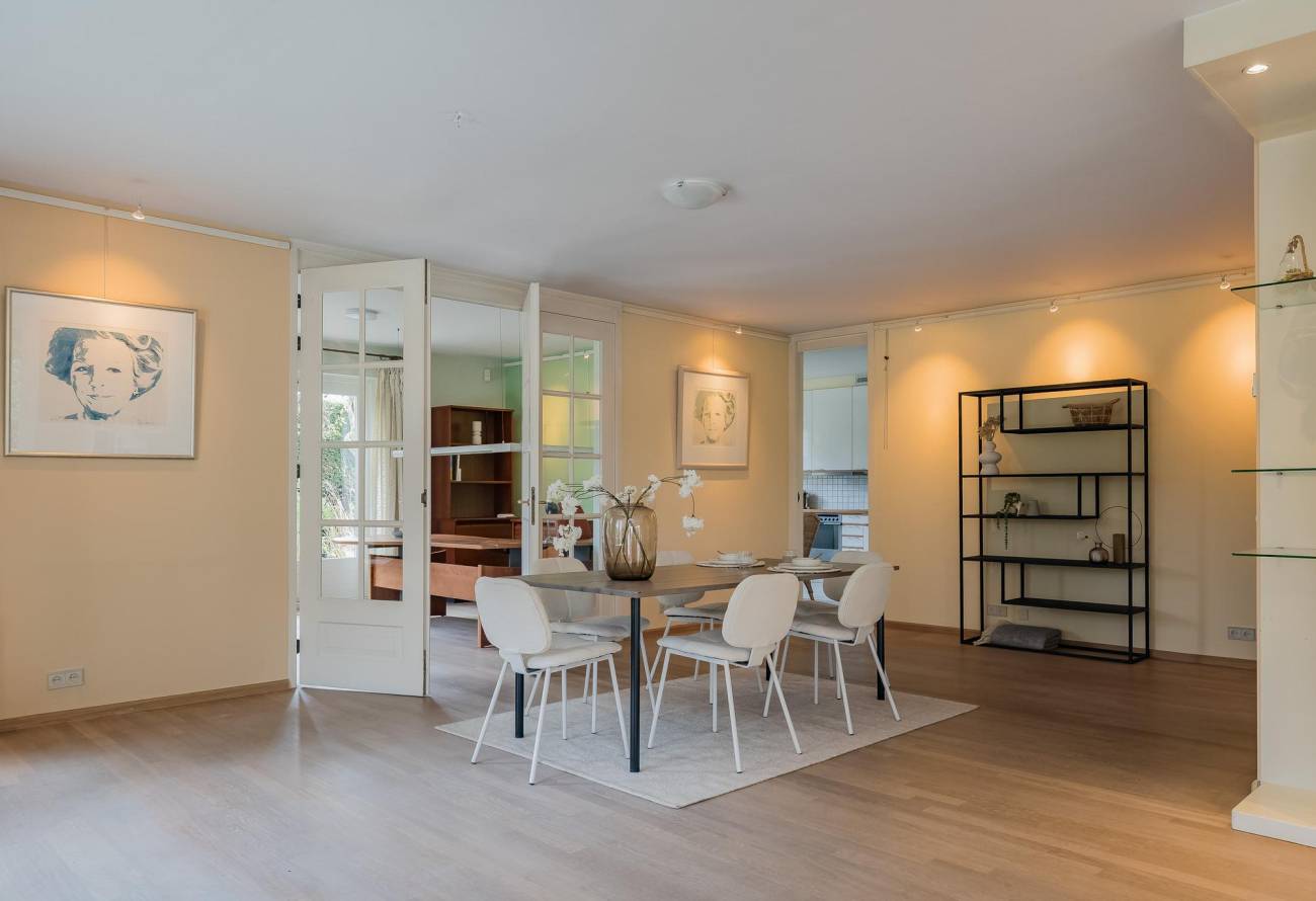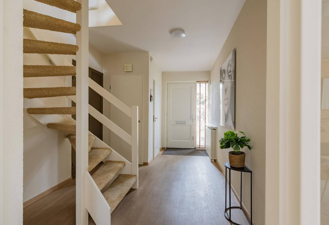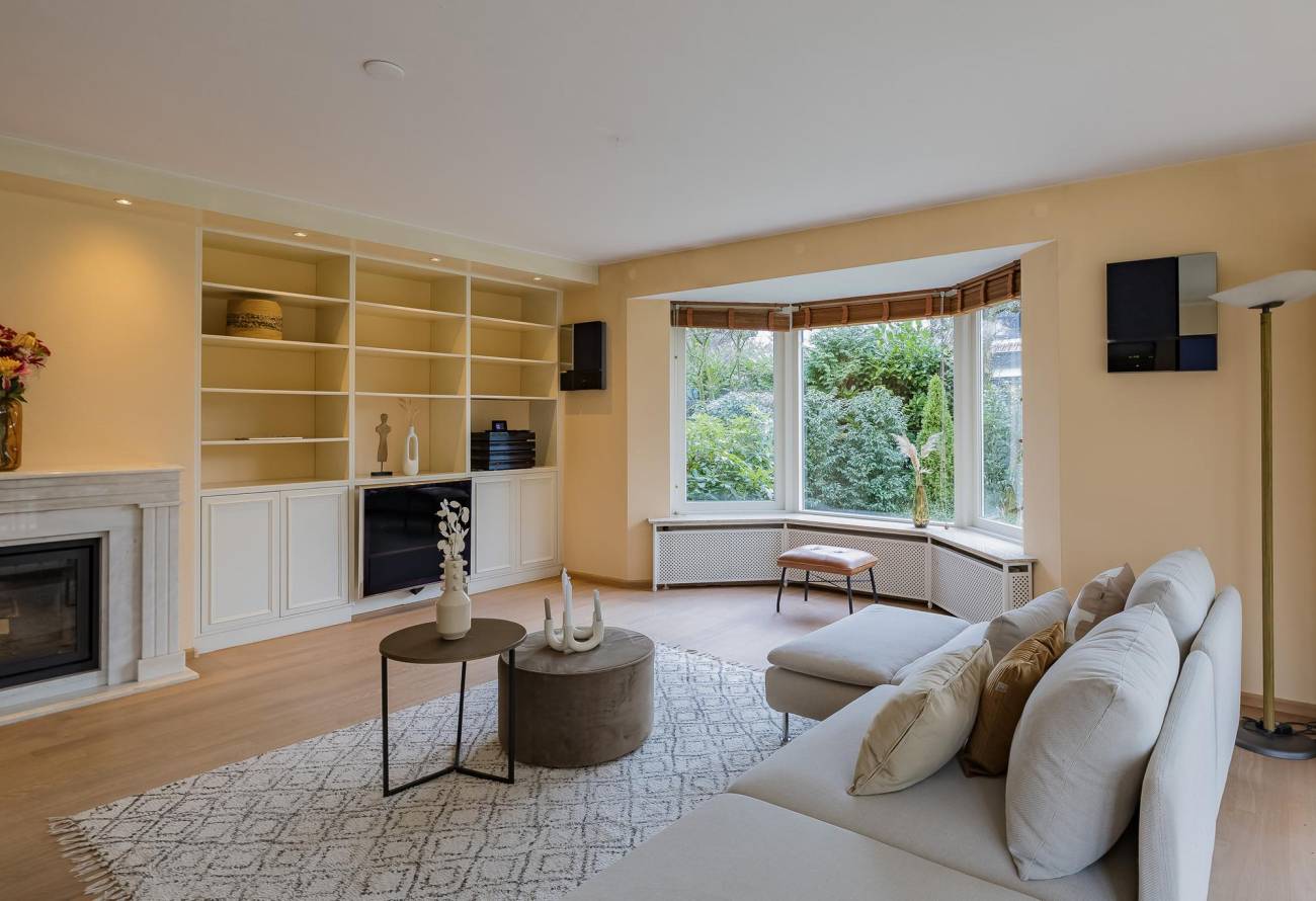 Ruime hal met gastentoilet, meterkast, garderobekast en toegangsdeur naar de woonkamer. De royale living biedt een ruime knusse zithoek bij de haard en de prachtige serre is een uitnodigende leefruimte met een fraai uitzicht over het Poelmeer en die het hele jaar door veel natuurlijk licht binnenbrengt. Ook in de werkkamer is er een verrassend uitzicht over het Poelmeer.