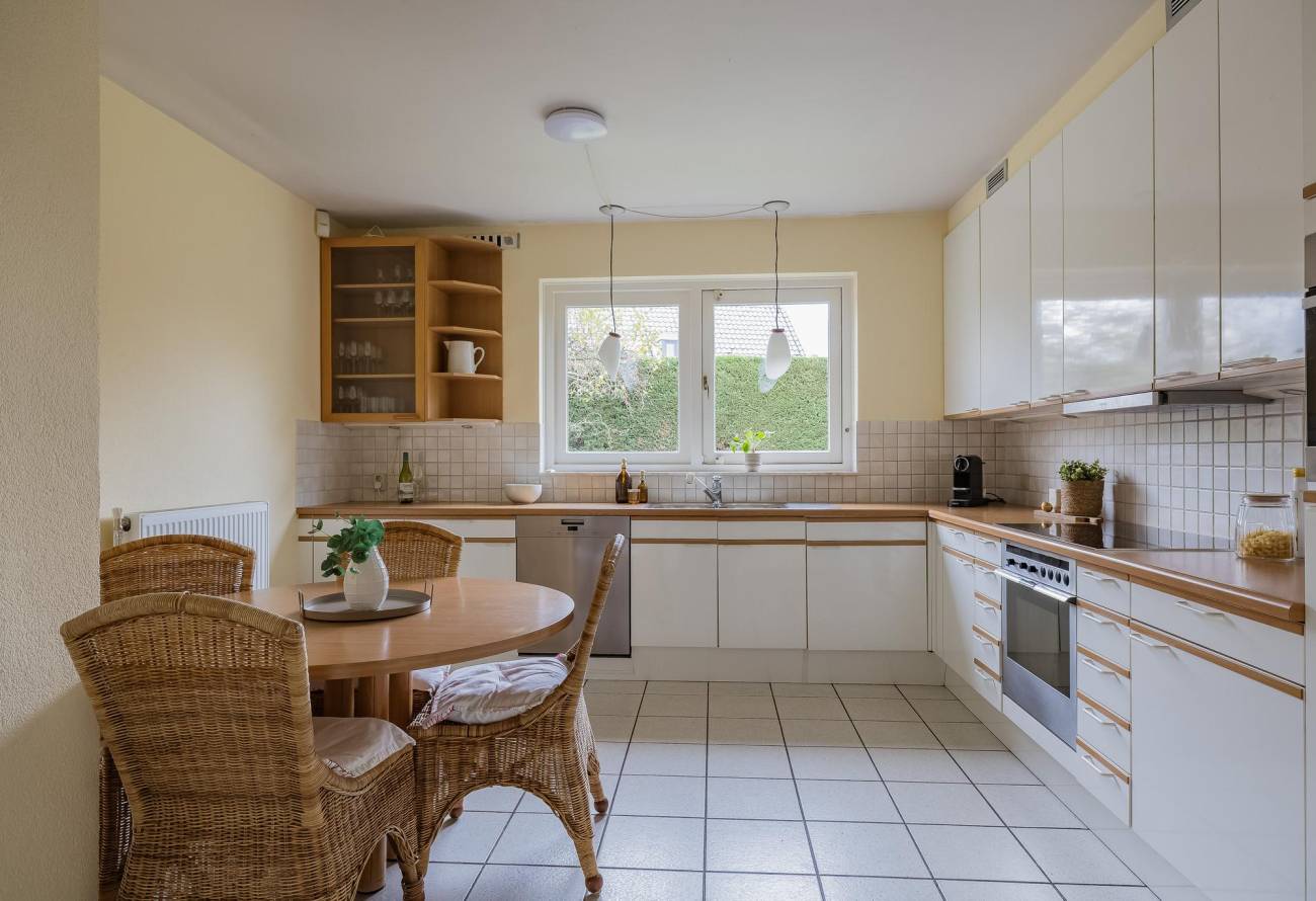 De ruime woonkeuken, voorzien van inbouwapparatuur, heeft toegang tot de bijkeuken welke ideaal is voor voorraad en als bergruimte.