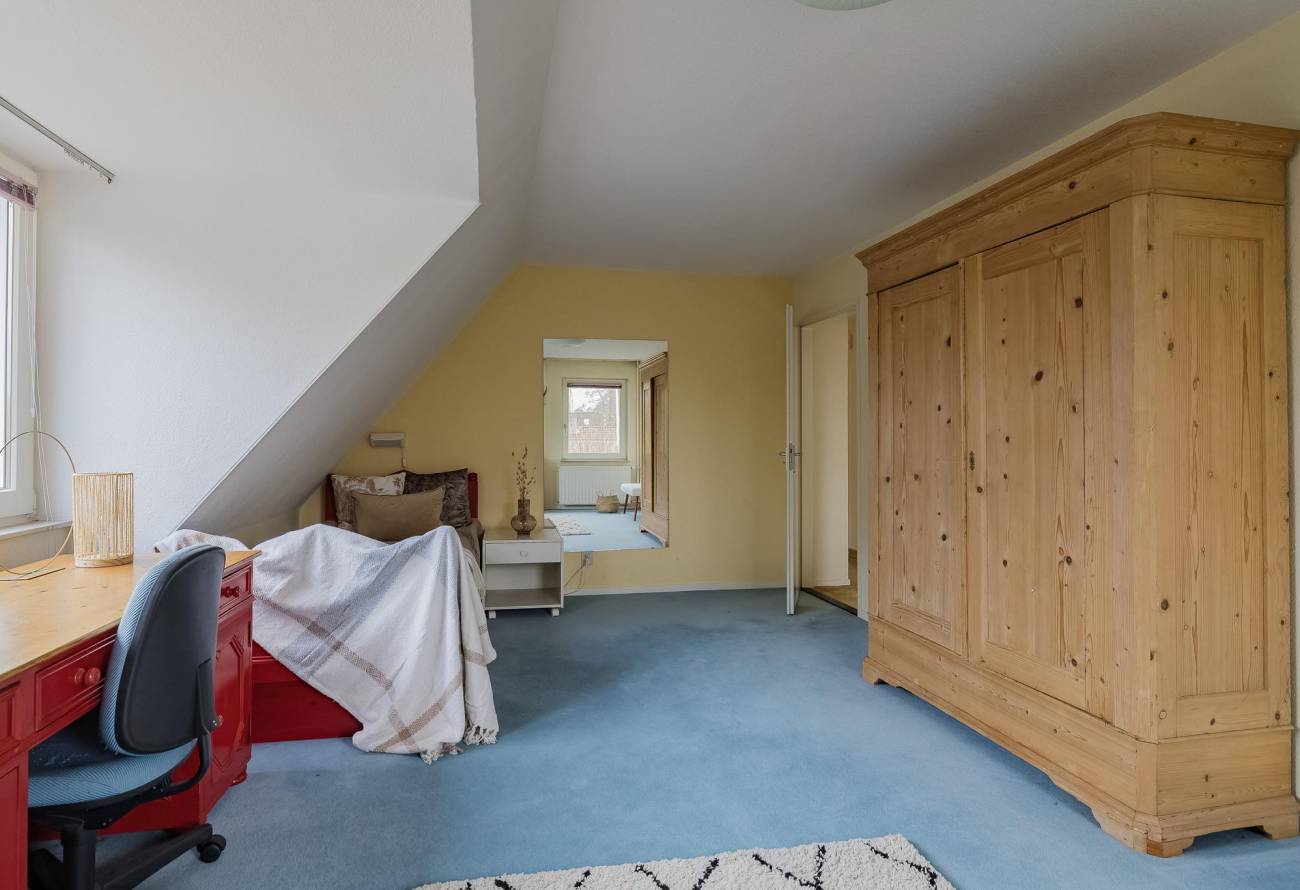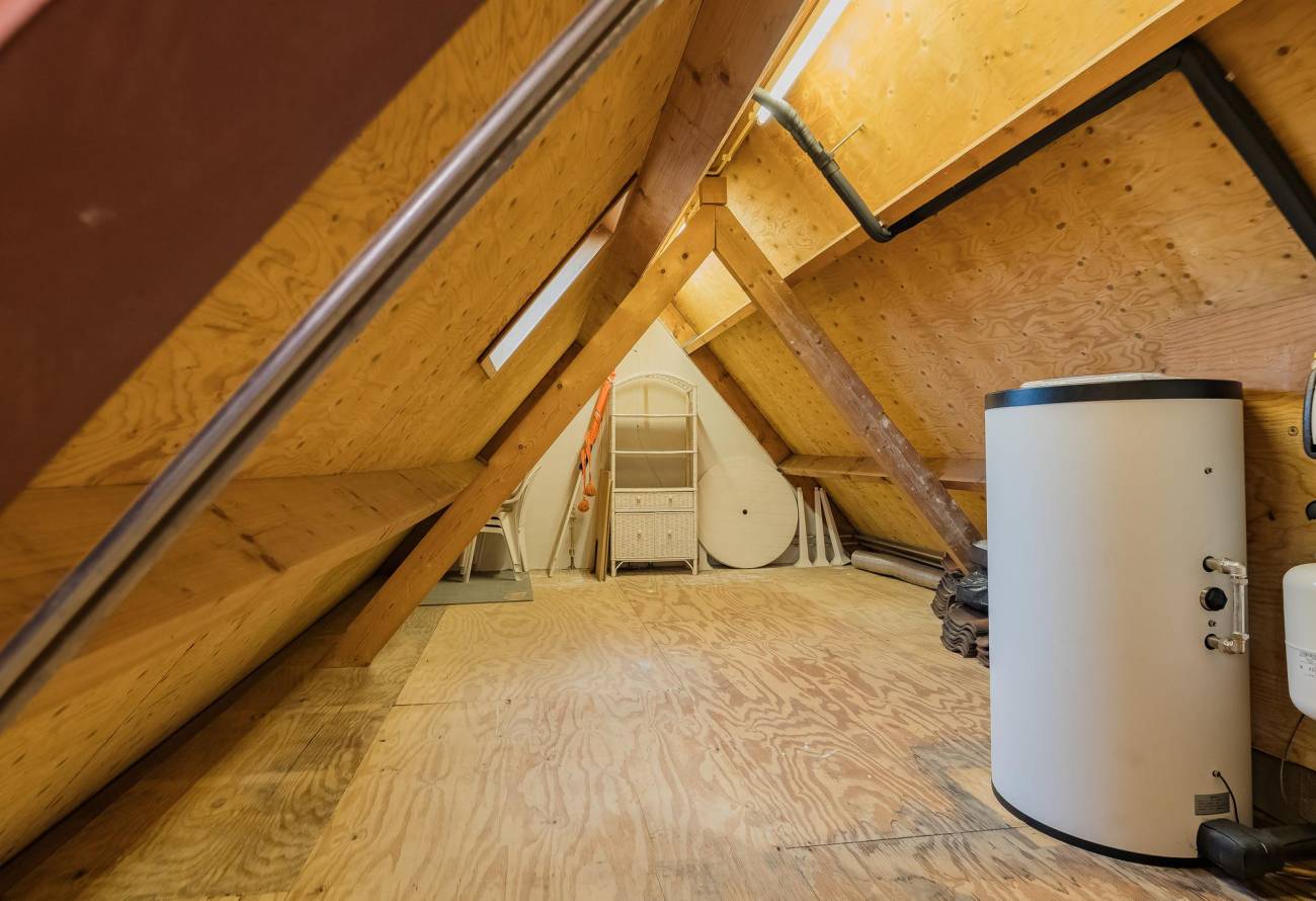 De zolderverdieping is ingericht als au-pair unit met een ruime slaap-/woonkamer, een pantry en een eigen badkamer. Tevens is hier een bergruimte met cv-ketel, boiler en solarsysteem. Velux dakramen zorgen voor een prettige lichtinval.