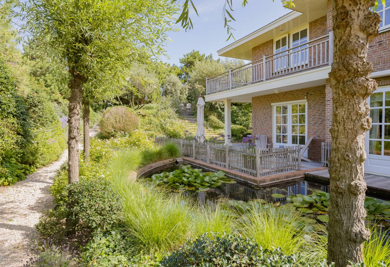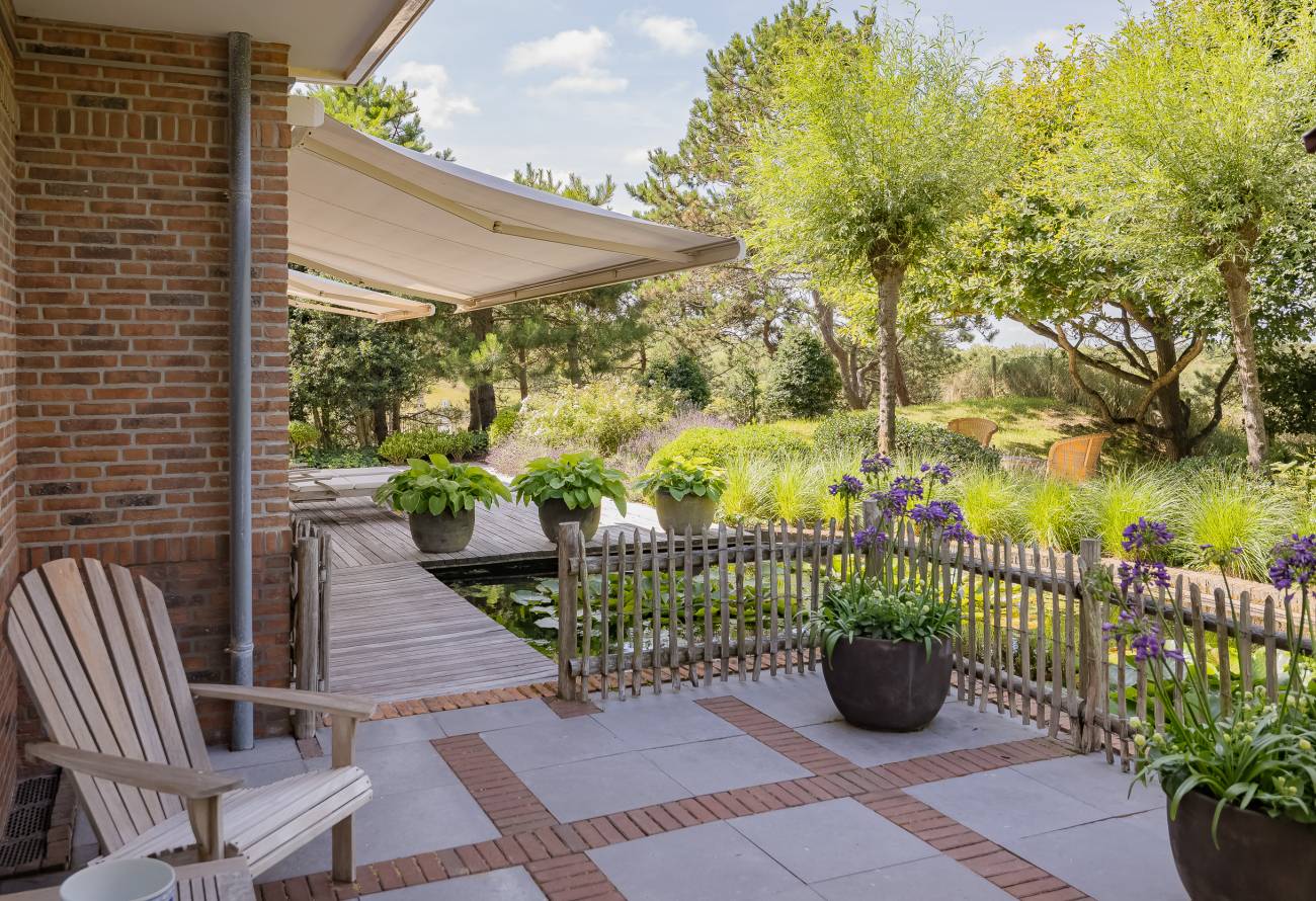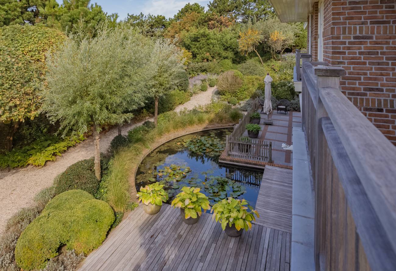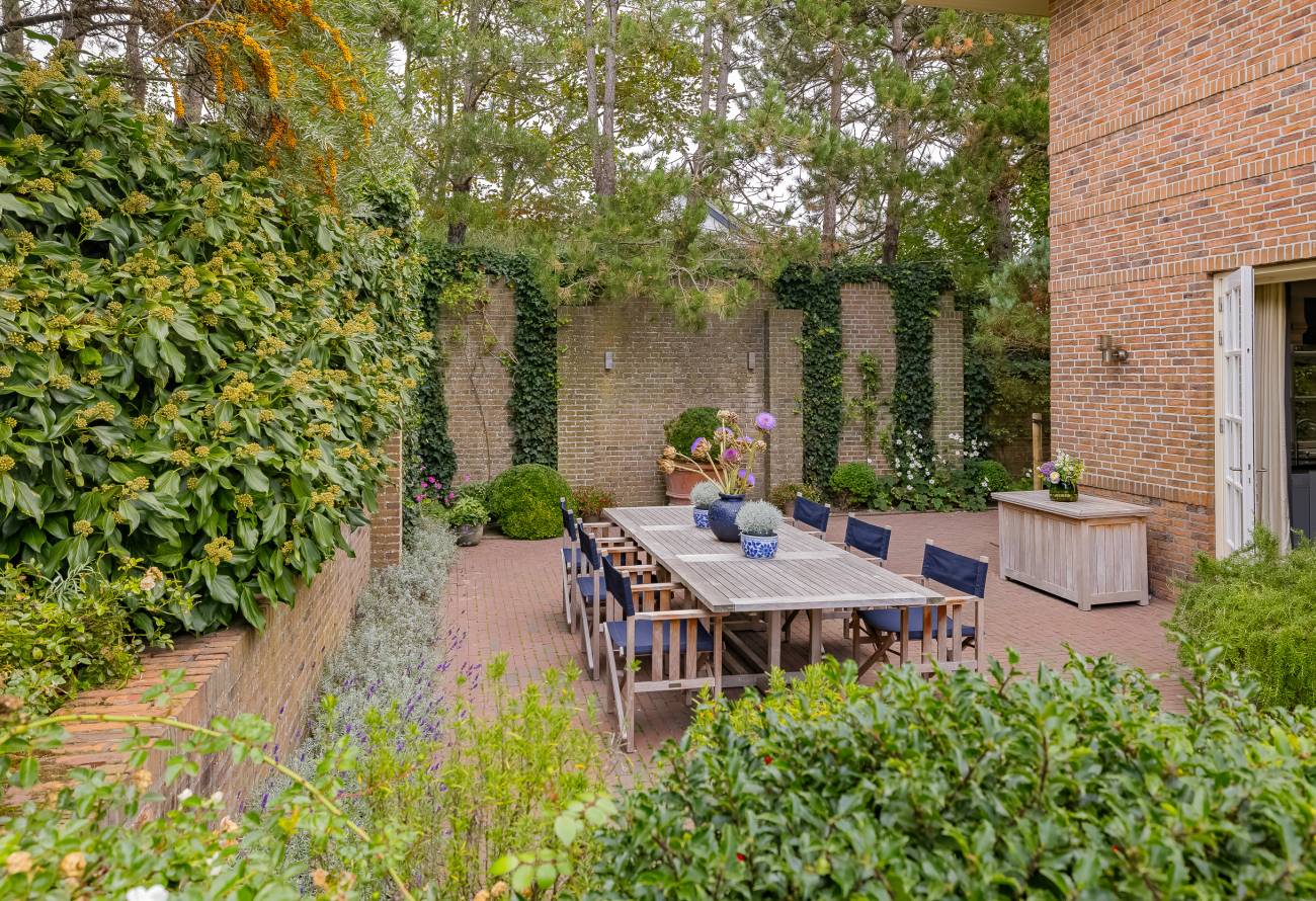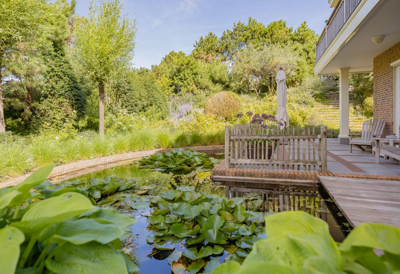 De tuin is werkelijk betoverend. Onder architectuur van Arend Jan van der Horst aangelegd, glooit hij mee met het duinlandschap en biedt een oase van rust en schoonheid. Terrassen, diverse zitplekken, grote bomen, rijkbloeiende borders, een vijver met vlonderterras en sierlijke schelpenpaden zorgen voor een unieke buitenbeleving. Een plek om eindeloos te genieten.