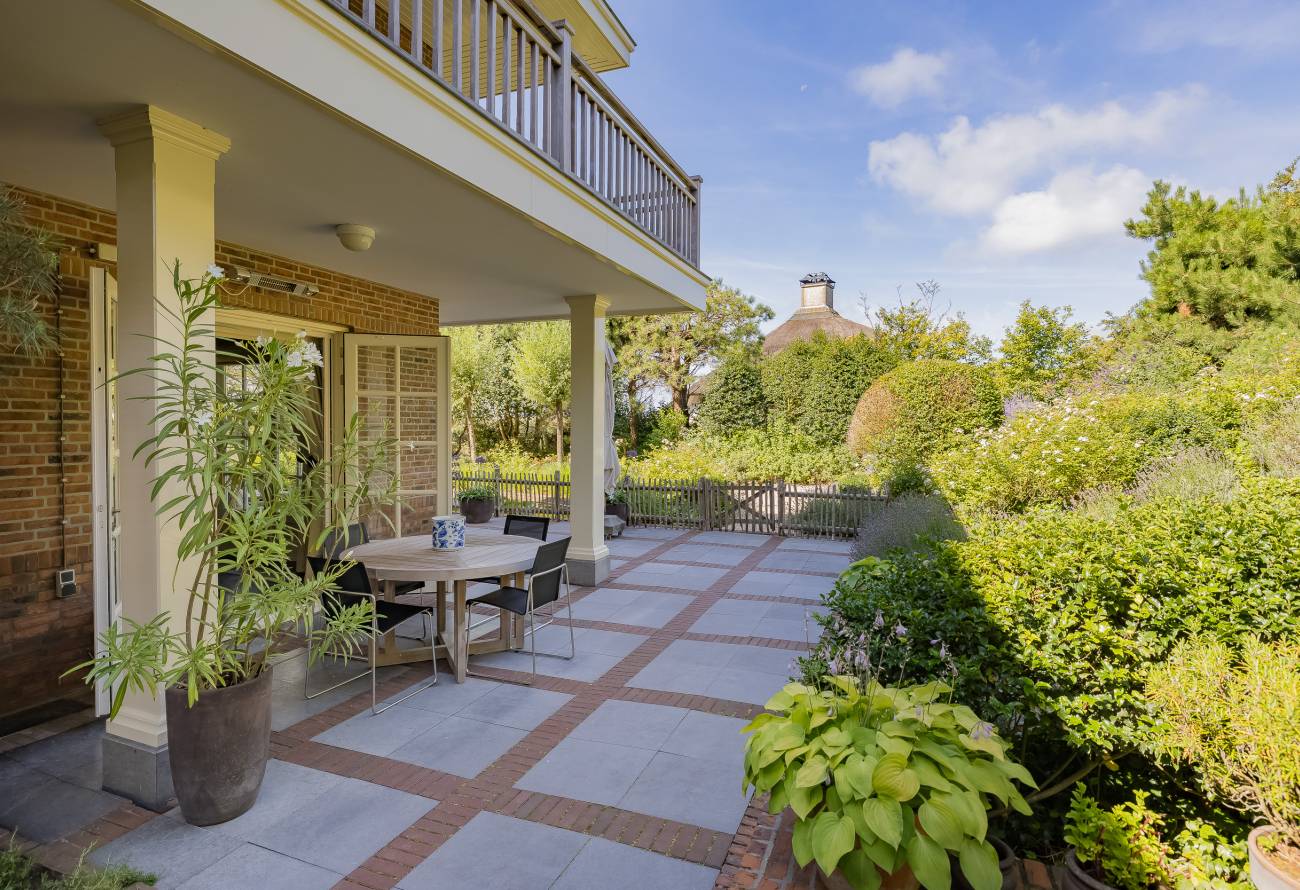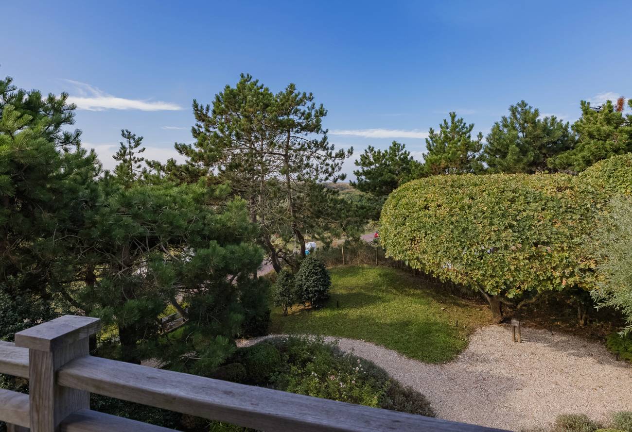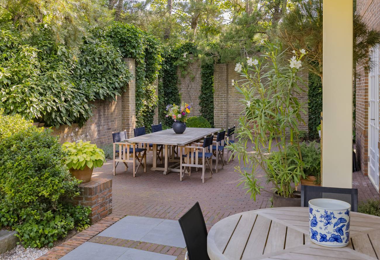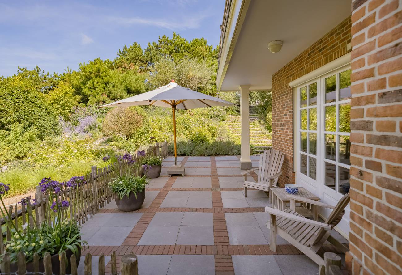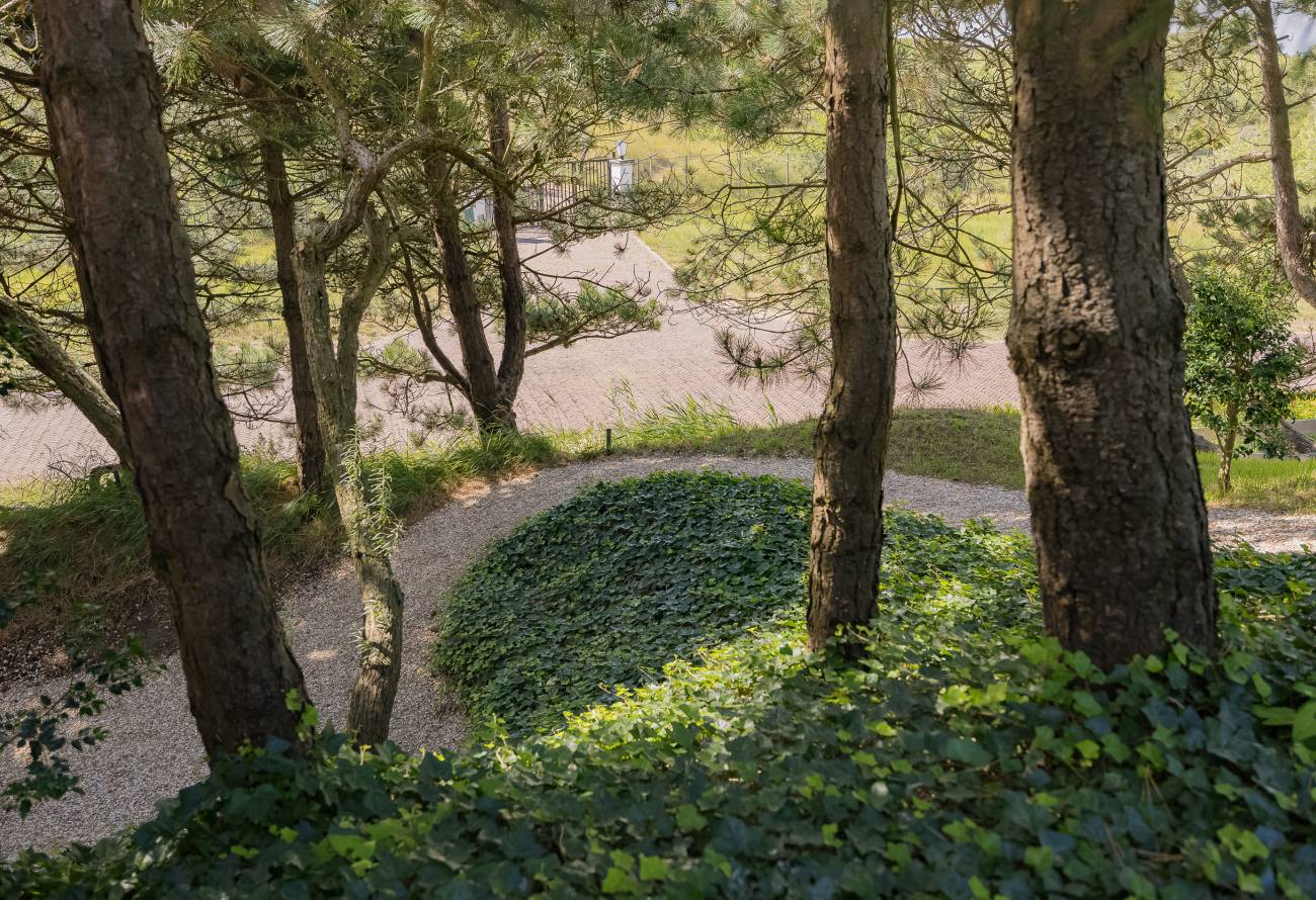 De tuin is werkelijk betoverend. Onder architectuur van Arend Jan van der Horst aangelegd, glooit hij mee met het duinlandschap en biedt een oase van rust en schoonheid. Terrassen, diverse zitplekken, grote bomen, rijkbloeiende borders, een vijver met vlonderterras en sierlijke schelpenpaden zorgen voor een unieke buitenbeleving. Een plek om eindeloos te genieten.