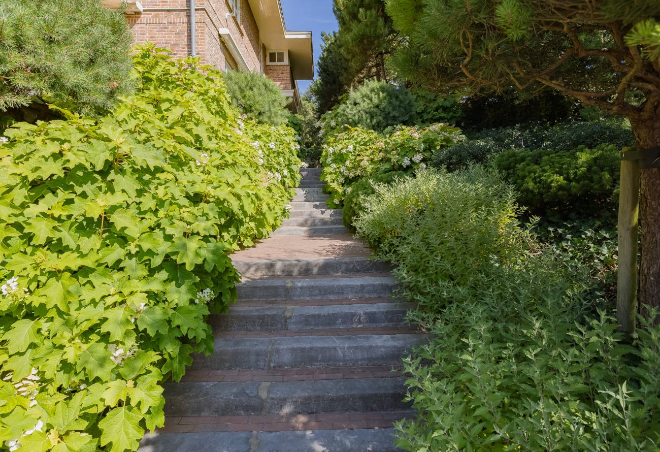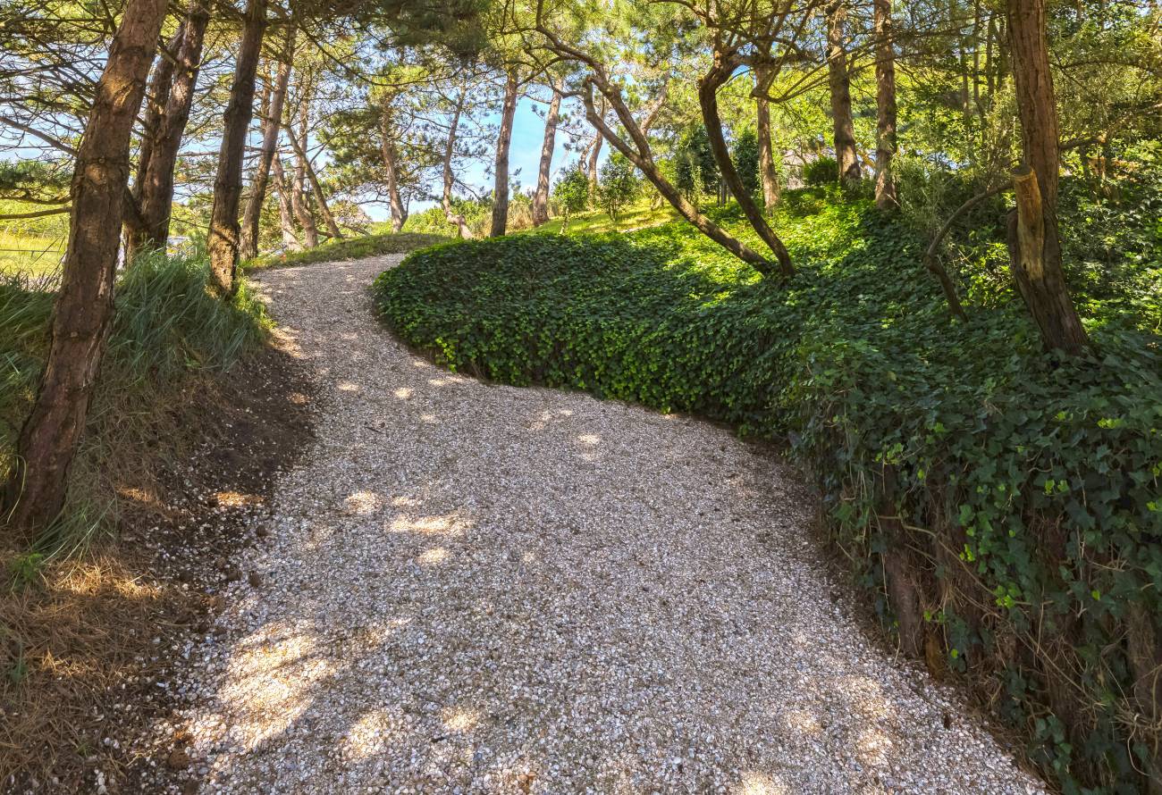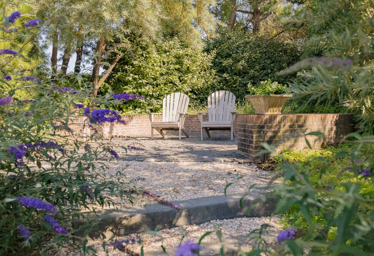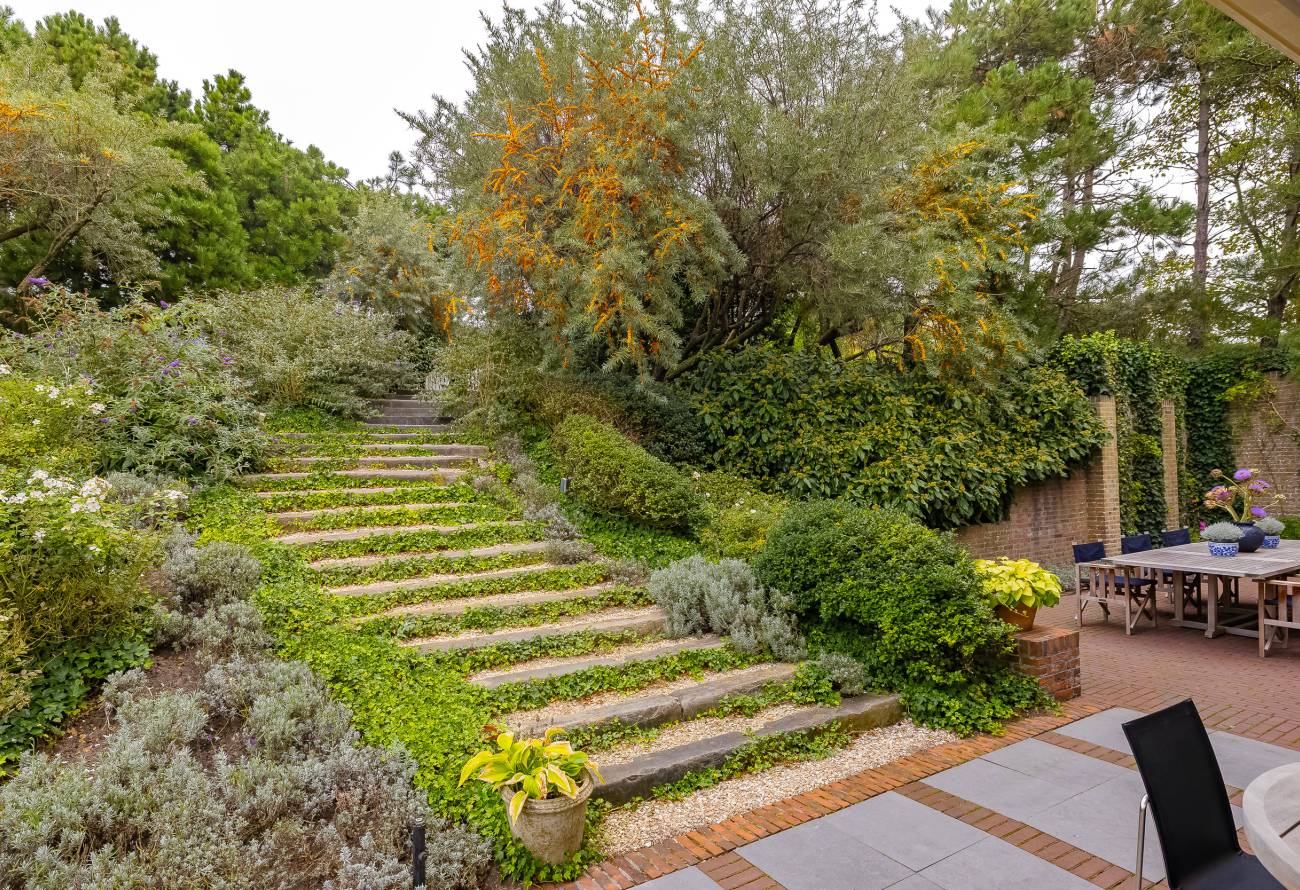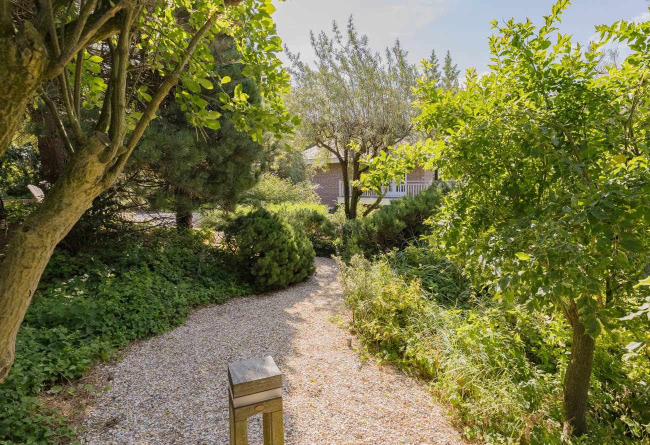 De tuin is werkelijk betoverend. Onder architectuur van Arend Jan van der Horst aangelegd, glooit hij mee met het duinlandschap en biedt een oase van rust en schoonheid. Terrassen, diverse zitplekken, grote bomen, rijkbloeiende borders, een vijver met vlonderterras en sierlijke schelpenpaden zorgen voor een unieke buitenbeleving. Een plek om eindeloos te genieten.
