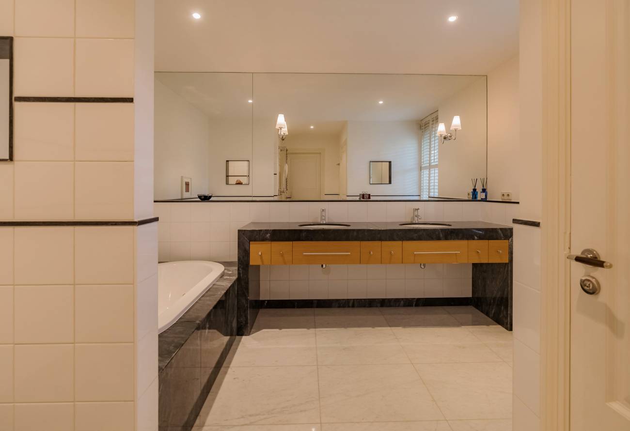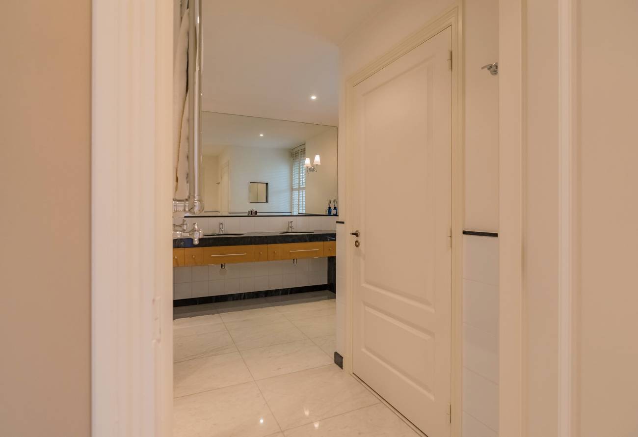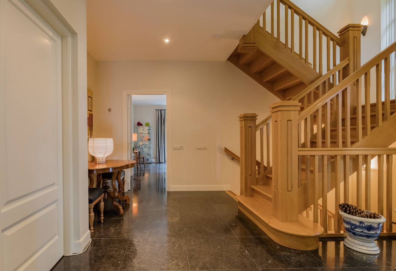Een fraaie bordestrap leidt naar de eerste verdieping met vier ruime slaapkamers. De hoofdslaapkamer beschikt over een eigen kleedkamer, een luxe badkamer met apart toilet en een groot zonnig balkon. Daarnaast is er een tweede badkamer, een aparte toiletruimte, een praktische wasruimte en volop kastruimte aanwezig.
