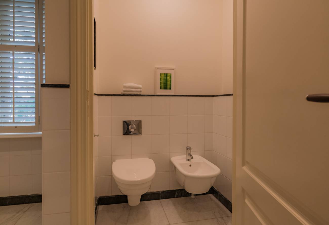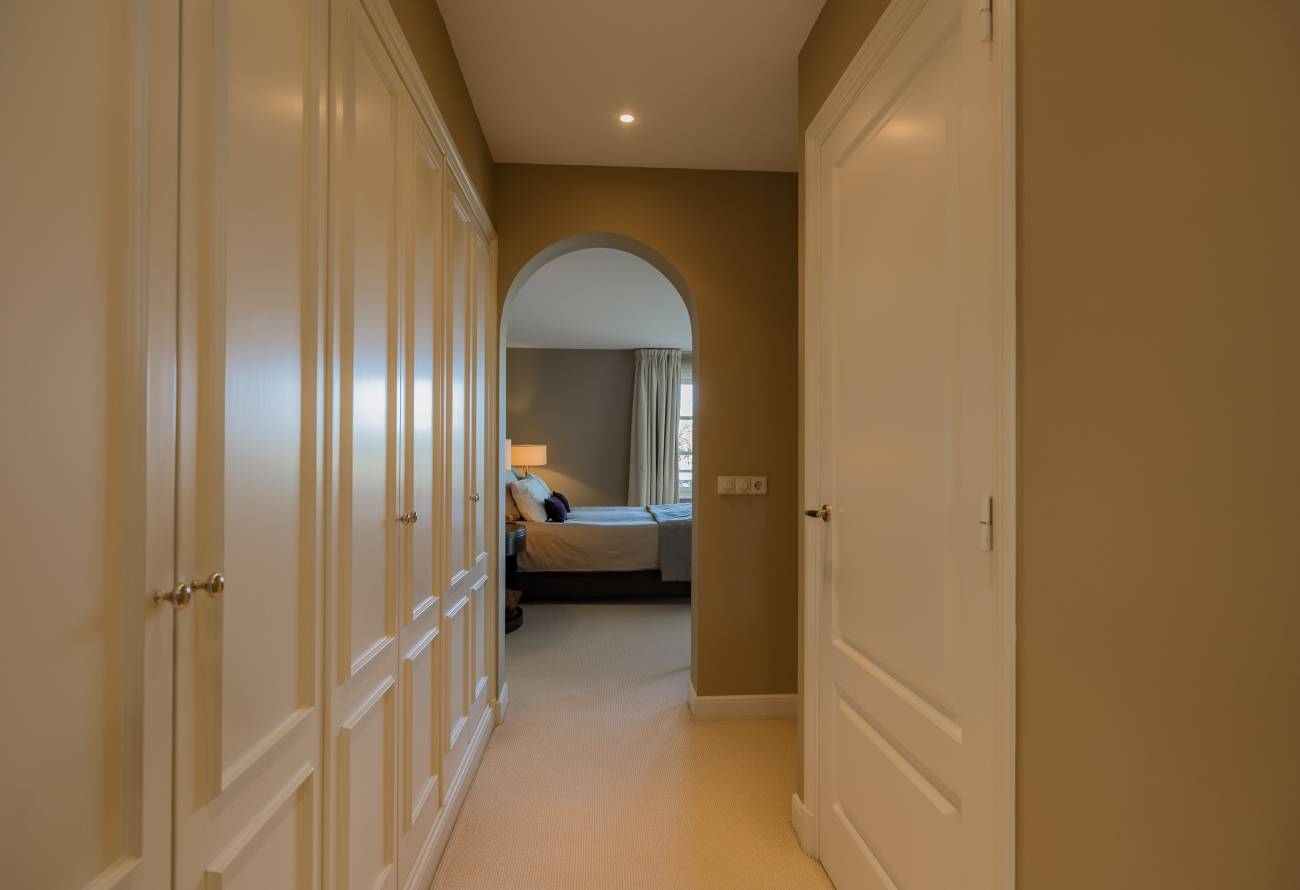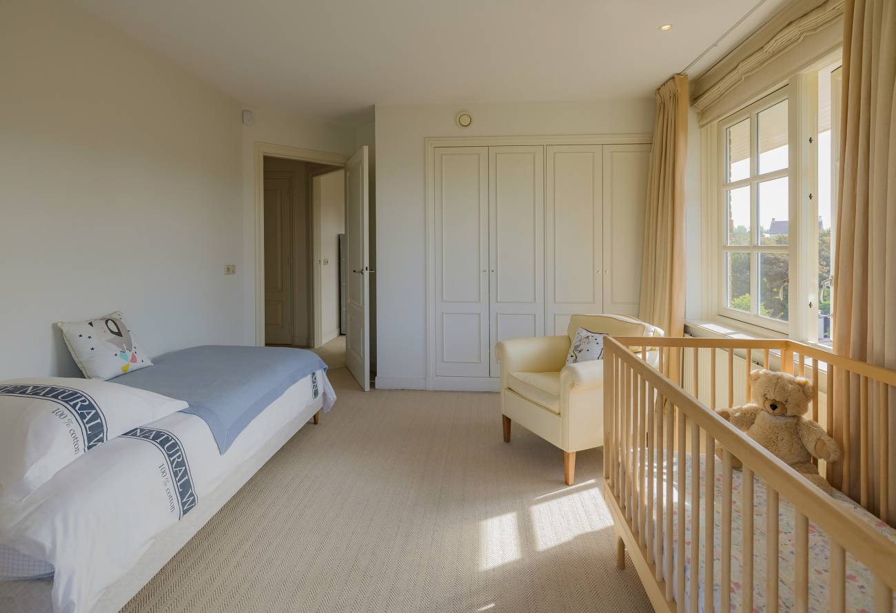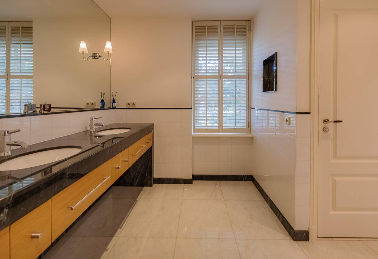 Een fraaie bordestrap leidt naar de eerste verdieping met vier ruime slaapkamers. De hoofdslaapkamer beschikt over een eigen kleedkamer, een luxe badkamer met apart toilet en een groot zonnig balkon. Daarnaast is er een tweede badkamer, een aparte toiletruimte, een praktische wasruimte en volop kastruimte aanwezig.