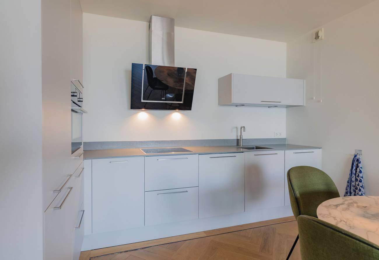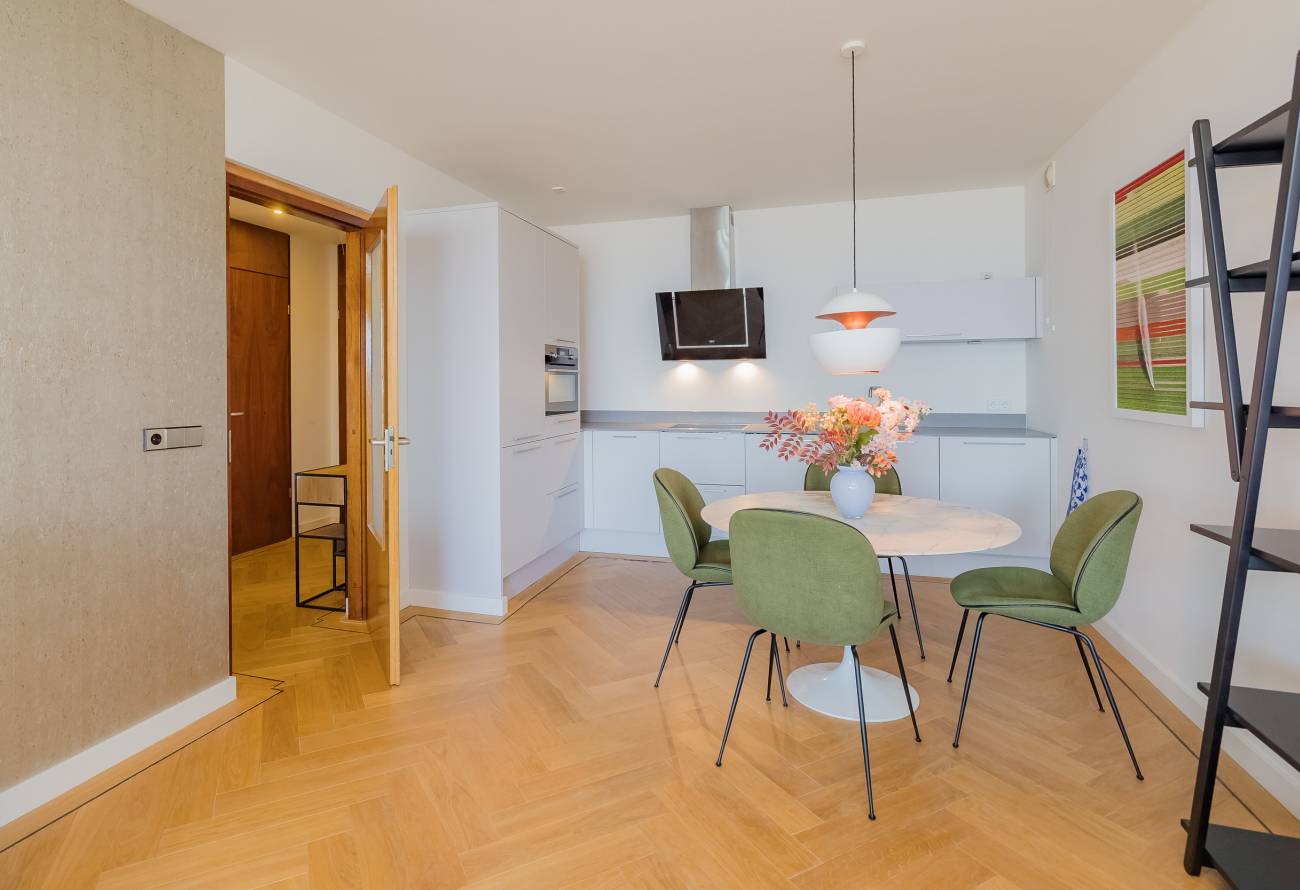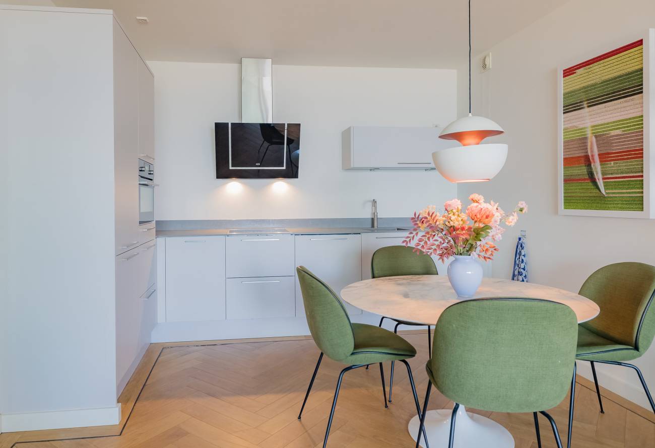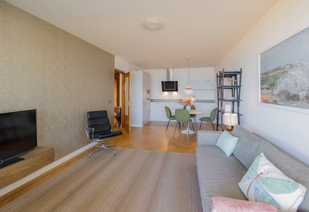 Het praktisch ingerichte appartement heeft een hal met toegang tot alle kamers. De lichte woonkamer heeft een eikenhouten vloer en een grote schuifpui, de moderne, open keuken is voorzien van een inductiekookplaat, een afzuigkap, een koel/vriescombinatie, een combi oven/magnetron, een vaatwasmachine en een Quooker.