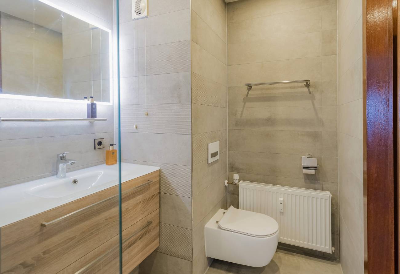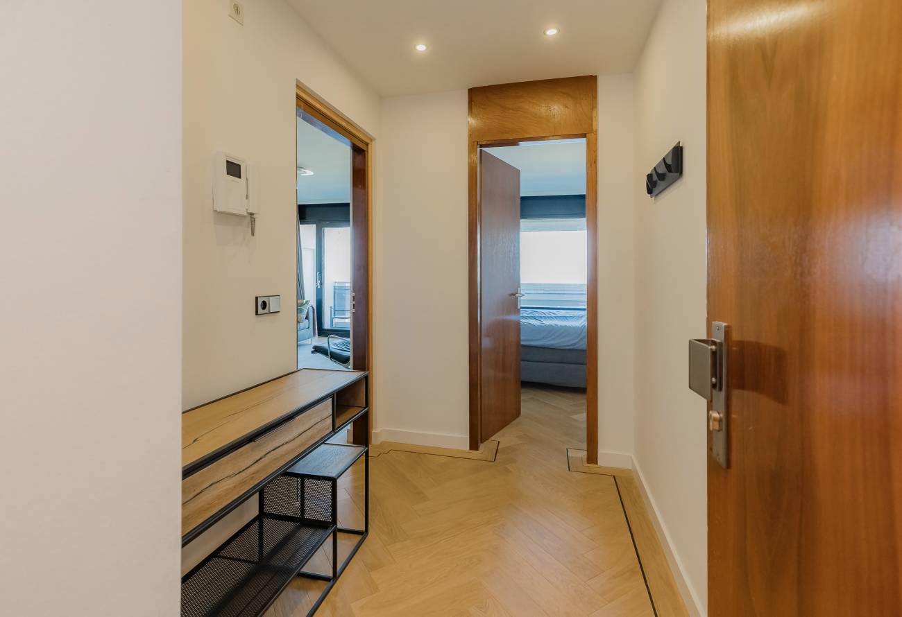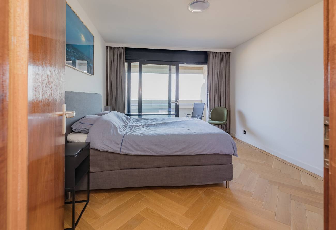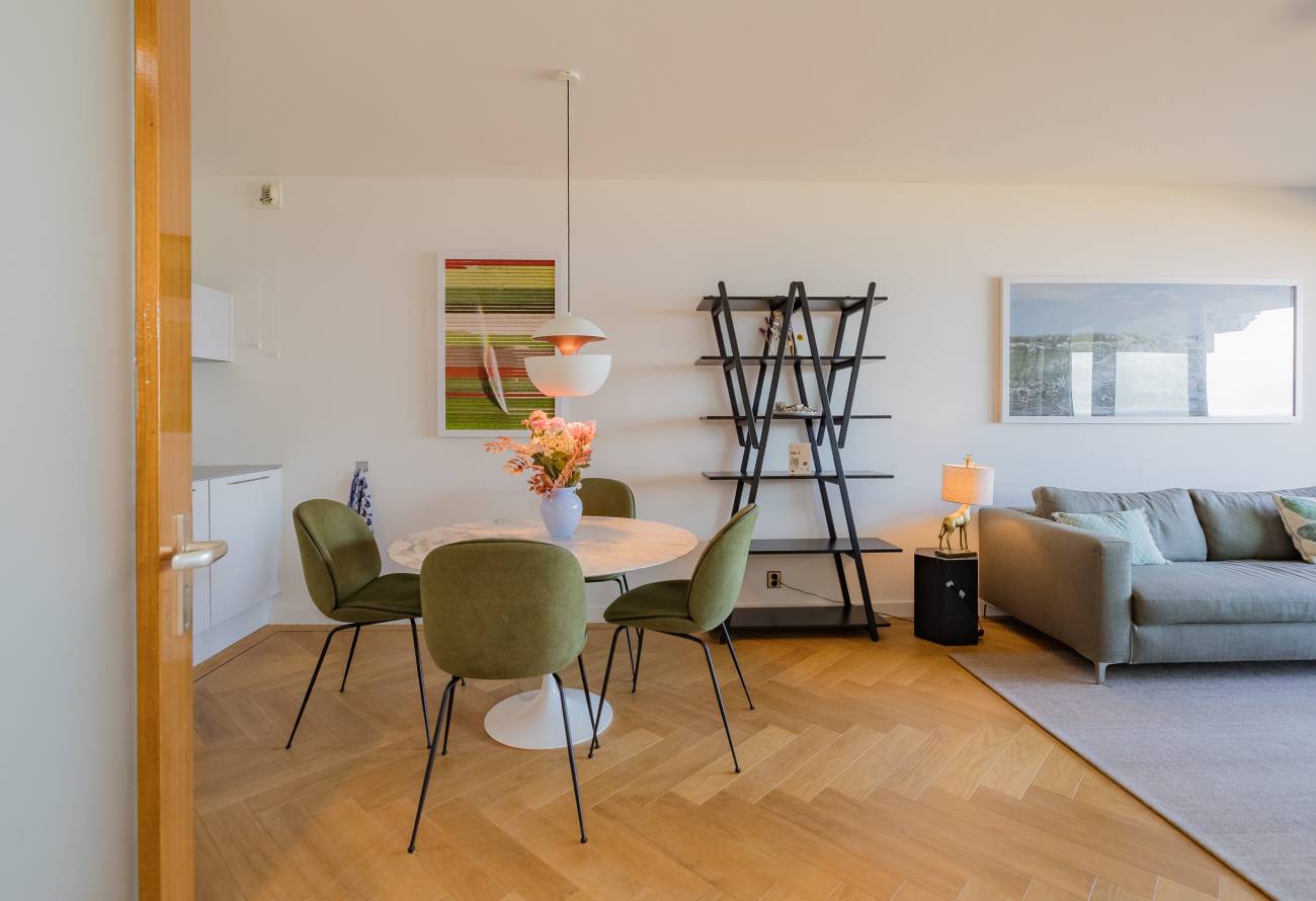 Het praktisch ingerichte appartement heeft een hal met toegang tot alle kamers. De lichte woonkamer heeft een eikenhouten vloer en een grote schuifpui, de moderne, open keuken is voorzien van een inductiekookplaat, een afzuigkap, een koel/vriescombinatie, een combi oven/magnetron, een vaatwasmachine en een Quooker.