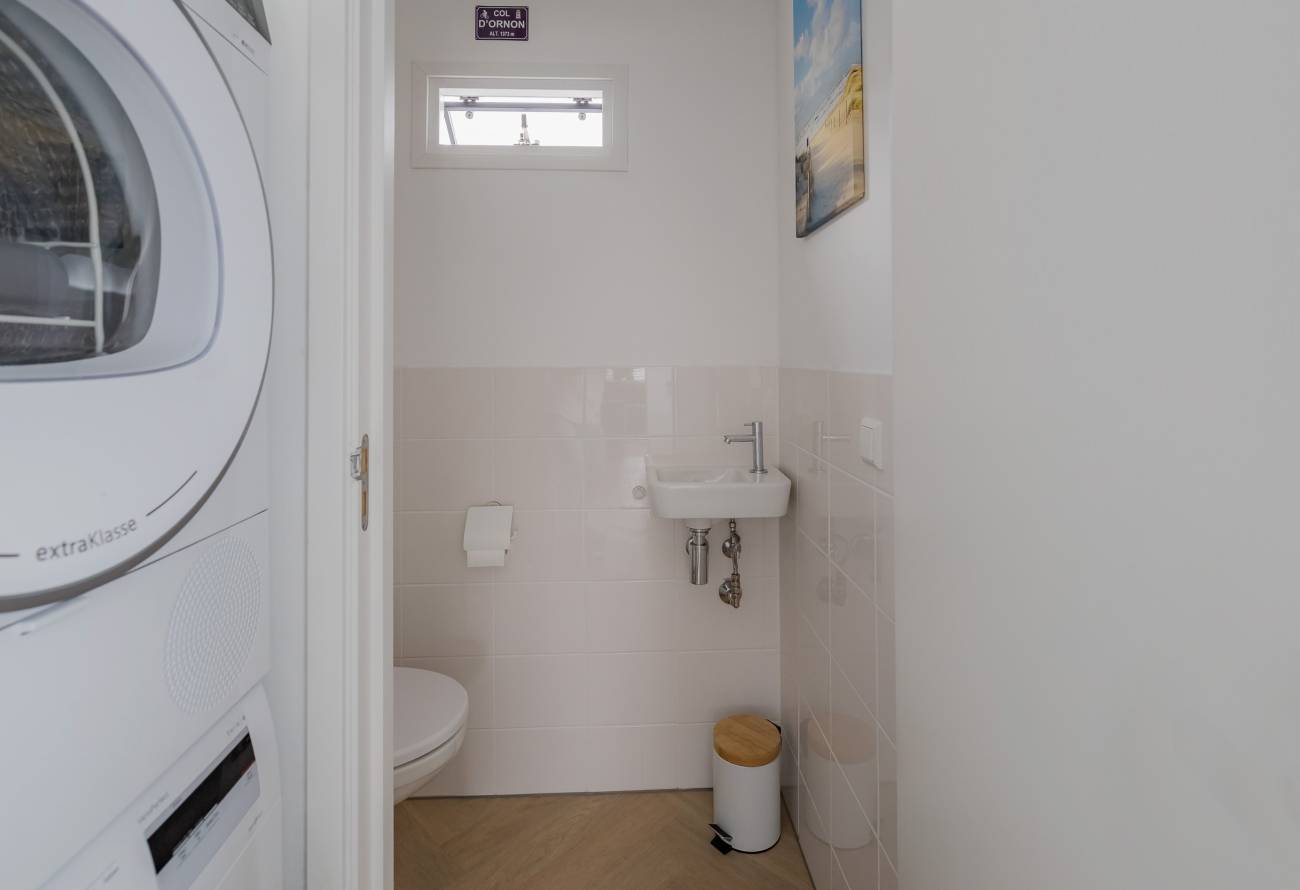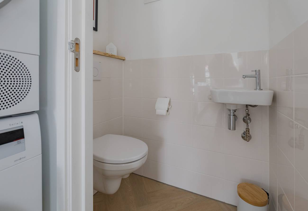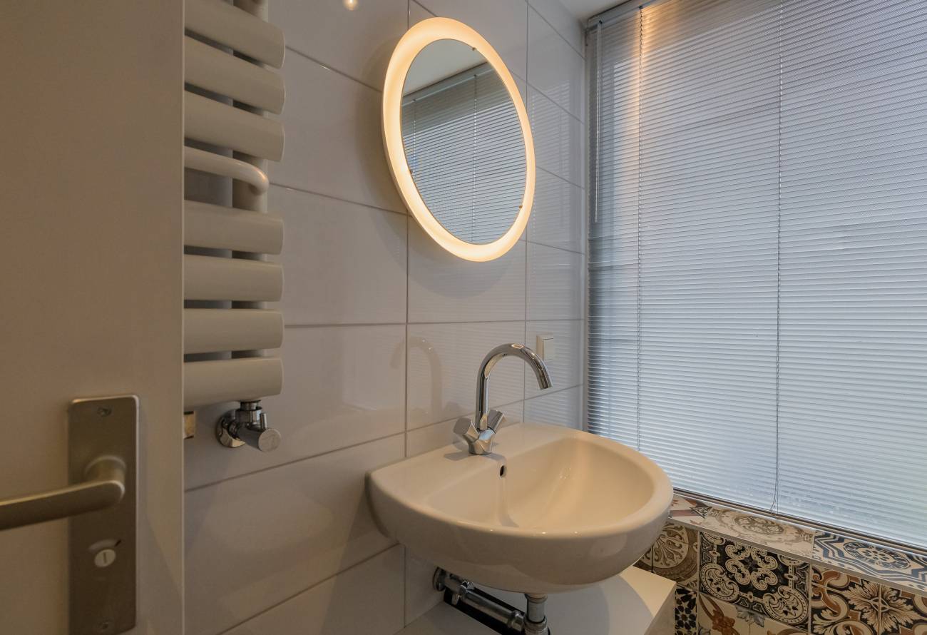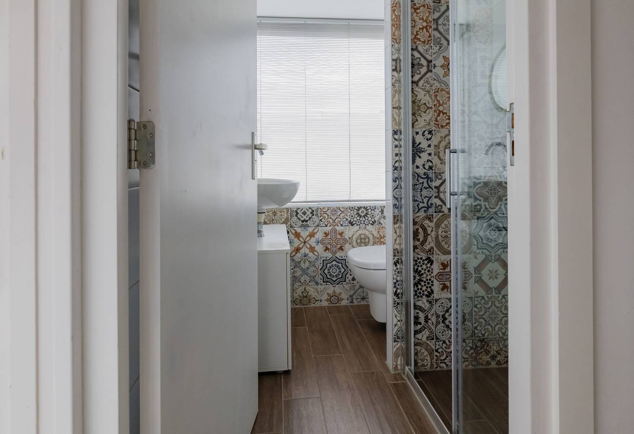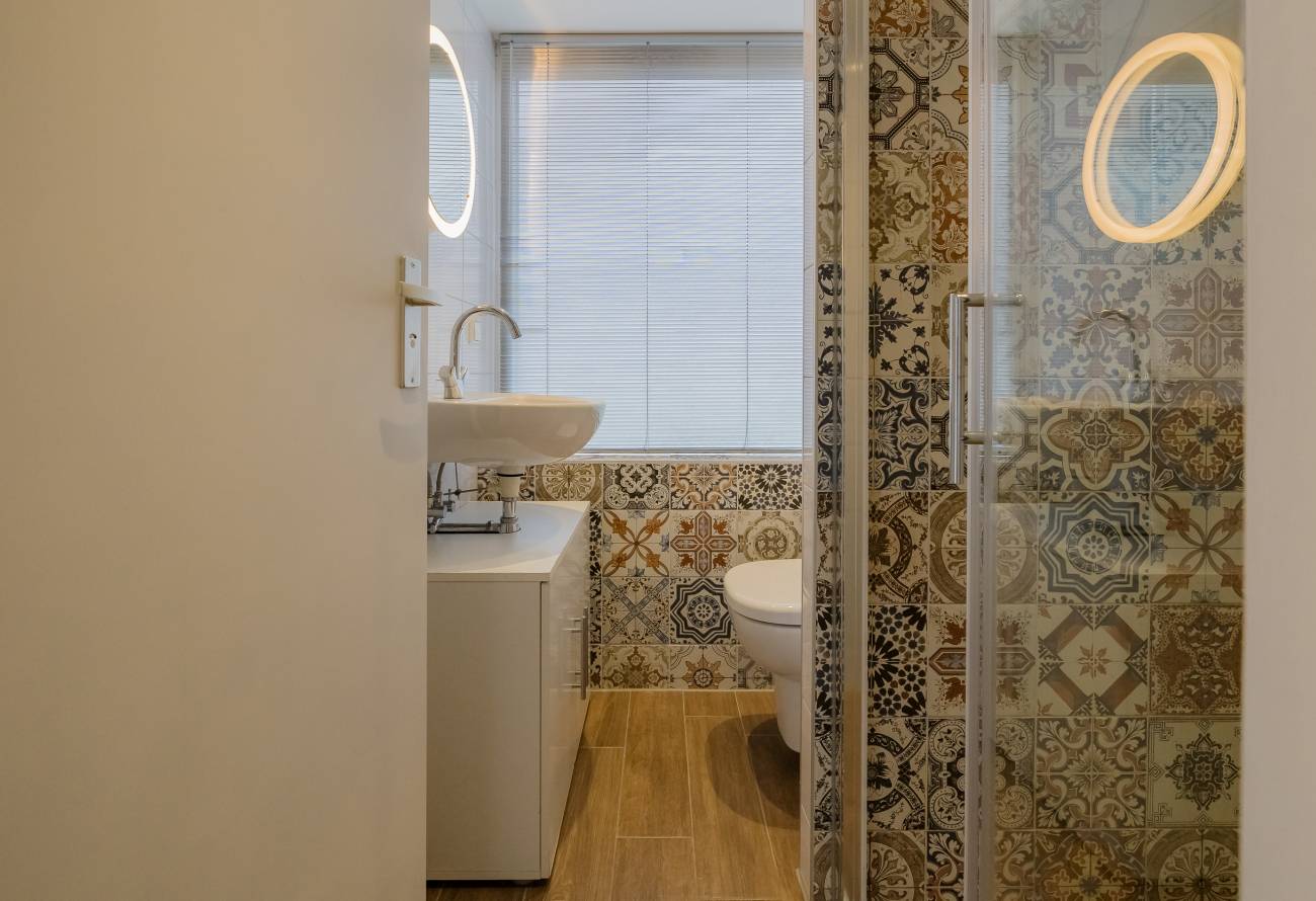 De moderne badkamer is praktisch ingedeeld met douche, wastafel en toilet.