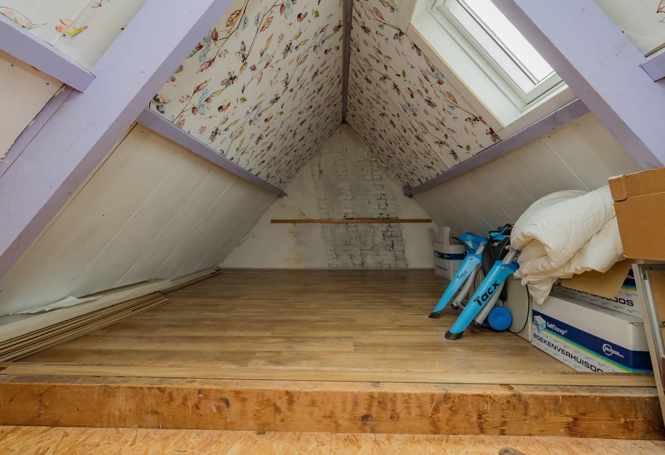 Via een vlizotrap bereik je de ruime bergzolder met dakraam en de cv-installatie.