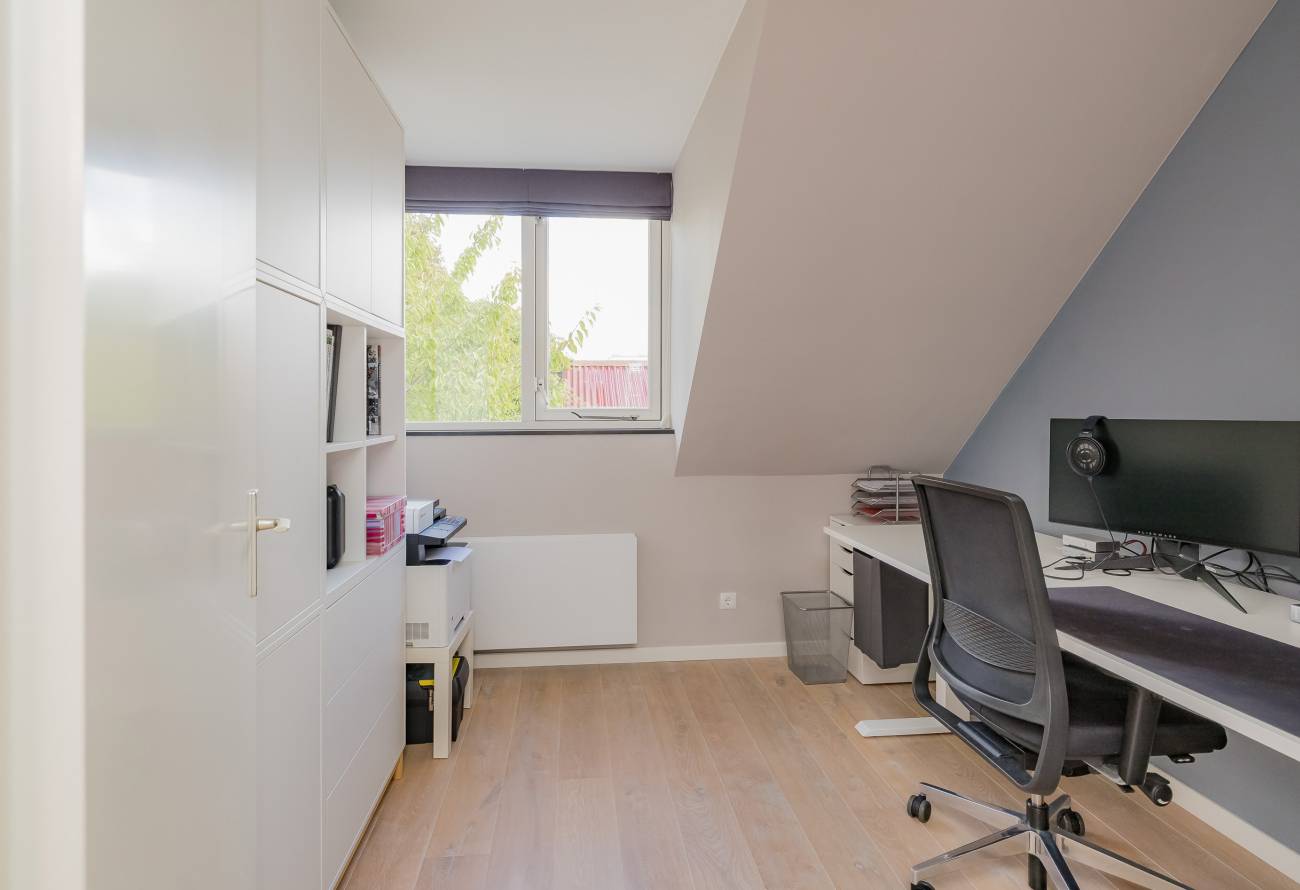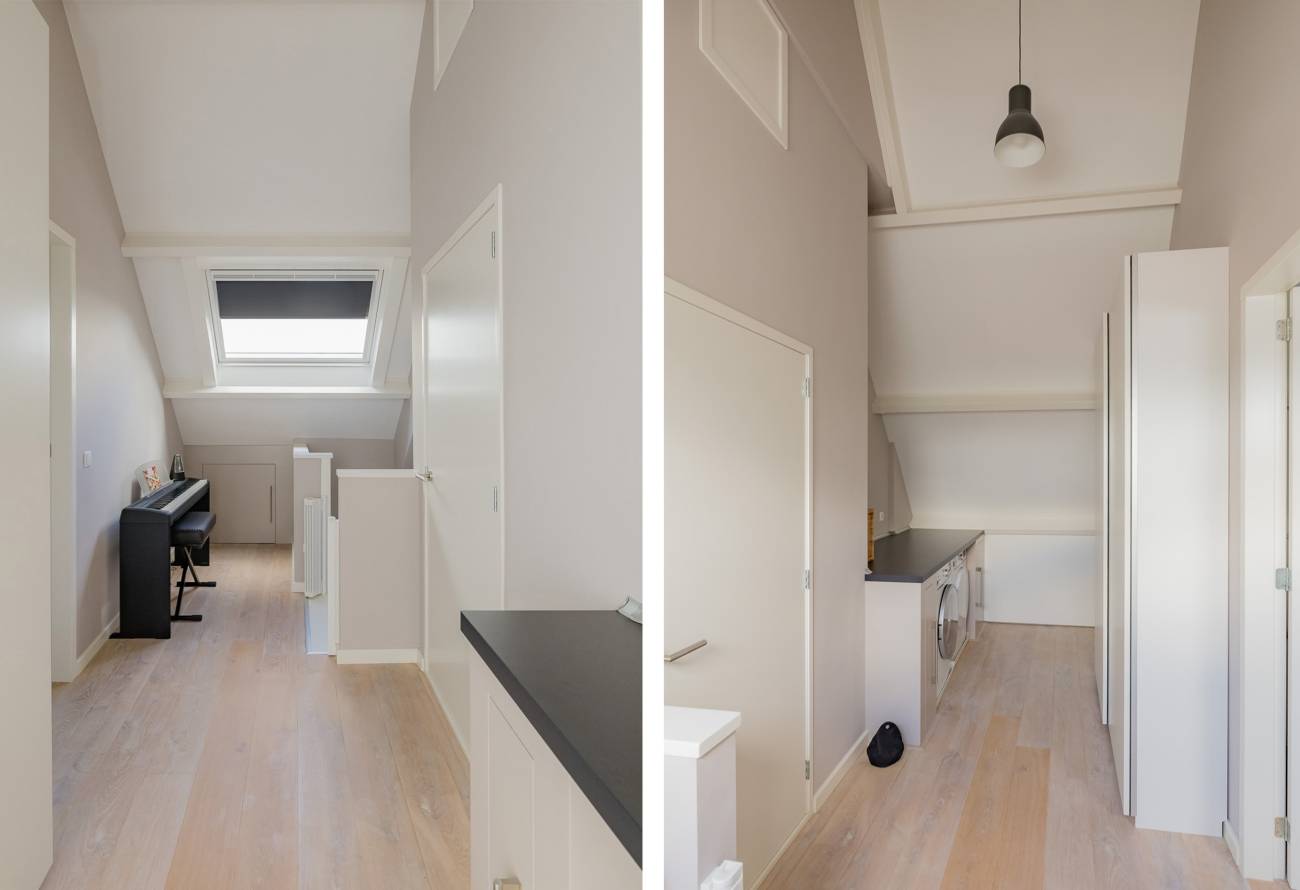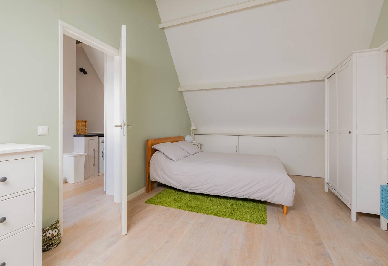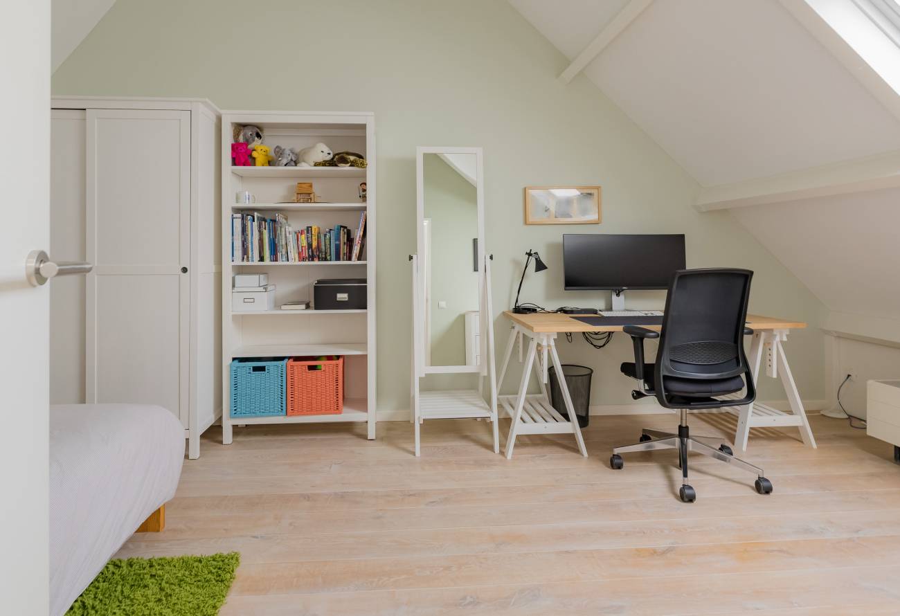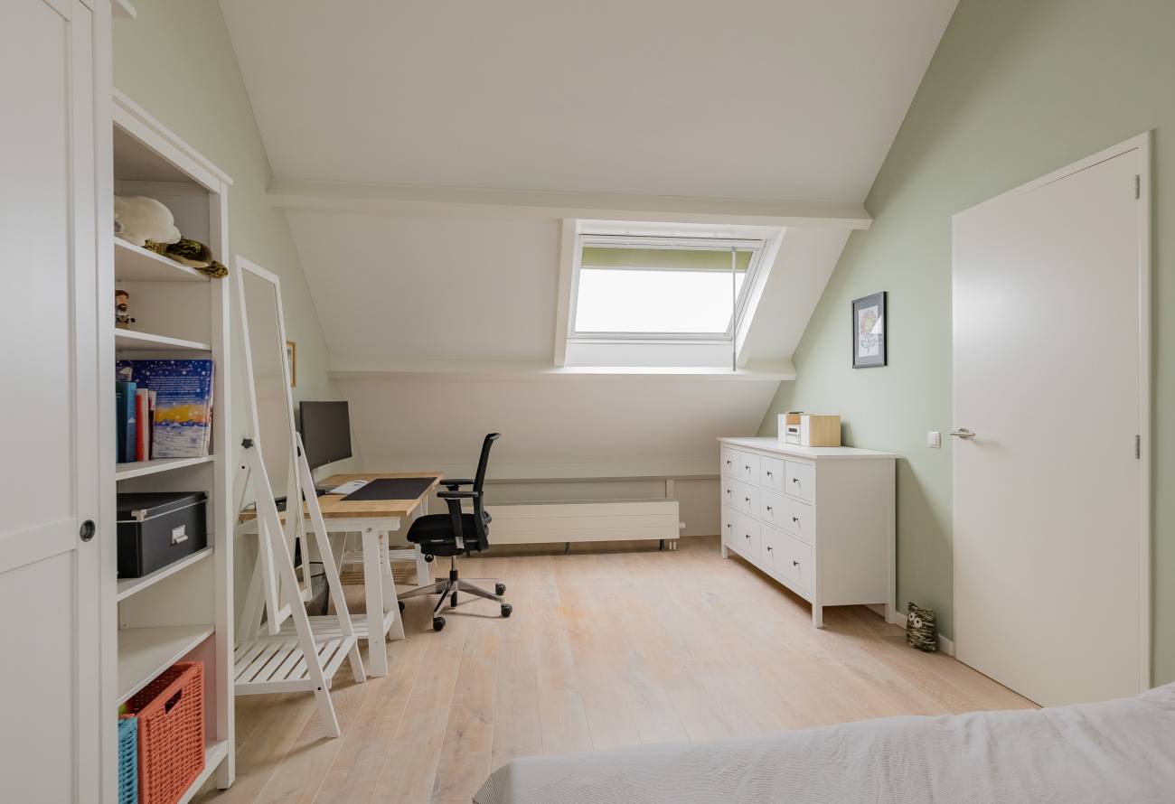 Hier vind je een royale zolderslaapkamer met Velux dakraam. Deze ruimte is zo groot dat je hier zelfs twee slaapkamers van kunt maken. Op de overloop is een mooi wandmeubel voor de wasmachine, droger, de cv-installatie en de mechanische ventilatie. Een mooi afgewerkte verdieping.