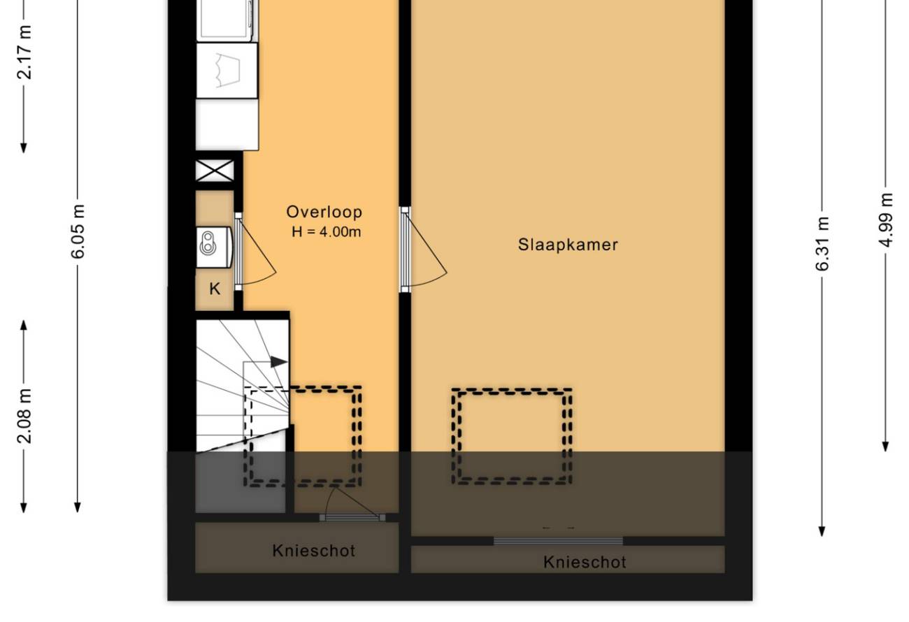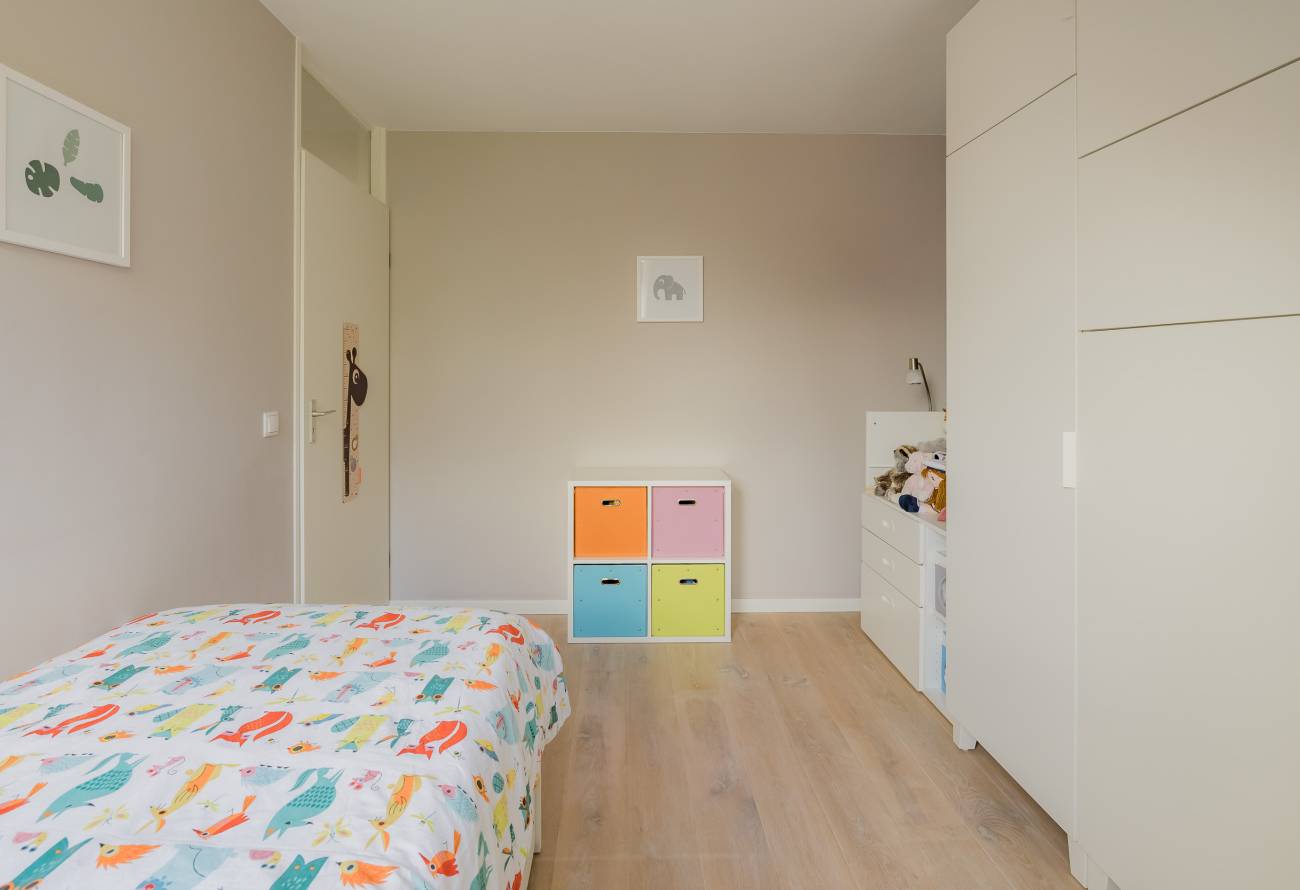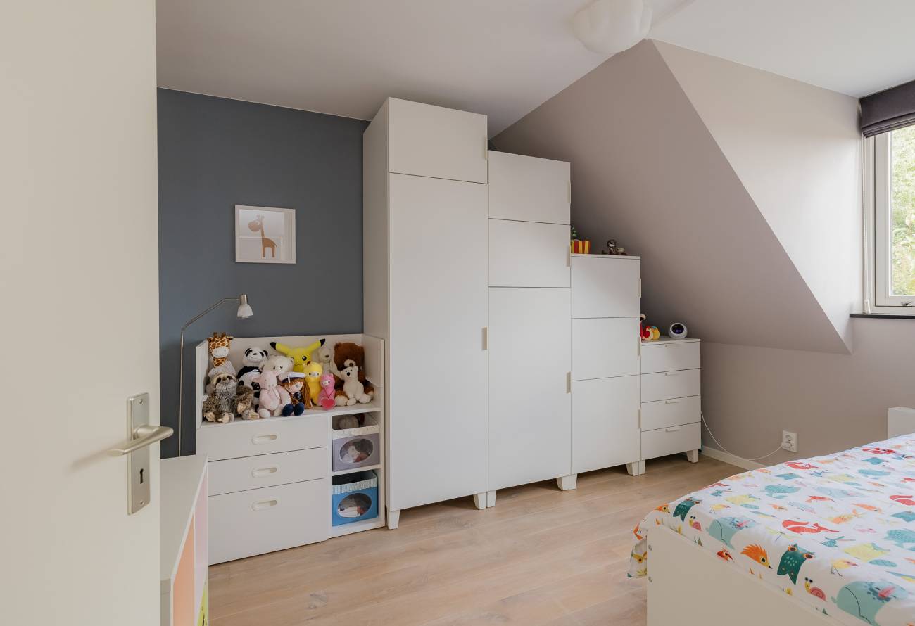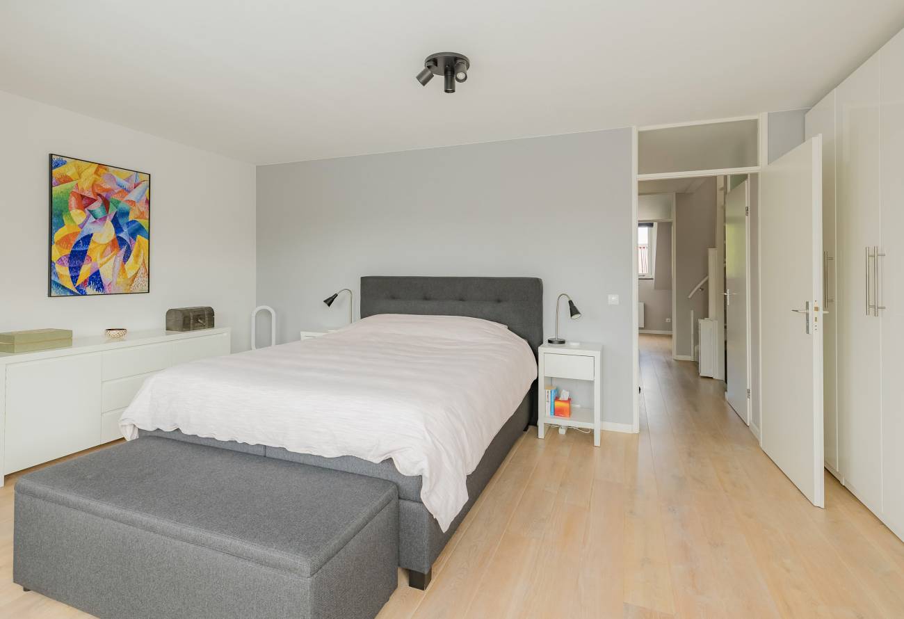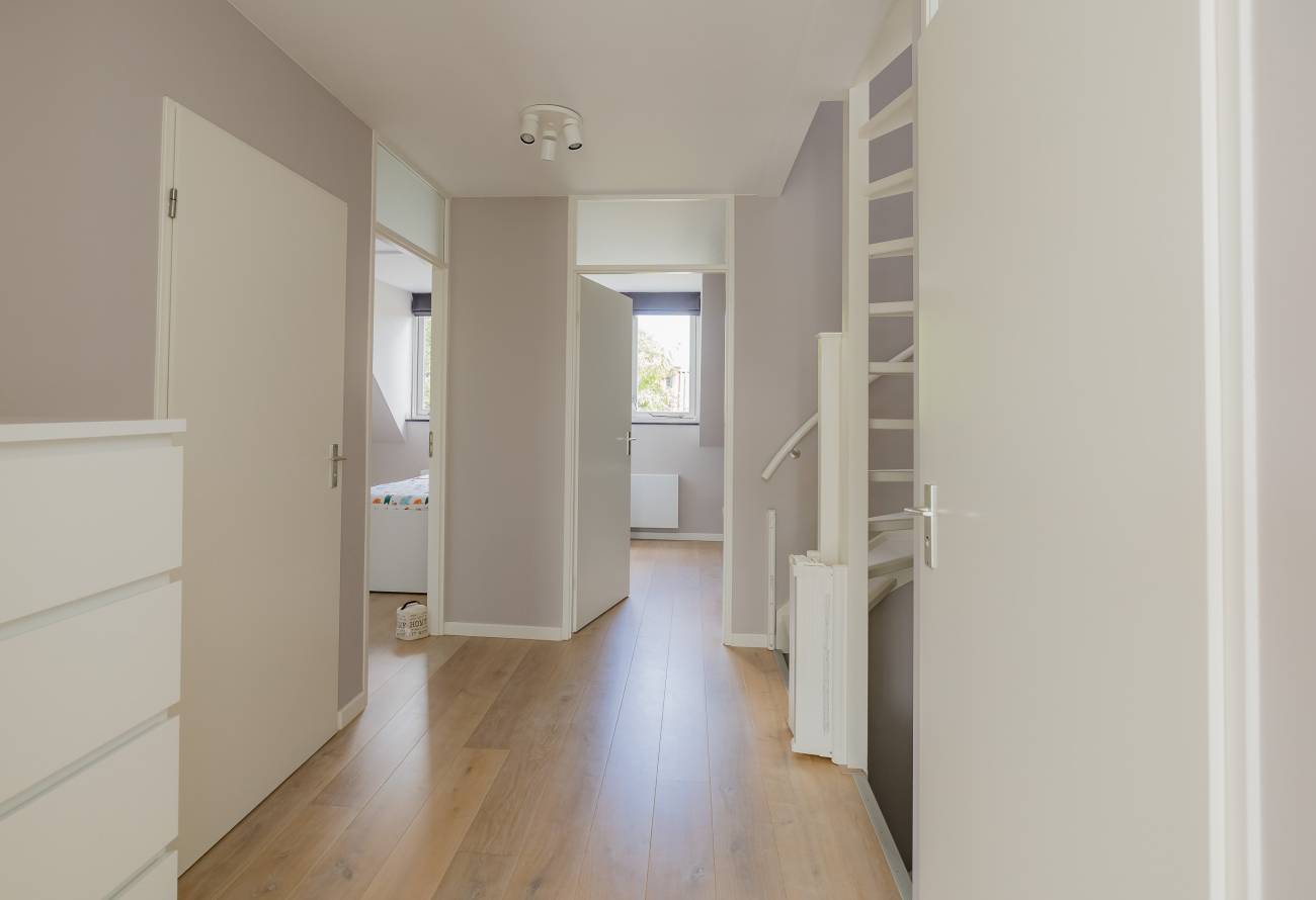Hier vind je een royale zolderslaapkamer met Velux dakraam. Deze ruimte is zo groot dat je hier zelfs twee slaapkamers van kunt maken. Op de overloop is een mooi wandmeubel voor de wasmachine, droger, de cv-installatie en de mechanische ventilatie. Een mooi afgewerkte verdieping.