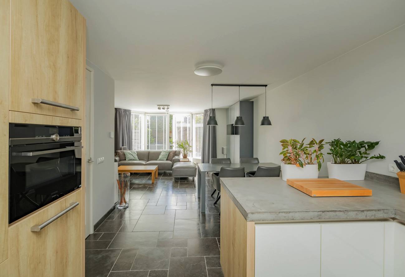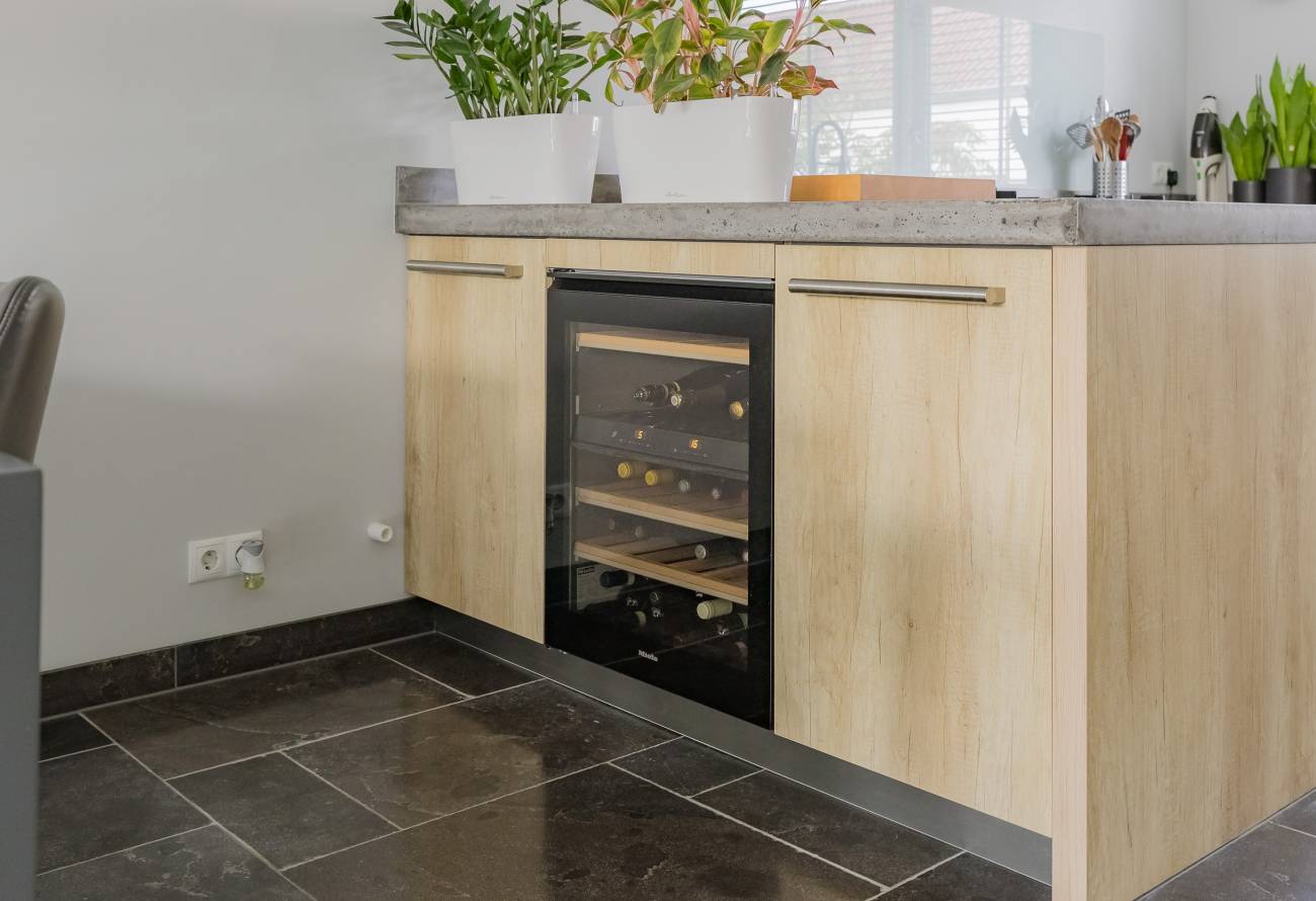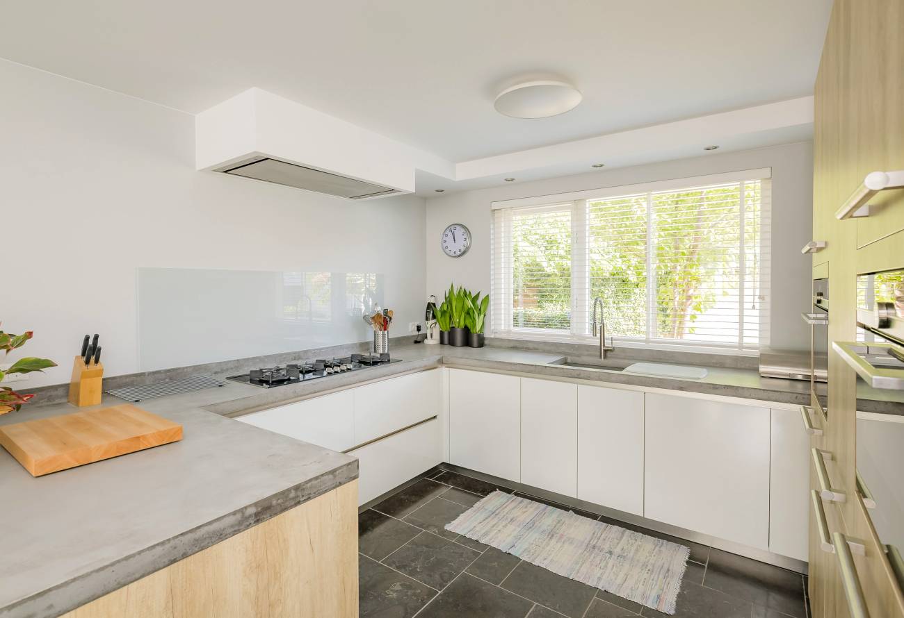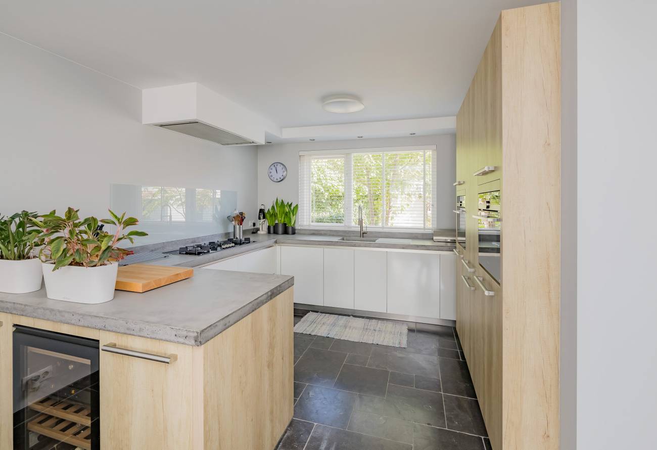 De moderne open keuken is compleet uitgerust met o.a. wijnklimaatkast, een oven, kookplaat, afzuigkap en een vaatwasser. Het heeft een betonnen aanrechtblad.