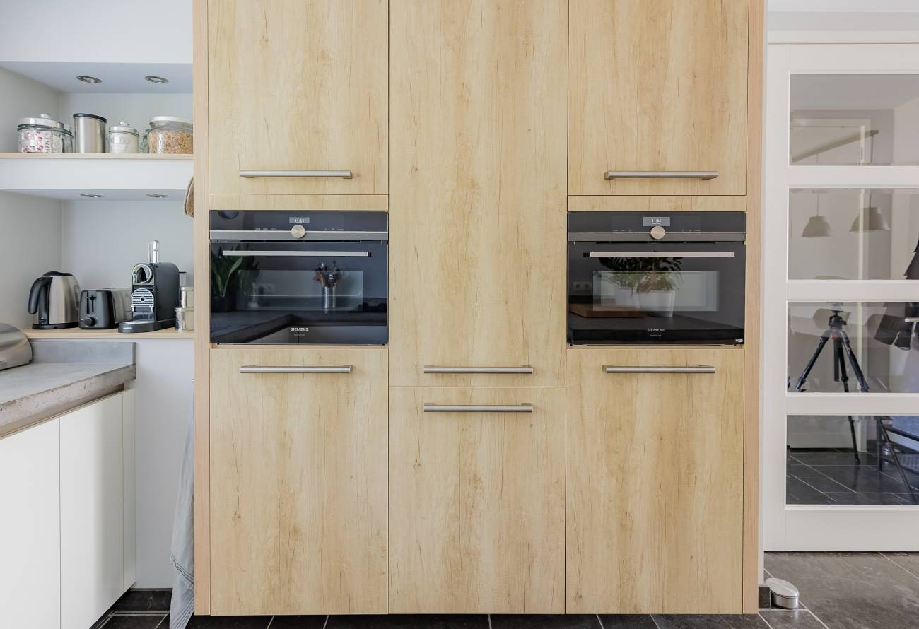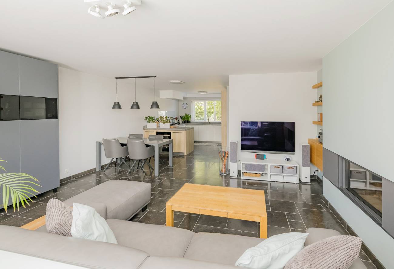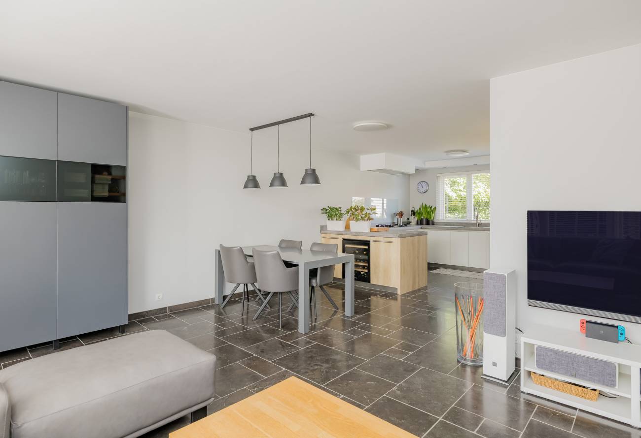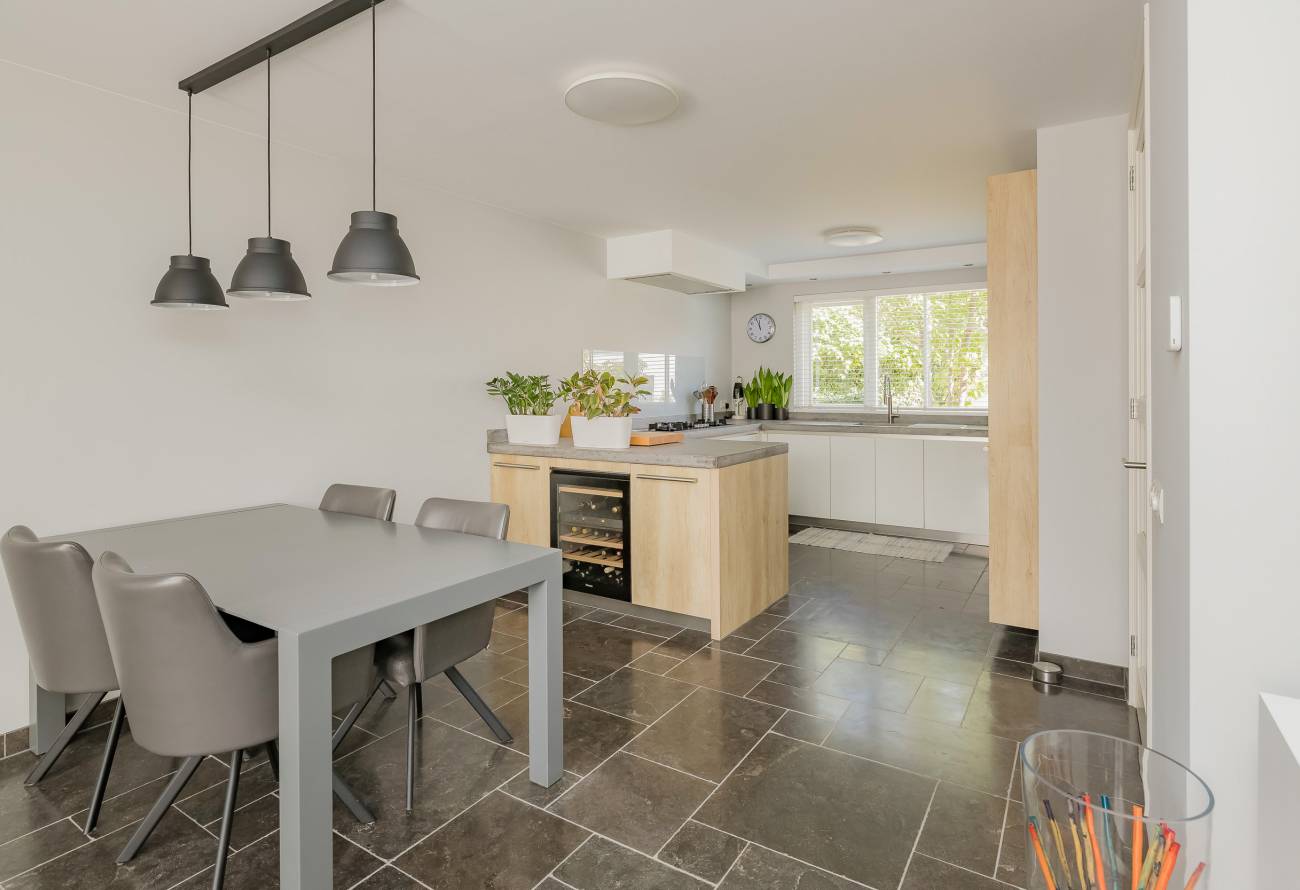 De moderne open keuken is compleet uitgerust met o.a. wijnklimaatkast, een oven, kookplaat, afzuigkap en een vaatwasser. Het heeft een betonnen aanrechtblad.
