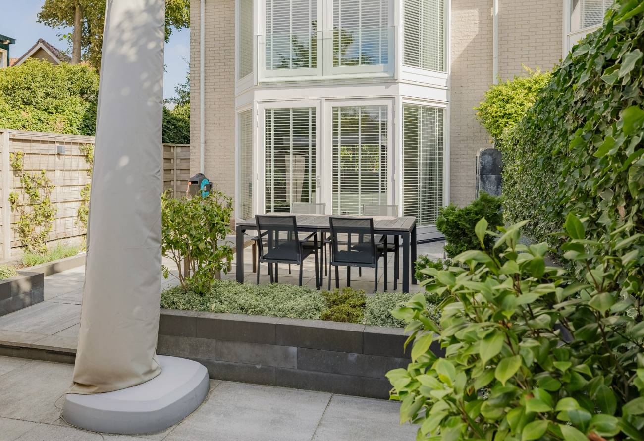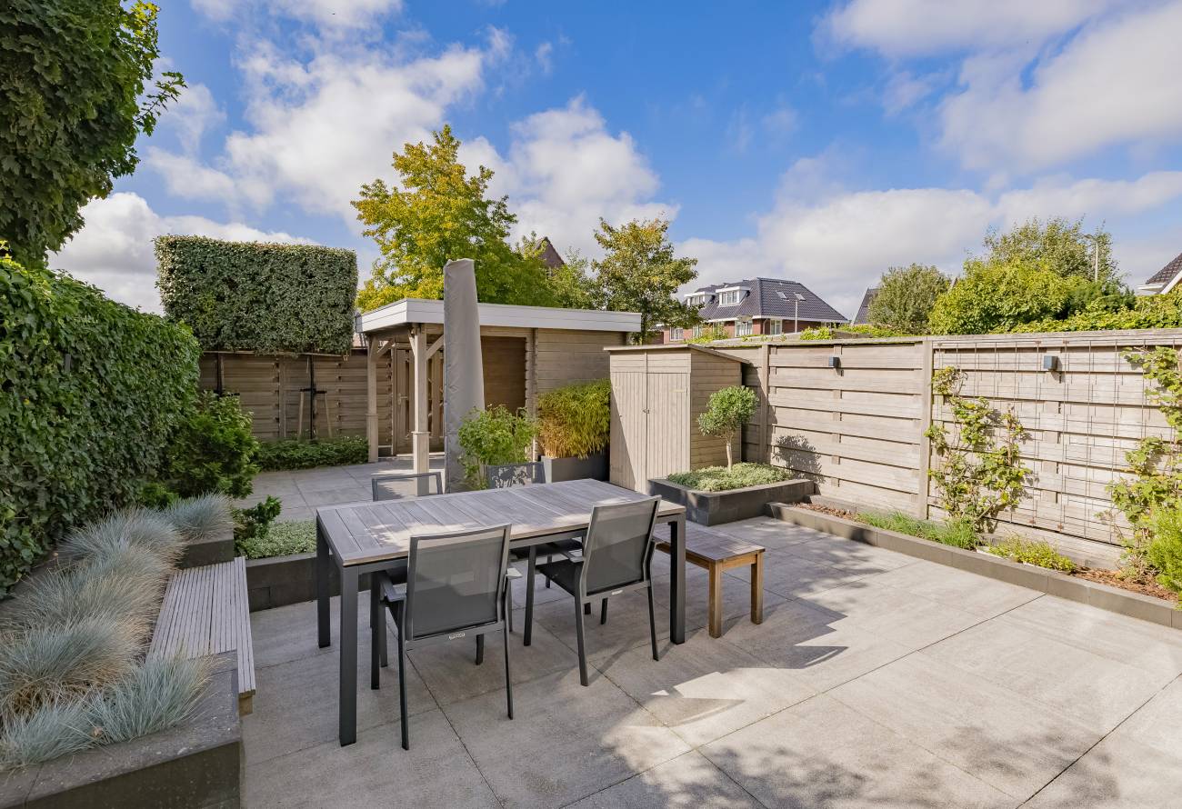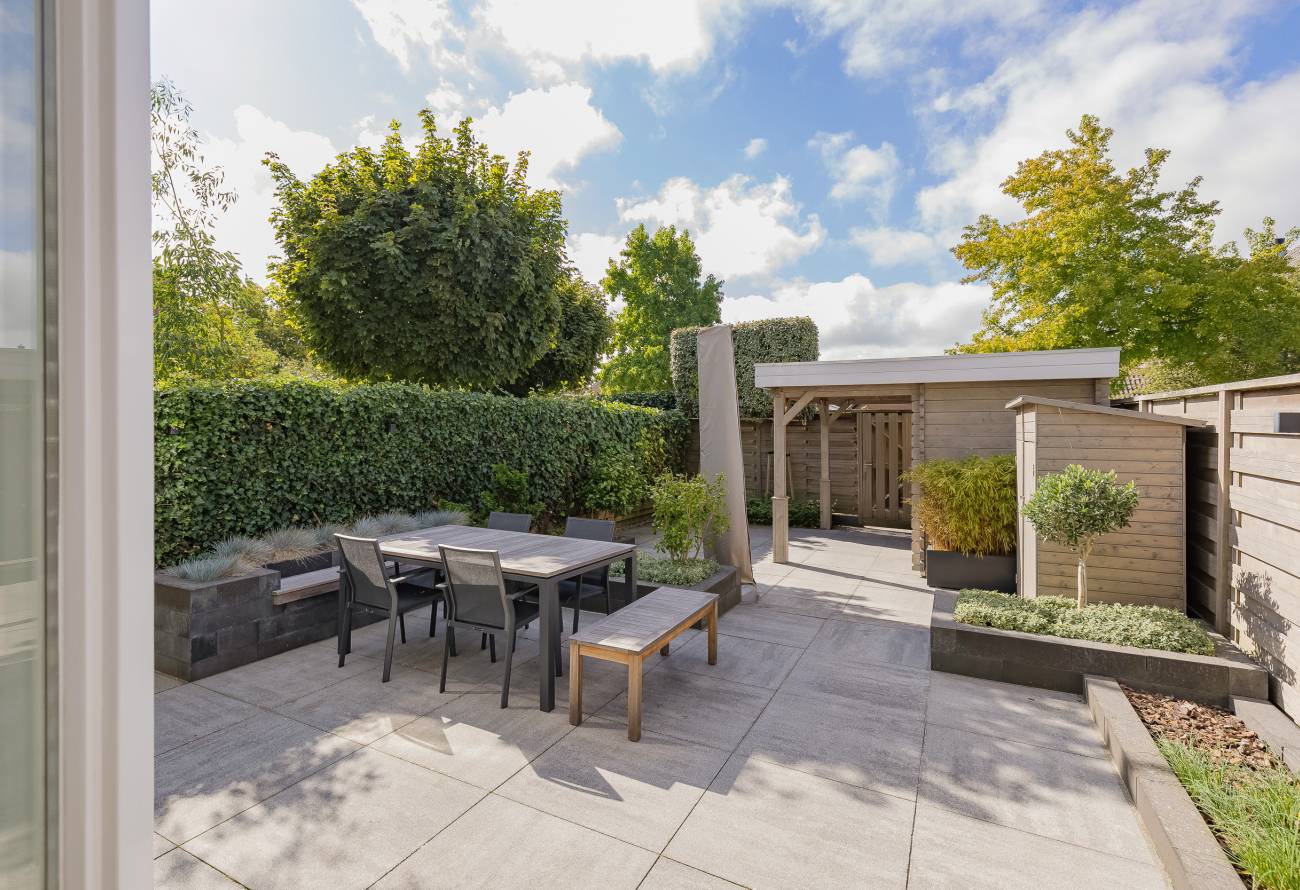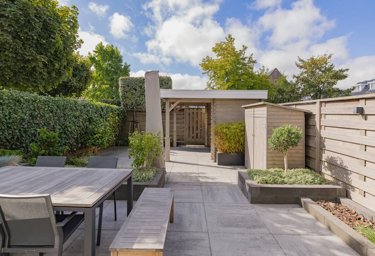 Buiten geniet je van een heerlijke zonnige tuin op het zuiden. De tuin is onderhoudsvriendelijk aangelegd en beschikt achterin over een overkapping voor houtopslag.