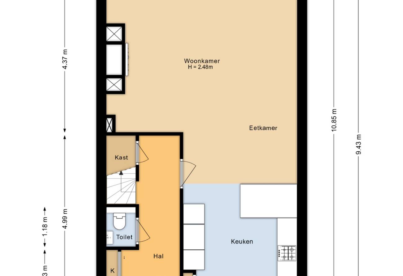 Op de begane grond kom je binnen in een ruime hal met toilet en meterkast. De lichte woonkamer met erker en openslaande deuren. Een heerlijke open haard en vloerverwarming over de gehele begane grond waar het direct warm en goed aanvoelt.