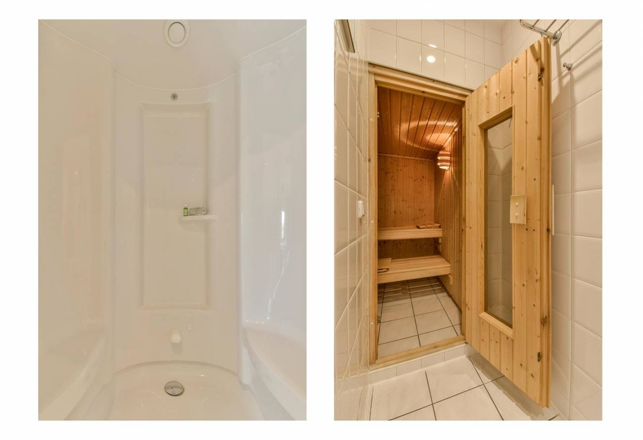 Er zijn verder 2 slaapkamers op de begane grond waarvan 1 ingericht is als gastenkamer met openhaard en toegang tot fraaie wellnesruimte. Deze wellness heeft een heerlijke sauna, een douche en een fraai stoombad.