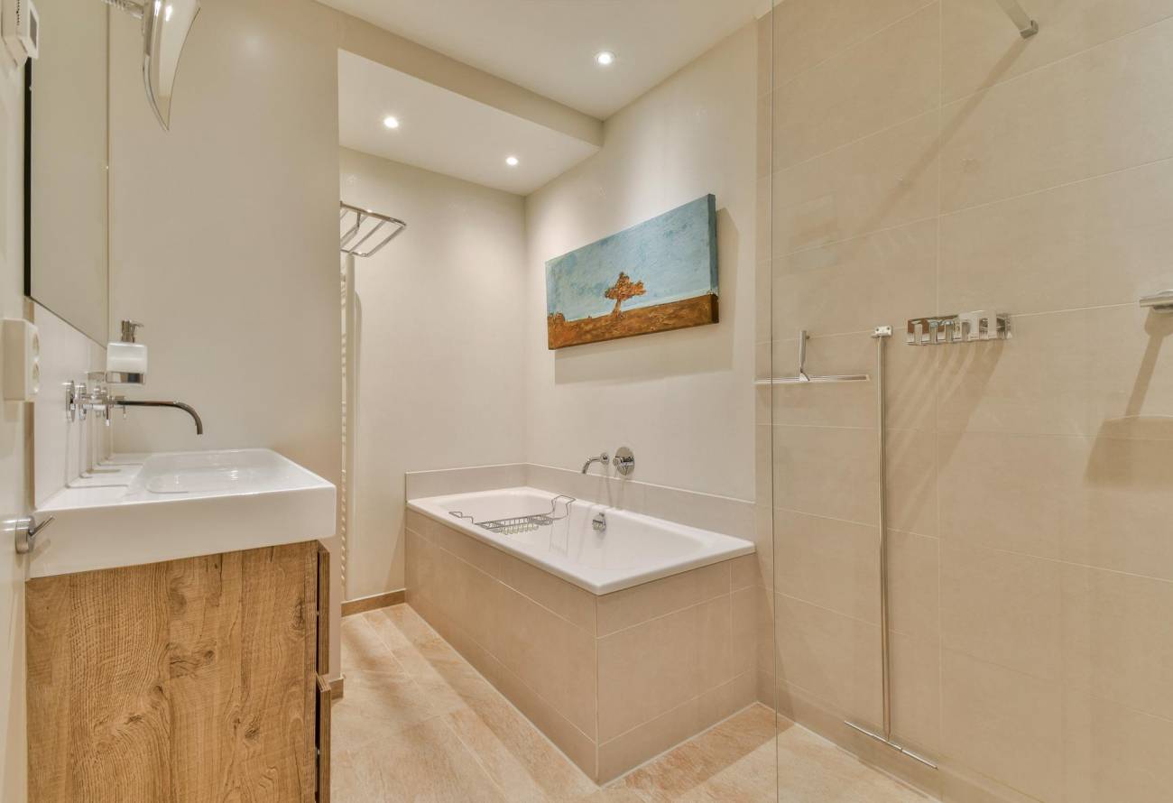 De 2e badkamer is eveneens gelegen op de begane grond en is v.v. een ligbad, dubbele wastafel in meubel en een inloopdouche.