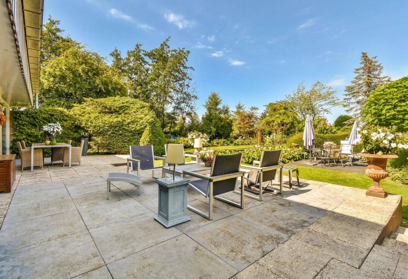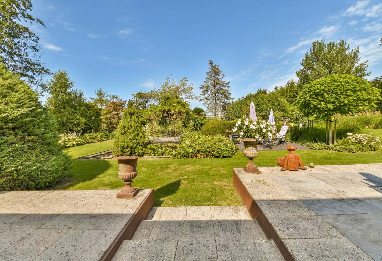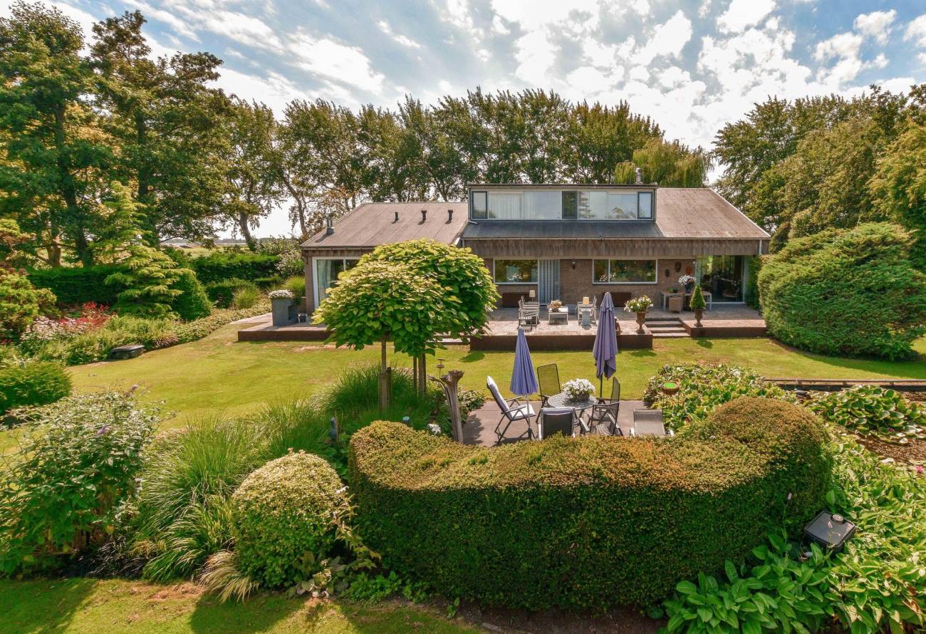 Fraaie aangelegde tuin rondom, met groen gazon, vaste bomen en planten afgewisseld met verhoogd terras aan de voorzijde en in de achtertuin.