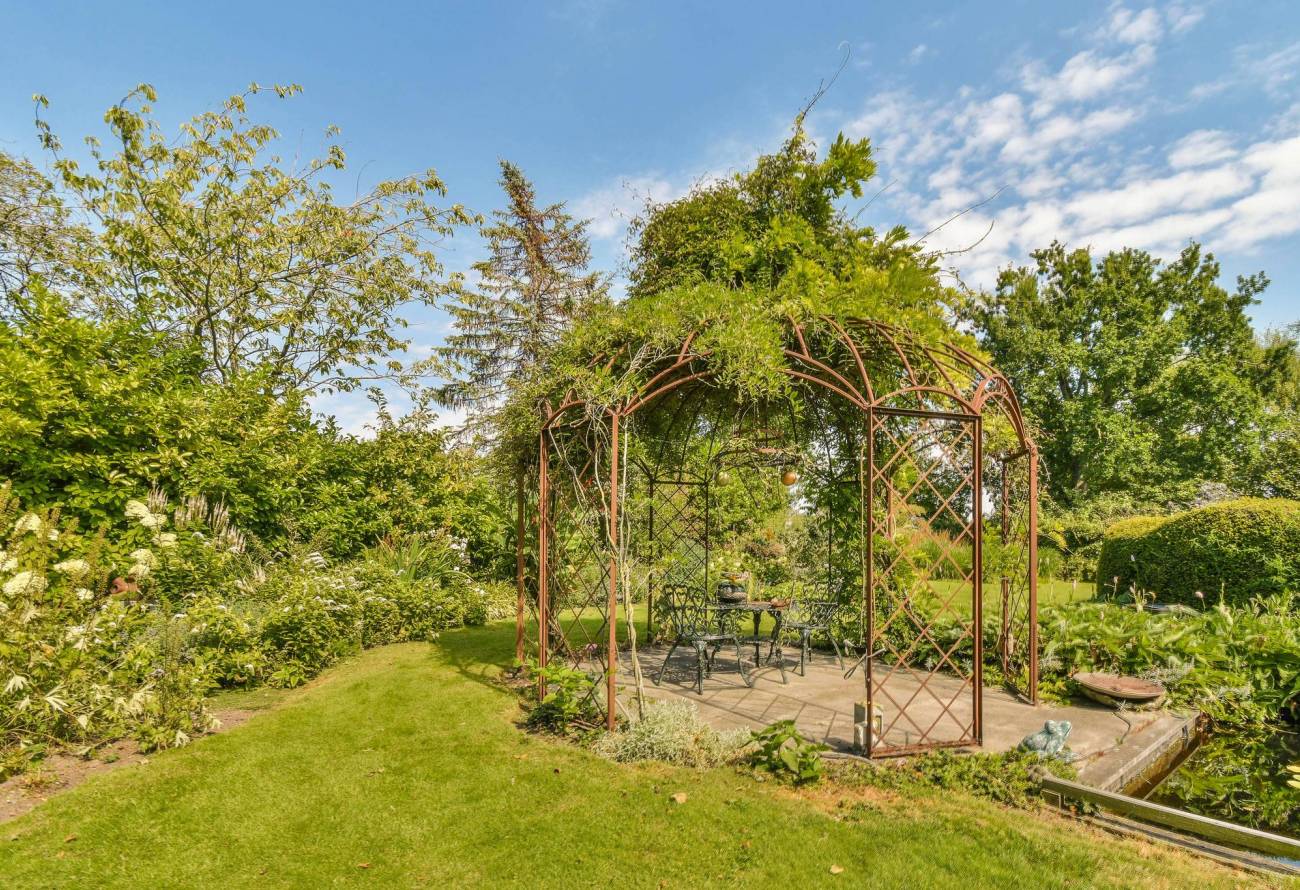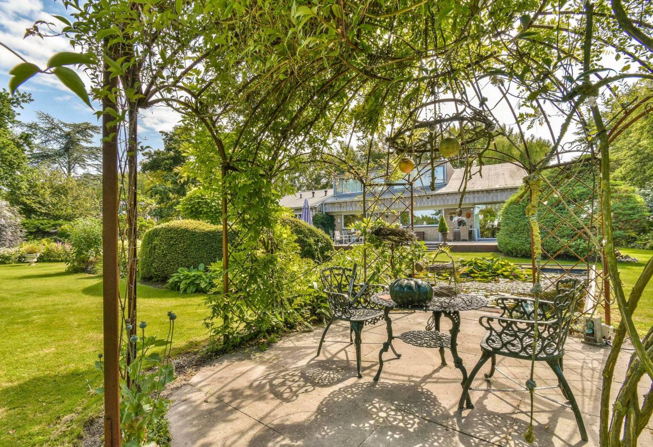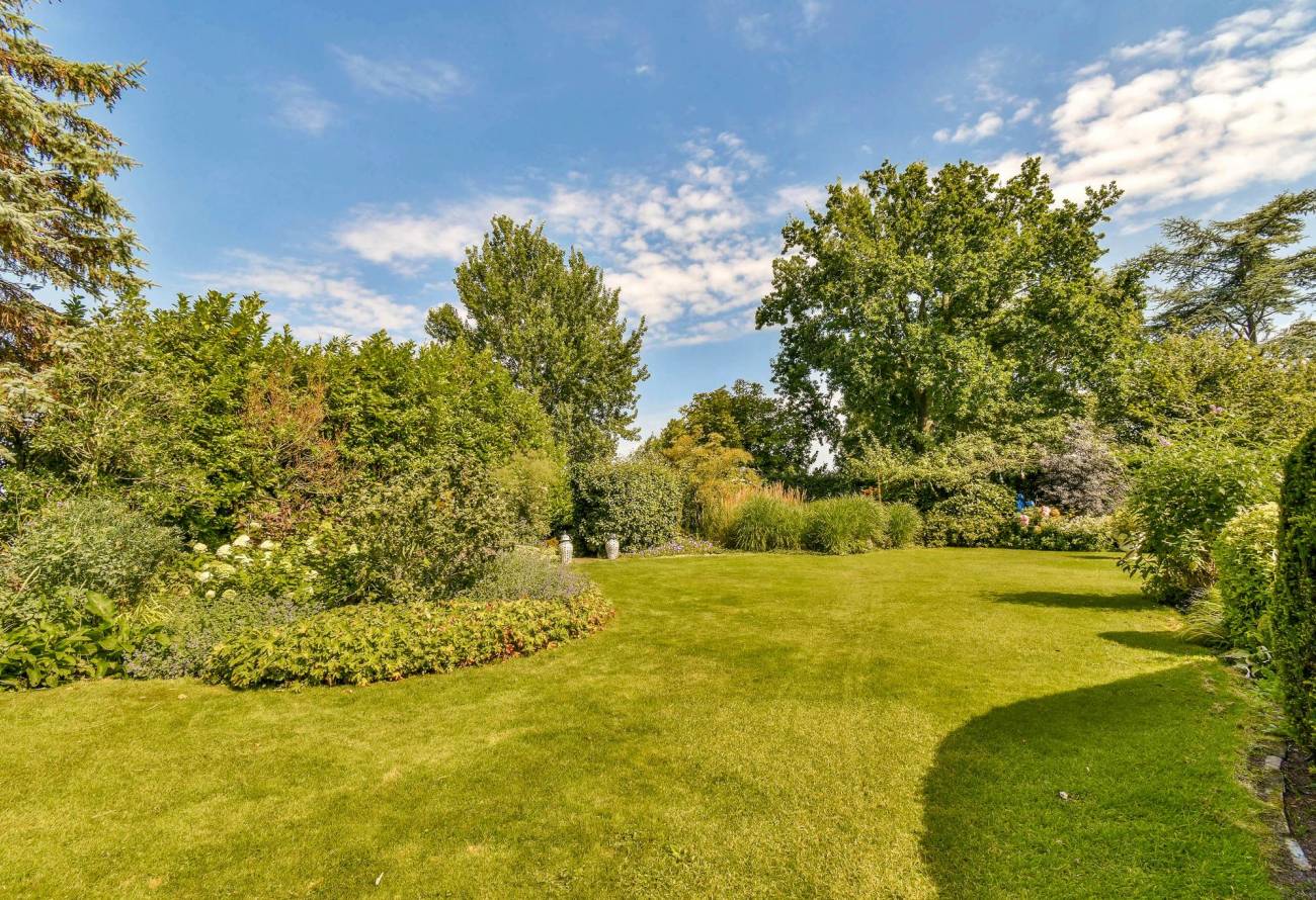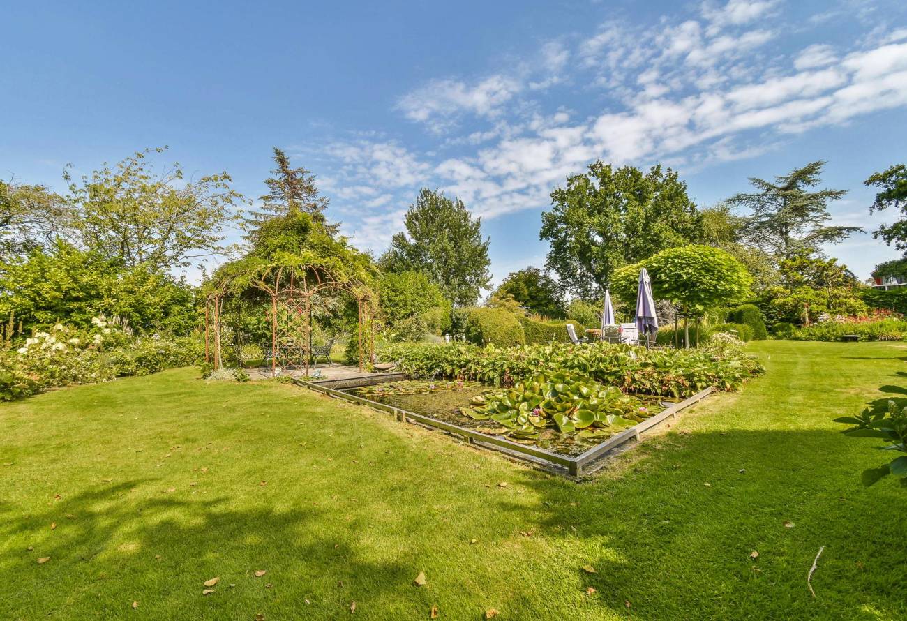 Fraaie aangelegde tuin rondom, met groen gazon, vaste bomen en planten afgewisseld met verhoogd terras aan de voorzijde en in de achtertuin.