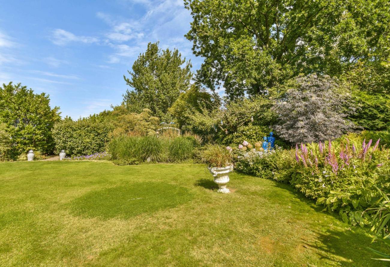 De achtertuin biedt d.m.v. bomen en heg veel privacy en is zeer royaal aangelegd met groen gazon en beelden.