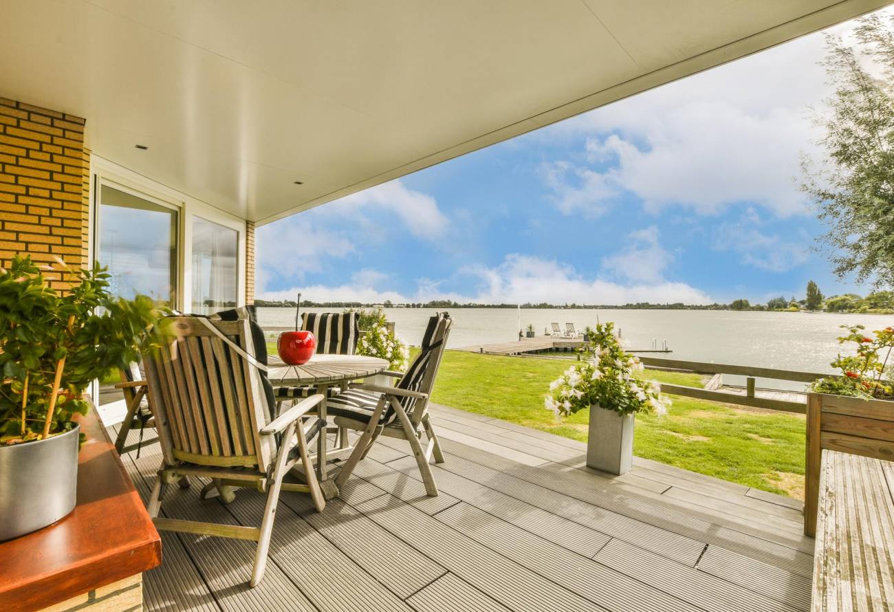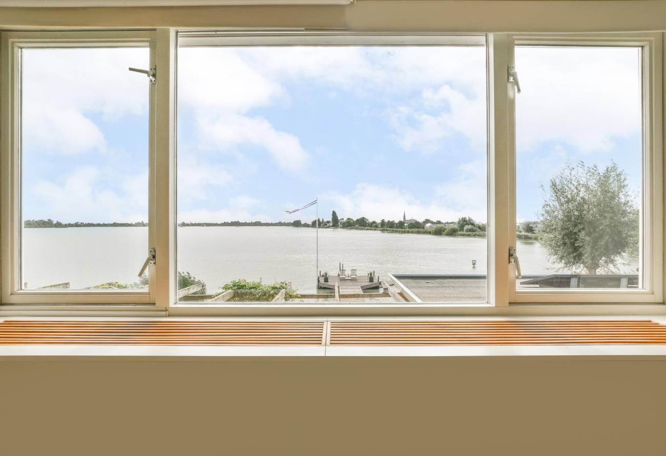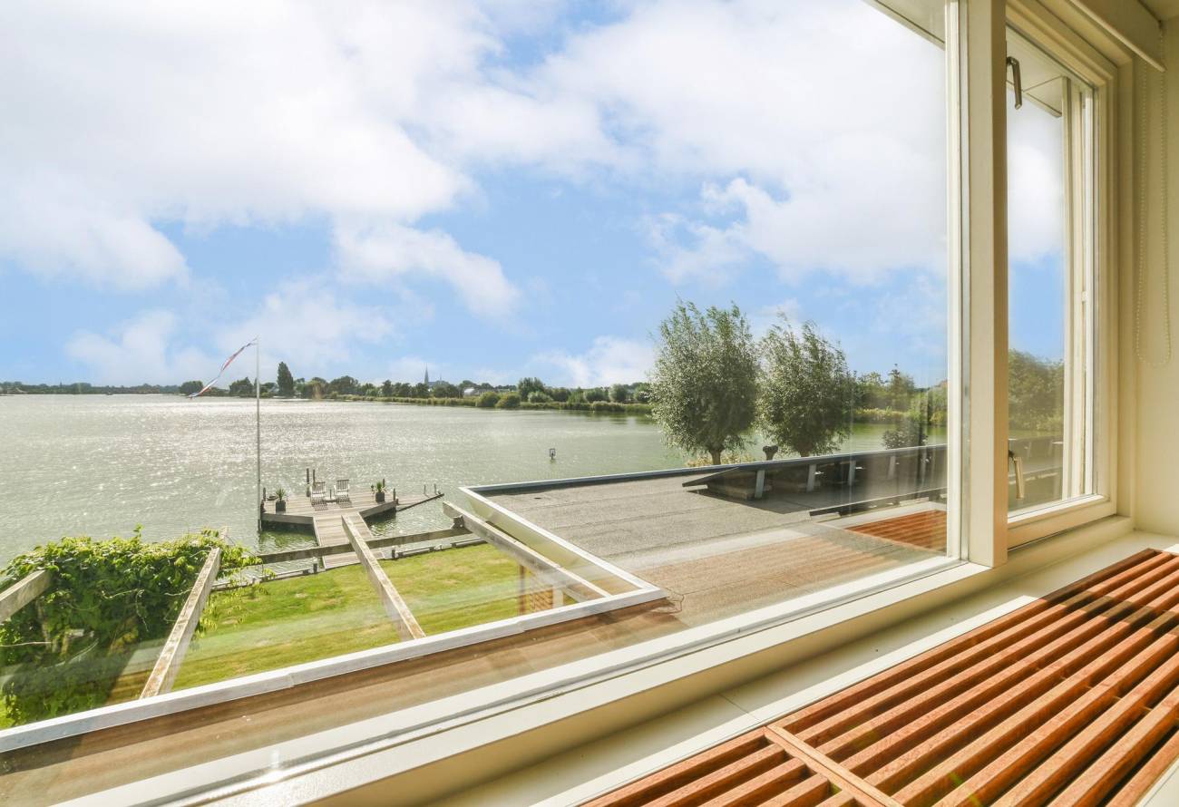 Bijna de gehele achtergevel van de woning is van glas met meerdere schuifpuien naar de terrassen en de tuin. Hierdoor is er vanuit elke ruimte een geweldig uitzicht over het water.