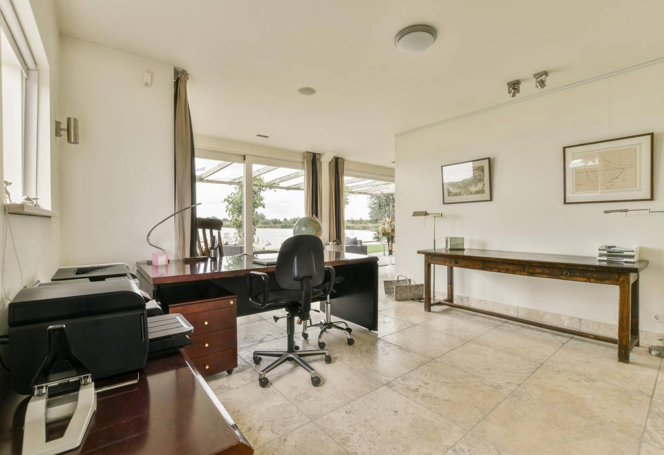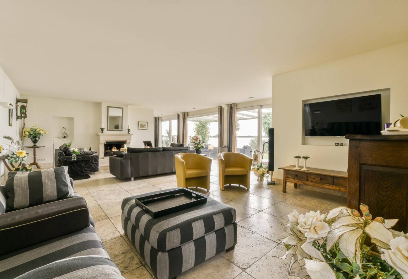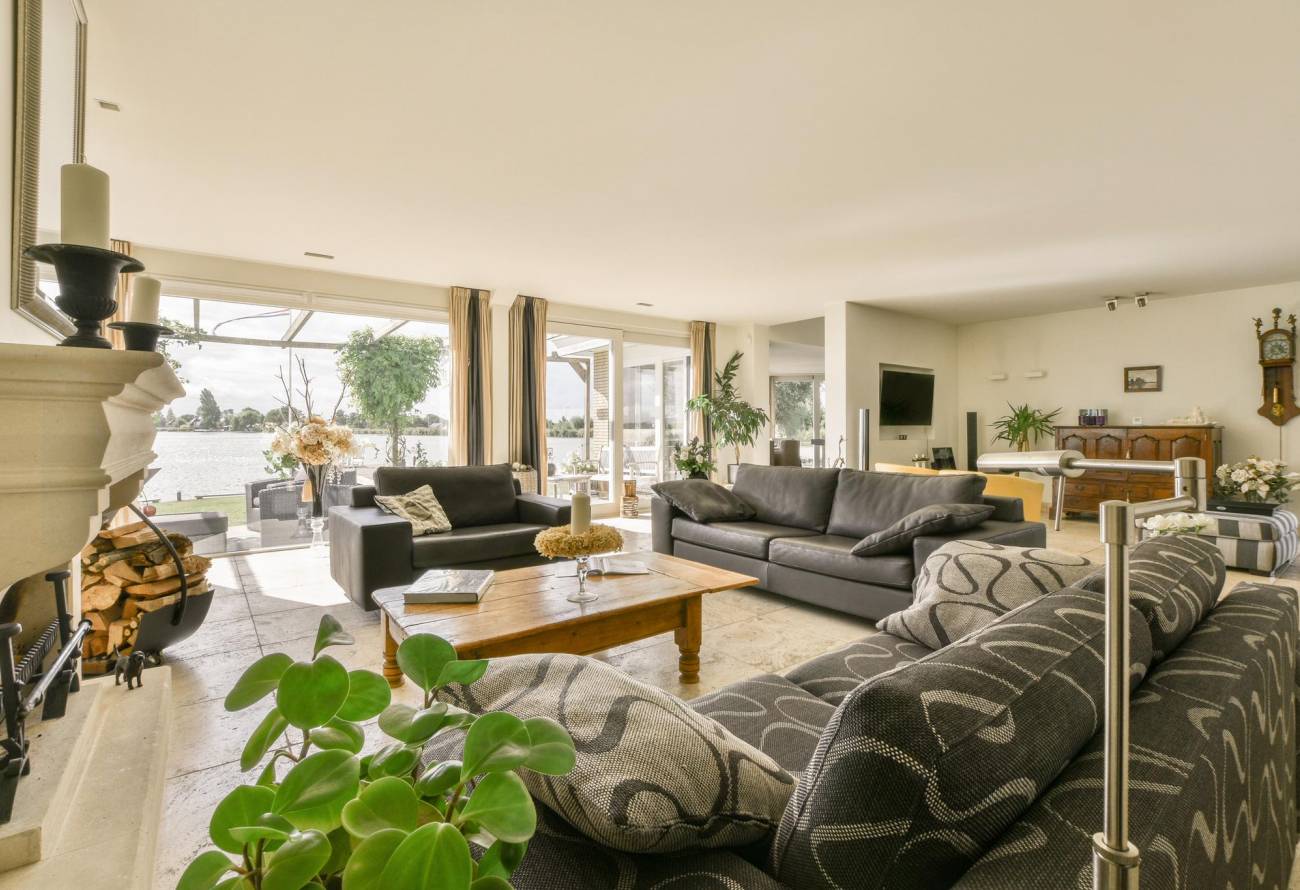 Bijna de gehele achtergevel van de woning is van glas met meerdere schuifpuien naar de terrassen en de tuin. Hierdoor is er vanuit elke ruimte een geweldig uitzicht over het water.