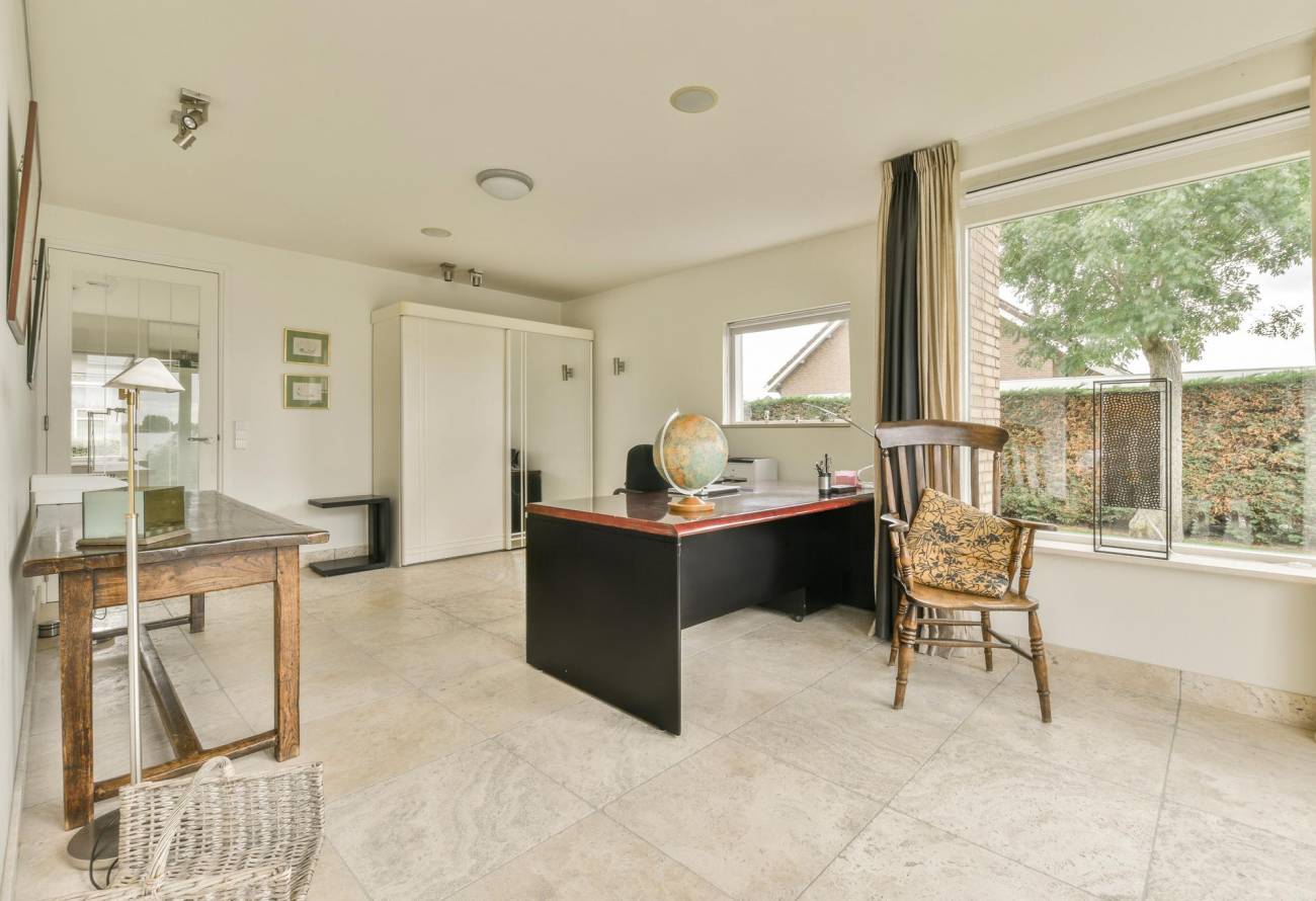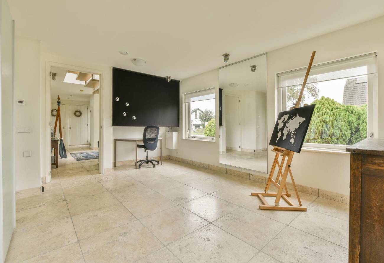 Vanuit de hal is er toegang tot de woonkamer en een vertrek dat thans in gebruik is als atelier/kantoor.