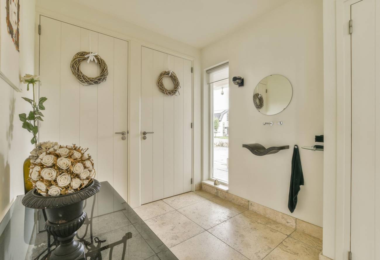 Op de royale oprit is er mogelijkheid voor het parkeren van meerdere auto. Door de deelbare voordeur komt men in de ruime hal met moderne meterkast, open trap naar de verdieping, een dubbele toiletruimte en een fonteintje.